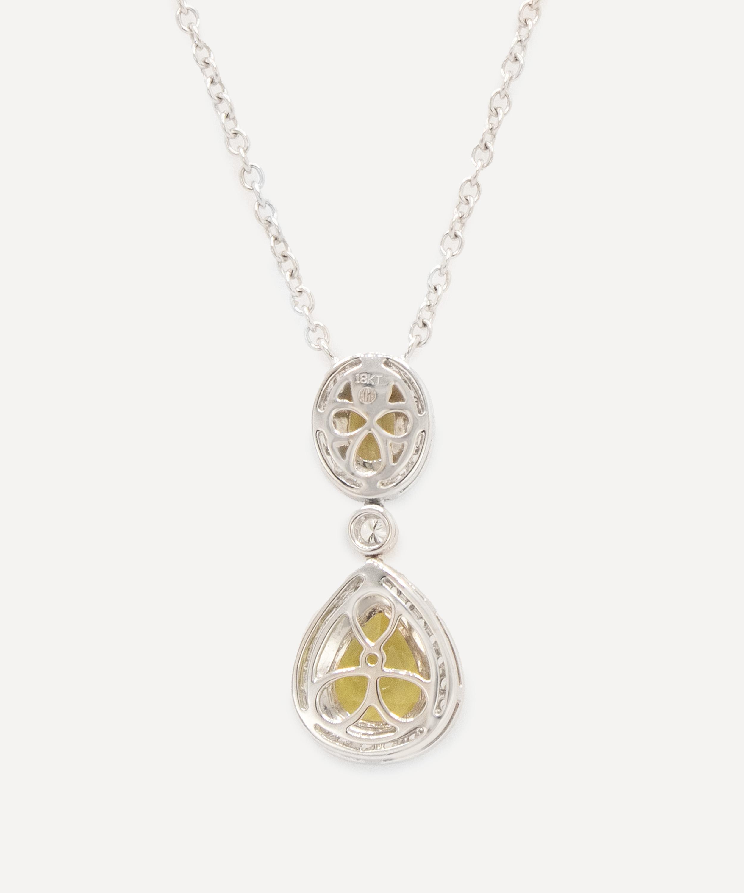 Rendered in 18ct white gold, it features a fine link chain and two pear-shaped and oval checkerboard-faceted lemon quartz stones, complimented by round brilliant cut diamonds. Whether worn as a statement of refinement or a whisper of vintage charm, it will steal the spotlight and elevate every ensemble with its undeniable presence.
