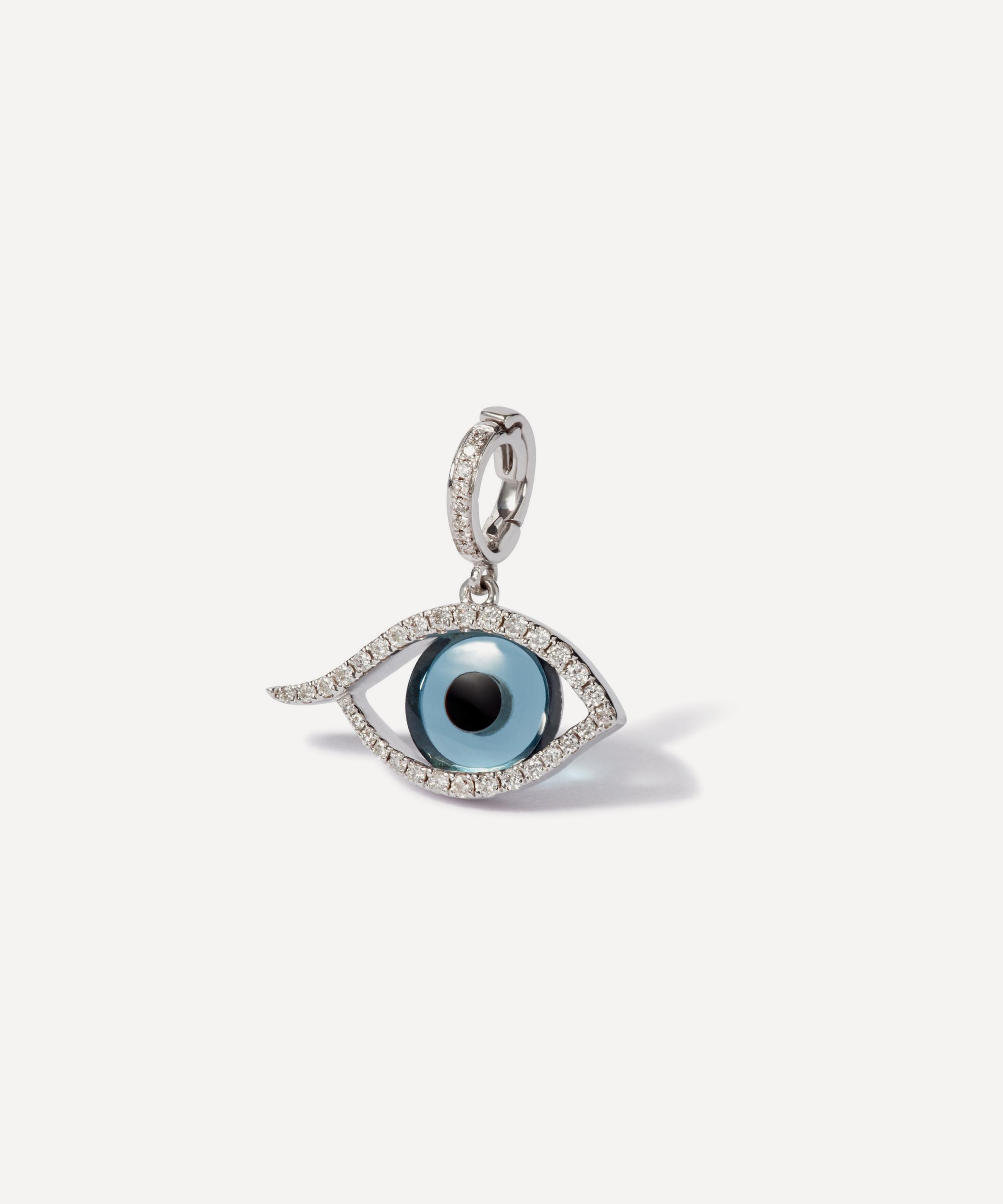 Handcrafted from 18ct white gold, this playful piece depicts an evil eye – a symbol of protection and shield against evil forces. Made up of sparkling diamonds, London blue topaz and black onyx, it’s finished with a diamond encrusted bail clasp that can be attached to any of the brand’s 14ct and 18ct gold chains.