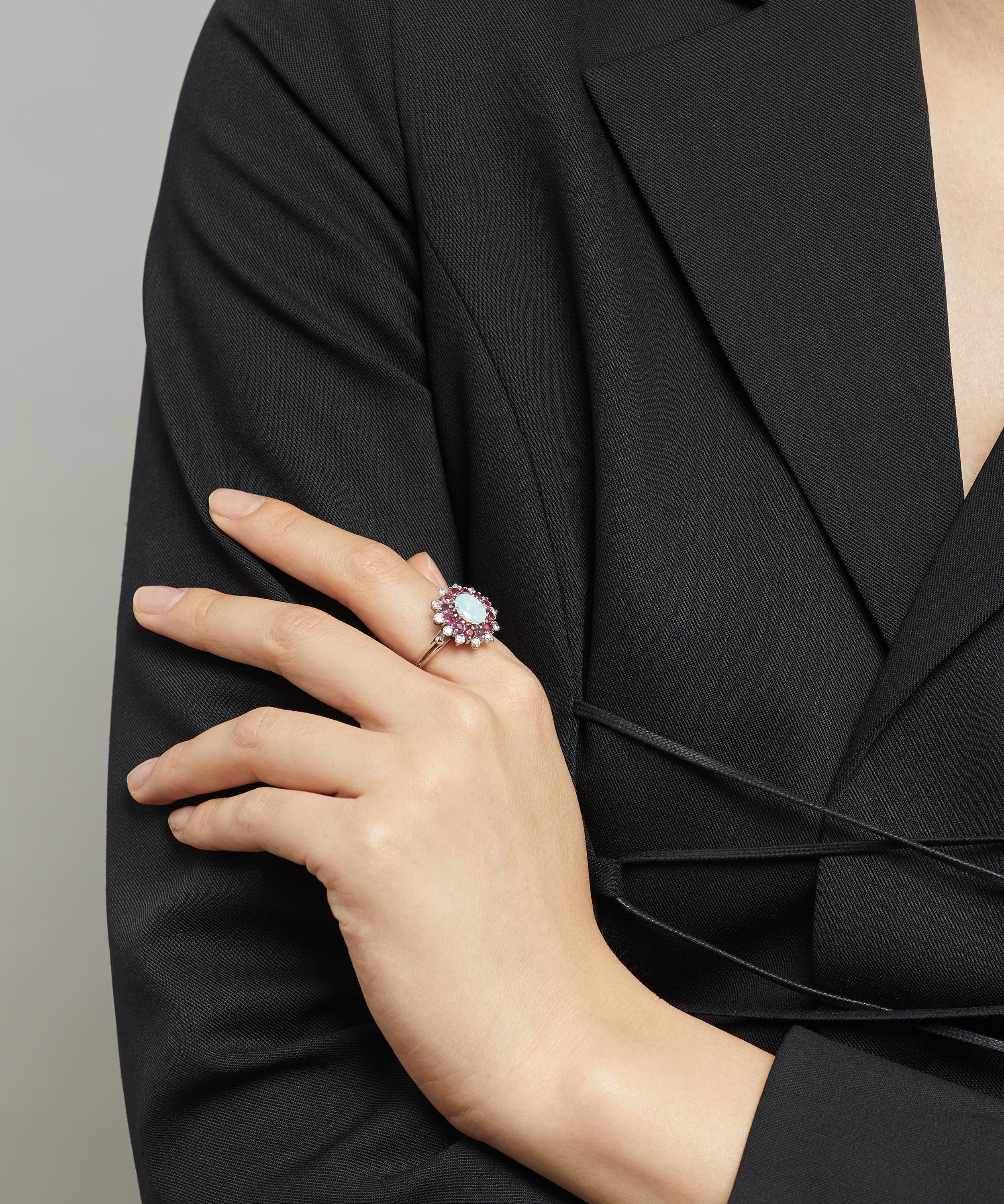 Crafted from 18ct white gold, this cocktail ring features an oval cabochon-cut opal, enclosed by an inner circle of rubies and a twelve-claw diamond setting on the outer edge. Composing an illustrious mix of gemstones, the slight pink and red tones found in the opal are wonderfully complimented by the ruby cluster. The ring is complete with a white gold bead, sitting between split shoulders that lead into a converged band. Wear this sparkling wonder on its own or pair it with several other cocktail rings for breath-taking curation of hand candy.