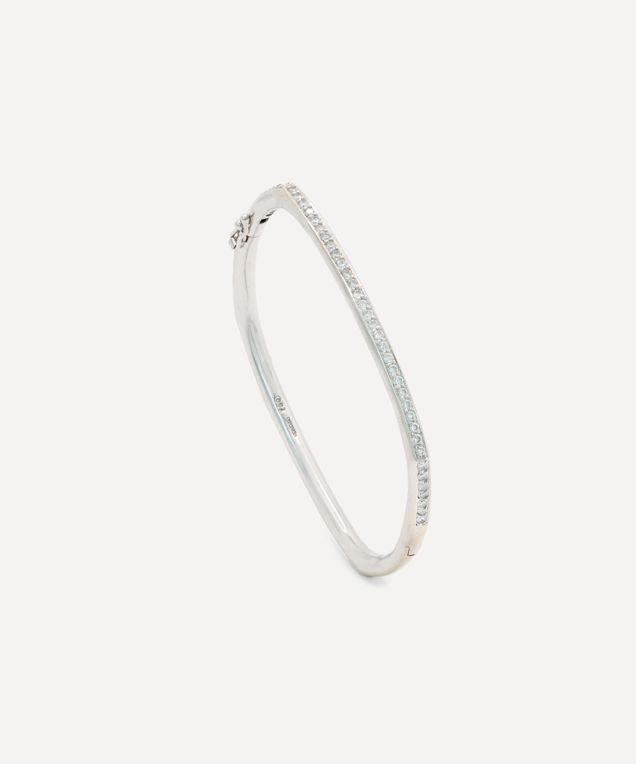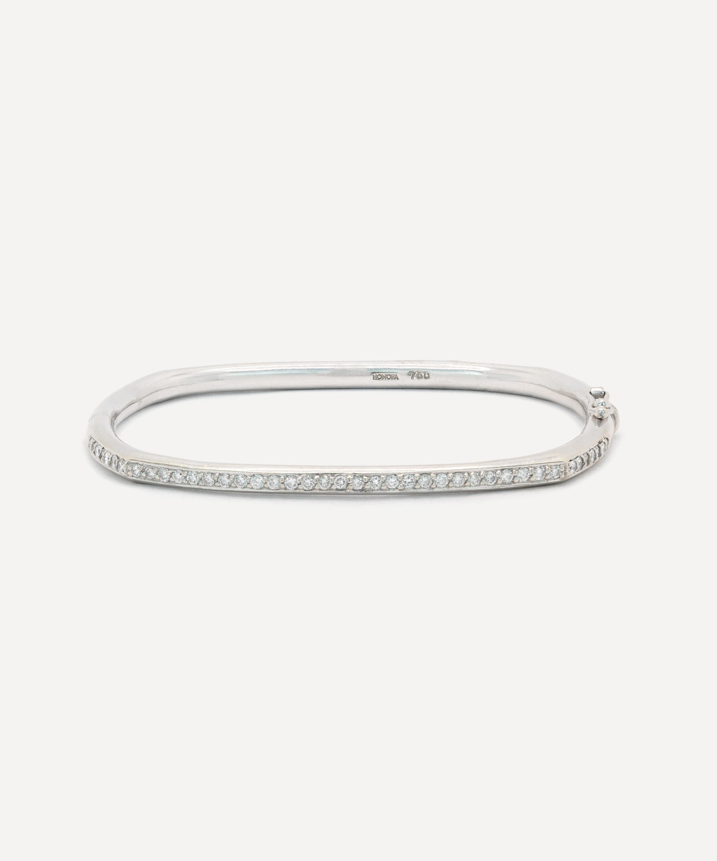 Build an eye-catching wrist stack with this vintage bangle bracelet from antique purveyor Kojis. Crafted from 18ct white gold, it features a sleek, square-shaped silhouette embellished with forty-one round, brilliant cut diamonds, grain set into the front and slightly down the sides of the bangle.