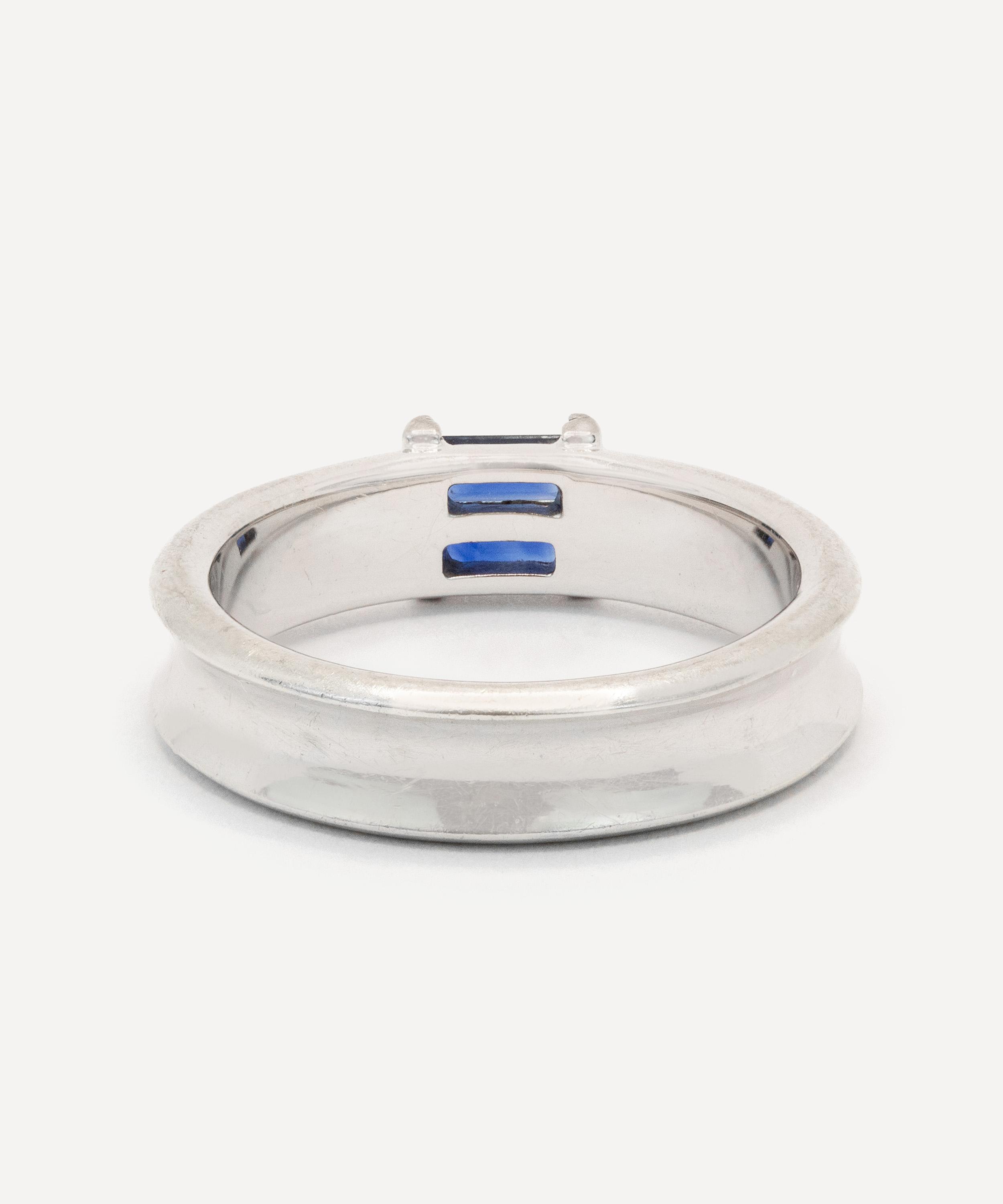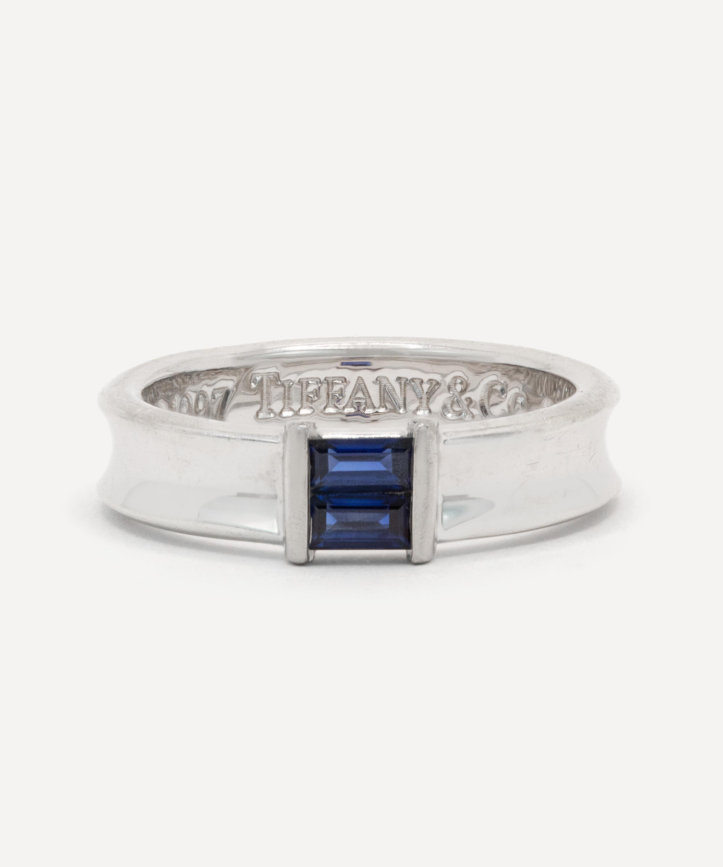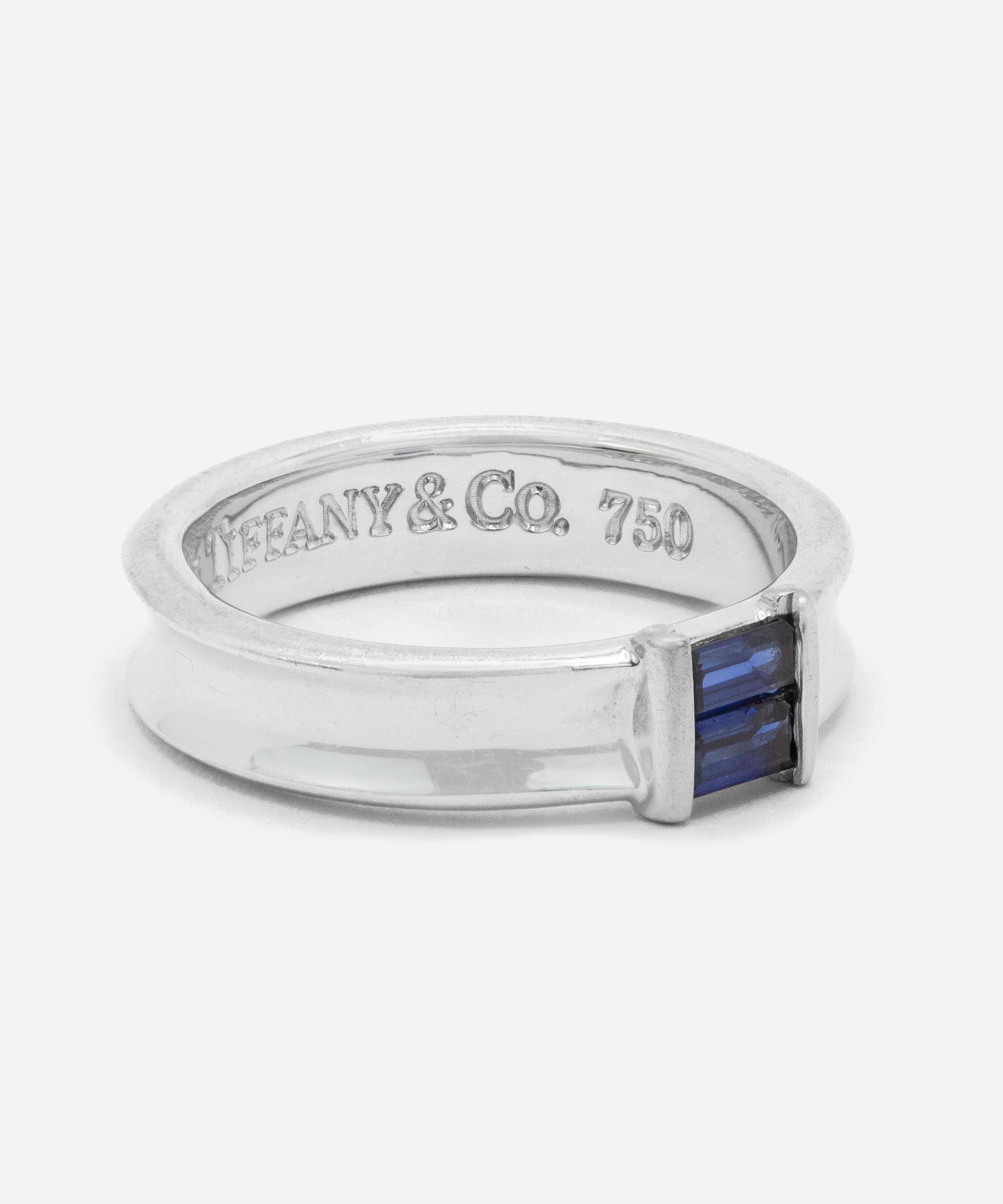 Meticulously crafted from 18ct white gold, it features two baguette cut sapphires tension set east-west into a polished concave band, creating a clean architectural line that blends Tiffany’s timeless minimalism with a bold twist of colour. Whether worn as a statement of refinement or a whisper of vintage charm, this ring will steal the spotlight and elevate every ensemble with its undeniable presence.