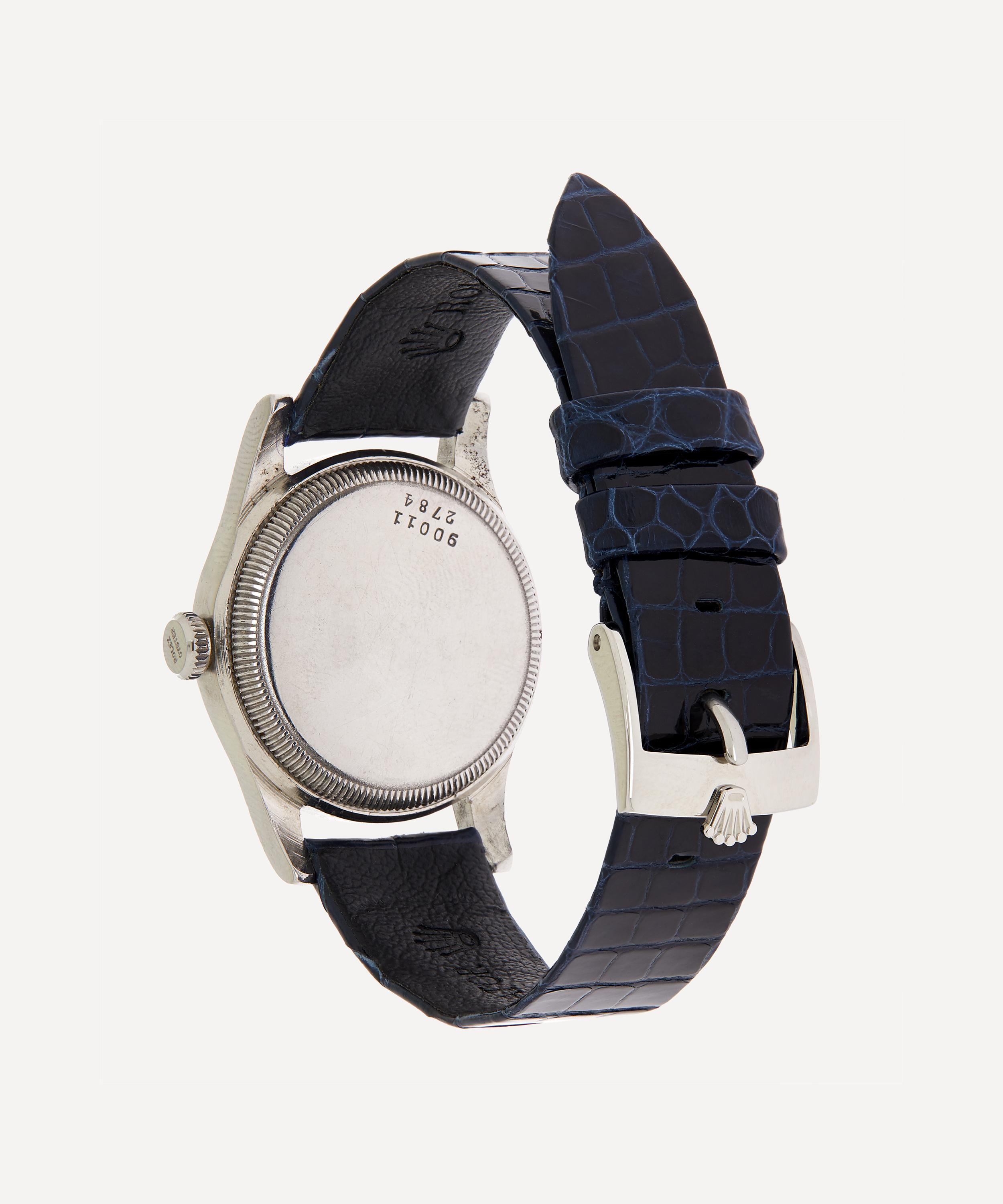 Crafted from white metal with a midnight blue alligator leather strap, this daily wind watch has 15 rubies in its mechanism to reduce friction and wear for longer-lasting quality. Presented in a cushioned circular case with a gently convex crystal front, it features an oyster dial with metallic blue pencil hands, Arabic numerals and a smaller seconds dial at six o'clock. Complete with the Rolex Oyster Junior Sport authenticity script and registration number, this highly collectable piece is guaranteed to become a much-admired heirloom that can be passed from generation to generation for many years to come.