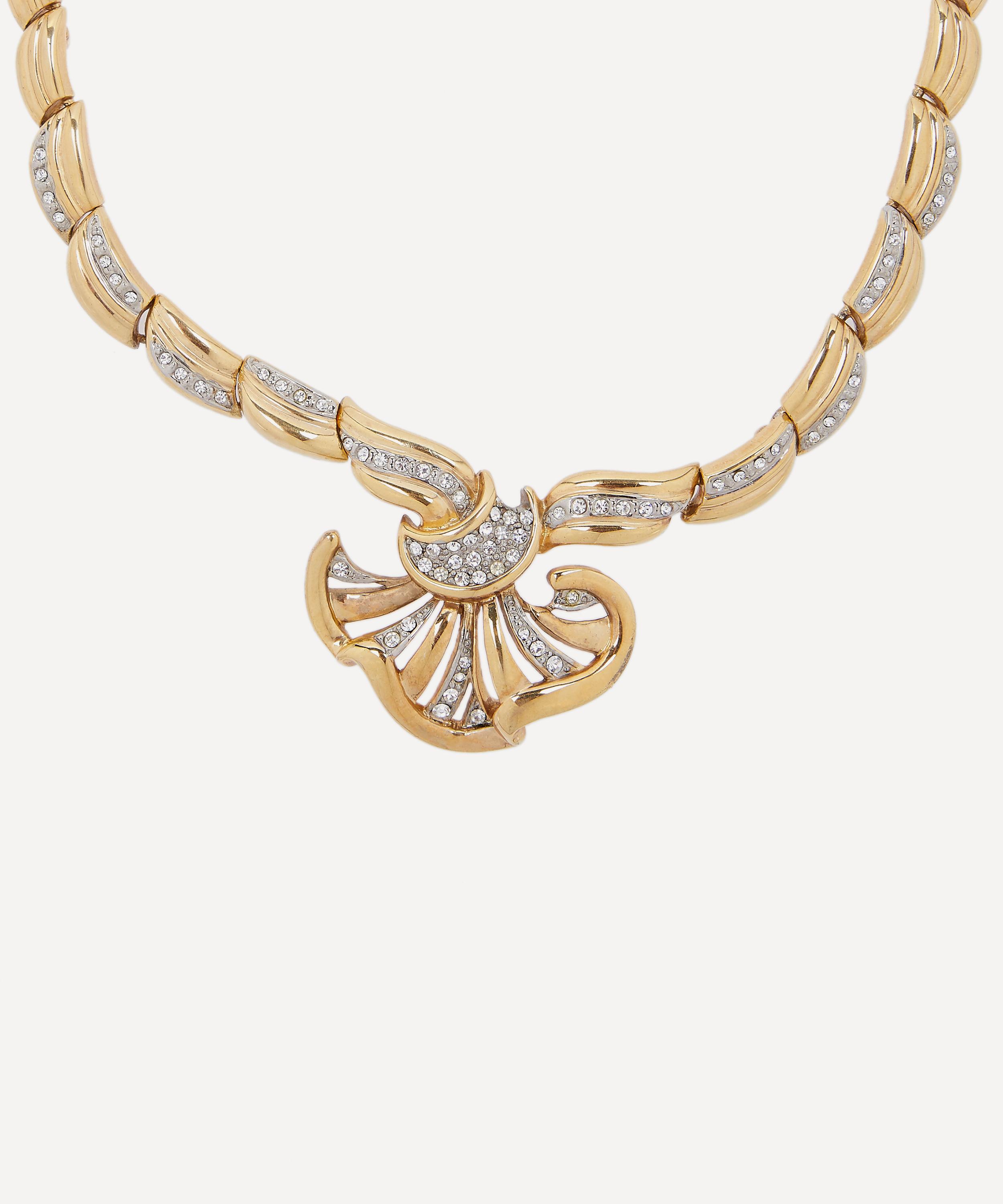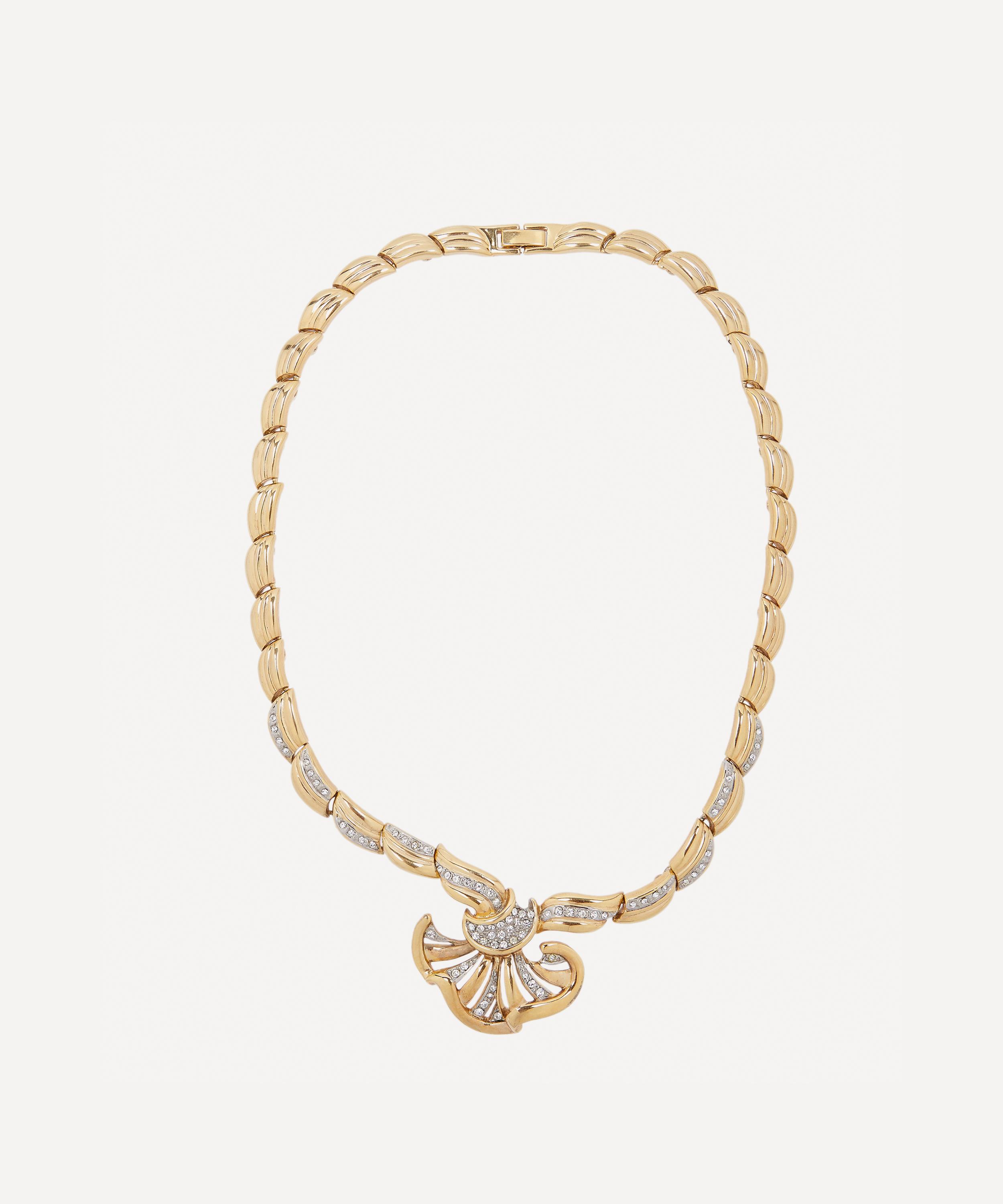Crafted from polished gilt metal, this vintage necklace dates back to the late 1950s. The distinctive design is formed of a string of graduating, ribbed links with a sculptural, serenading ribbon pendant and a dazzling faux diamond pavé. Complete with a concealed clasp fastening, this piece styles beautifully against a bare décolletage or layered with several other vintage chains for an offbeat, contemporary finish.