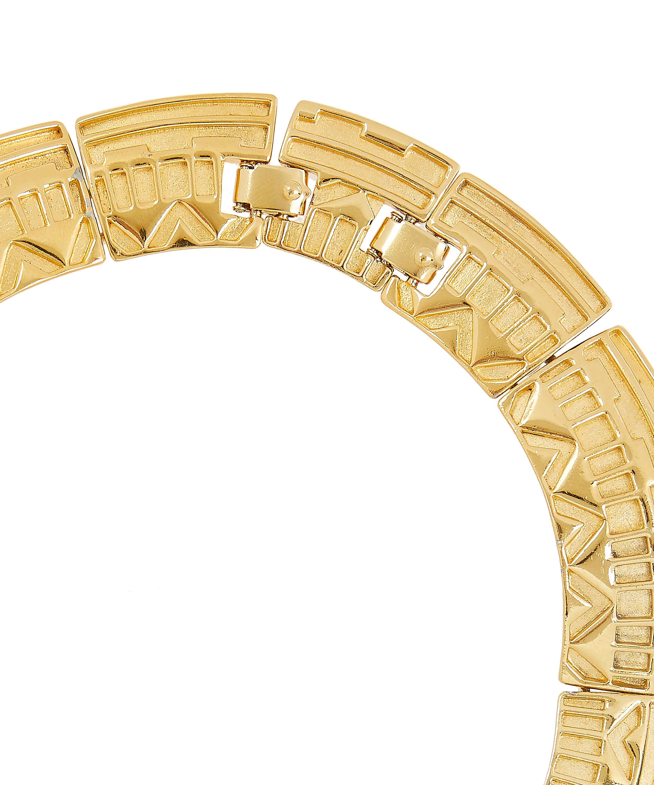 Crafted in the USA from polished gilt metal, this vintage Monet necklace dates back to the late 1960s. A subtly flexible string of chunky, gently convex links is imprinted with an assortment of geometric shapes, enhanced by a contrasting brushed finish. Complete with the Monet authenticity scripts and the design’s original, optional additional link, this piece styles beautifully against a bare décolletage – try it with a square neckline for a considered geometric contrast.
