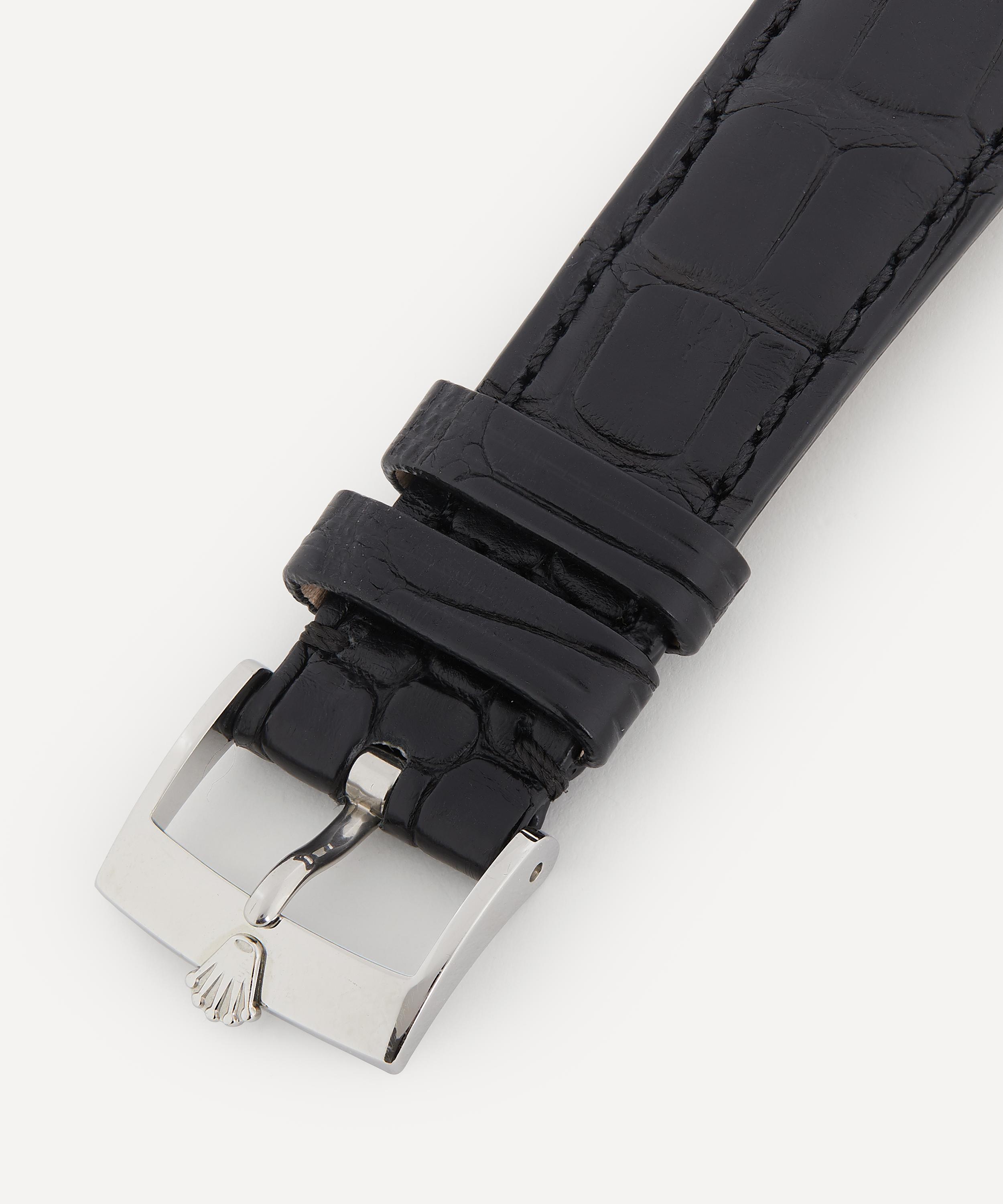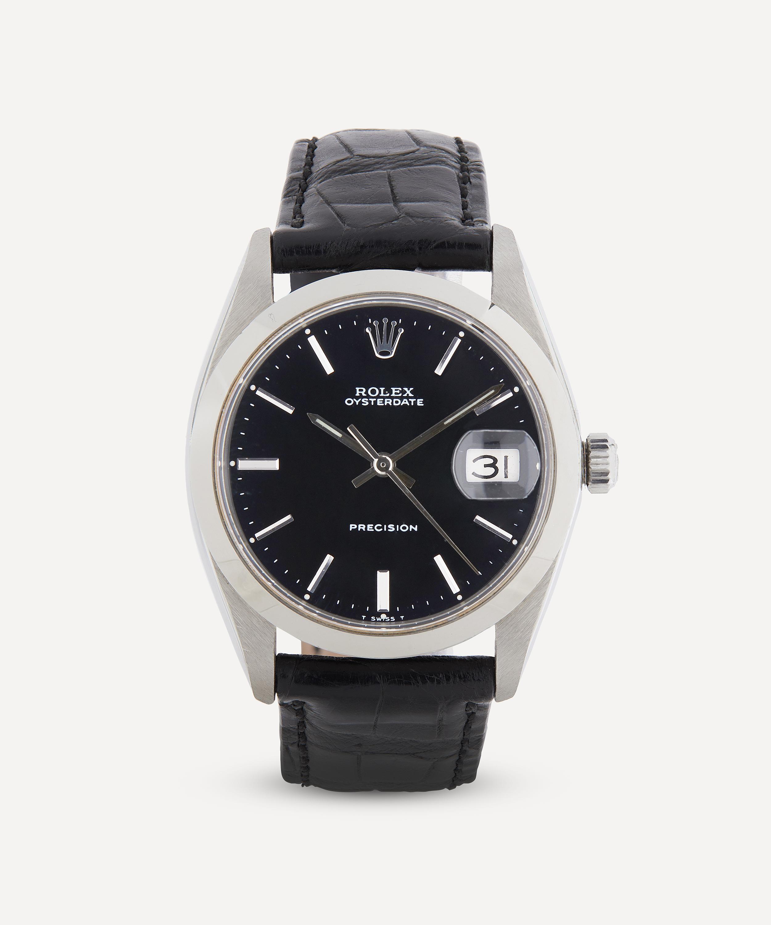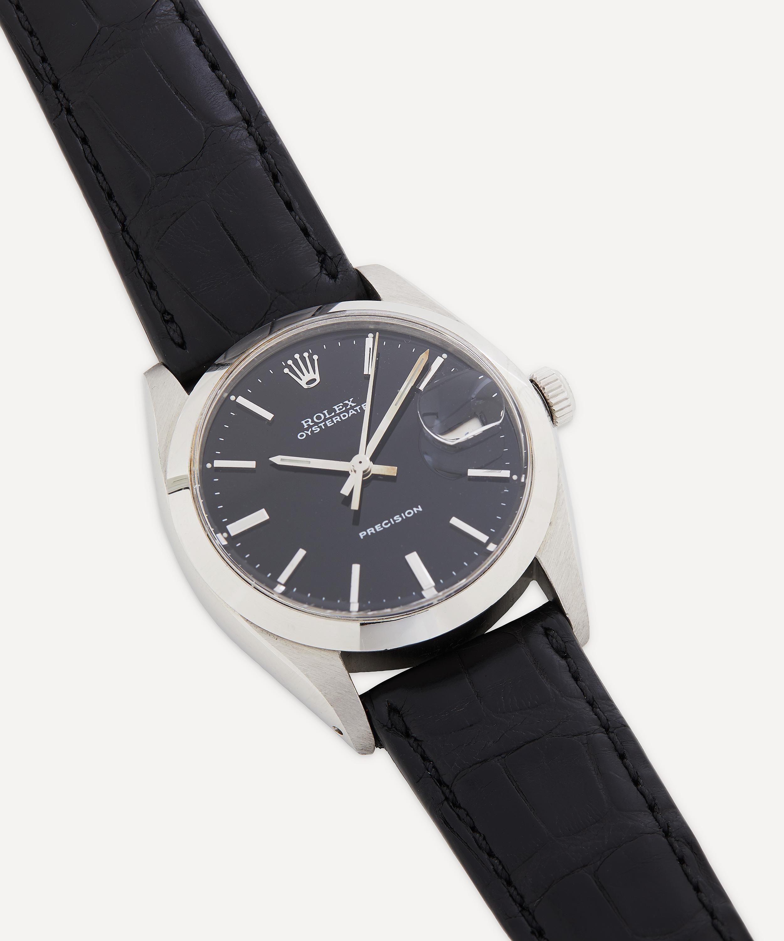 Crafted in polished metal, this daily wind watch has 17 jewels for reduced friction and wear. Featuring a black dial with white metal hands, batons, Rolex logo and date aperture, it is set in a circular case with stepped flat crystal and tapered lugs. With an original gadrooned crown bearing a House logo relief, it fastens with a Rolex black matte alligator strap and House buckle with prong closure. Carrying the Rolex Oysterdate Precision authenticity script, logo and registration number, it’s presented in a Rolex hunter green velvet pouch – a highly collectible piece that will become a much-admired heirloom to be passed from generation to generation.