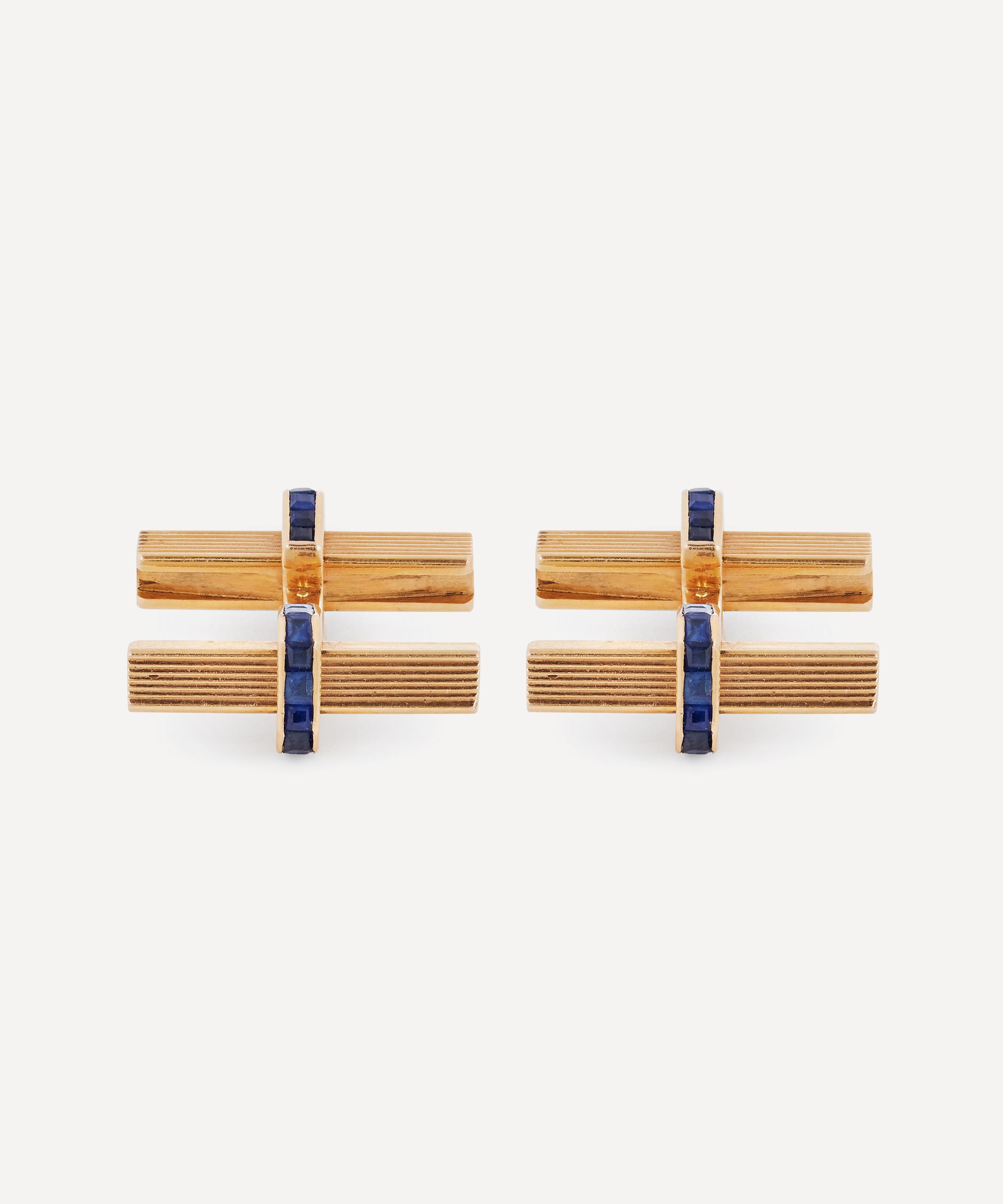 Crafted from polished 18 carat gold, these vintage cufflinks date back to the late 1970s. In a Van Cleef & Arpels-inspired design, each one features octagonal finials set with forty-four square-cut sapphires for a striking finish. A rare and captivating find, they will bring a hint of timeless sophistication to formalwear.