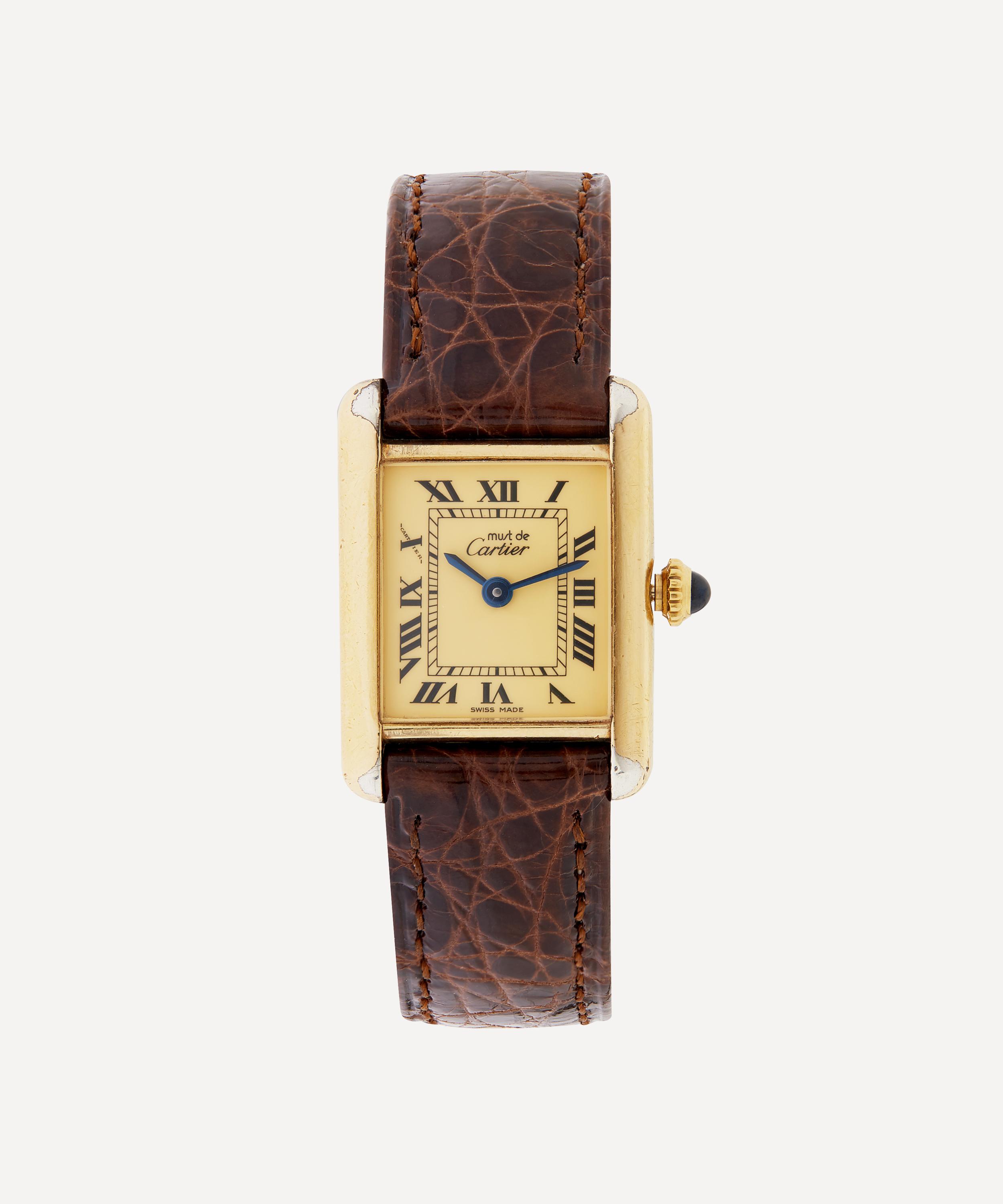Crafted from gold vermeil, this watch features a matte cream dial with metallic-blue sword hands, set in a cushioned rectangular case with gently convex crystal, grown-on bar lugs and original gadrooned crown bearing a round cabochon sapphire. Attached to a Cartier bistre-brown crocodile strap with complementing buckle in the form of the signature House letter, this collectable watch is guaranteed to become a much-admired heirloom that can be passed from generation to generation for many years to come.