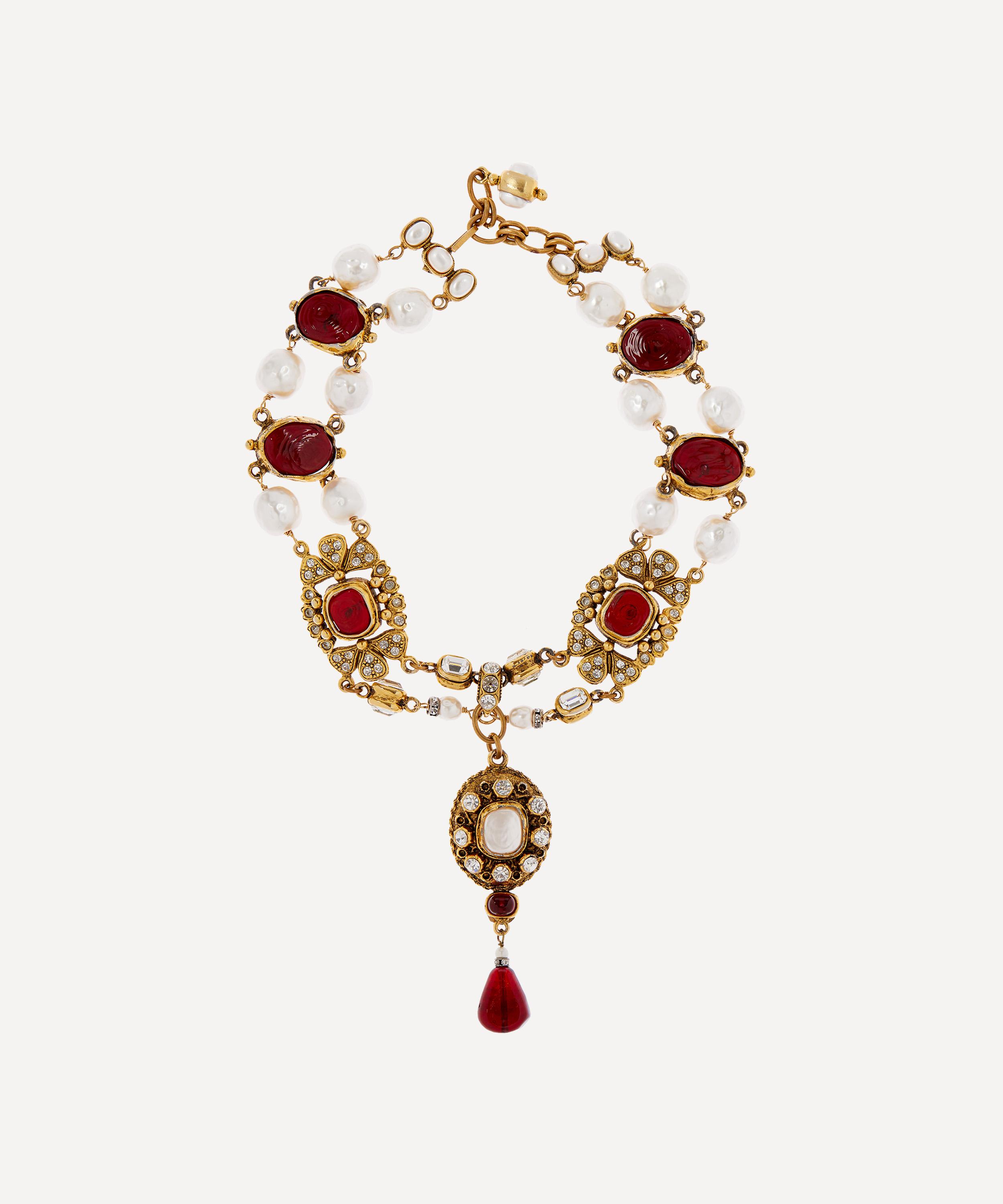 Boasting a true collector’s item, this sought after vintage necklace is a rare piece from Chanel, hand-soured by Dress Box. This stunning costume necklace has been hand-made in collaboration with Gripoix – a Parisian atelier known for creating jewellery out of glass. Characterised by a dual-stranded figure and cushioned oval gilt pendant, it’s adorned with faux pearls, faux round-cut diamonds, faux cabochon-cut rubies, and a faux ruby teardrop.