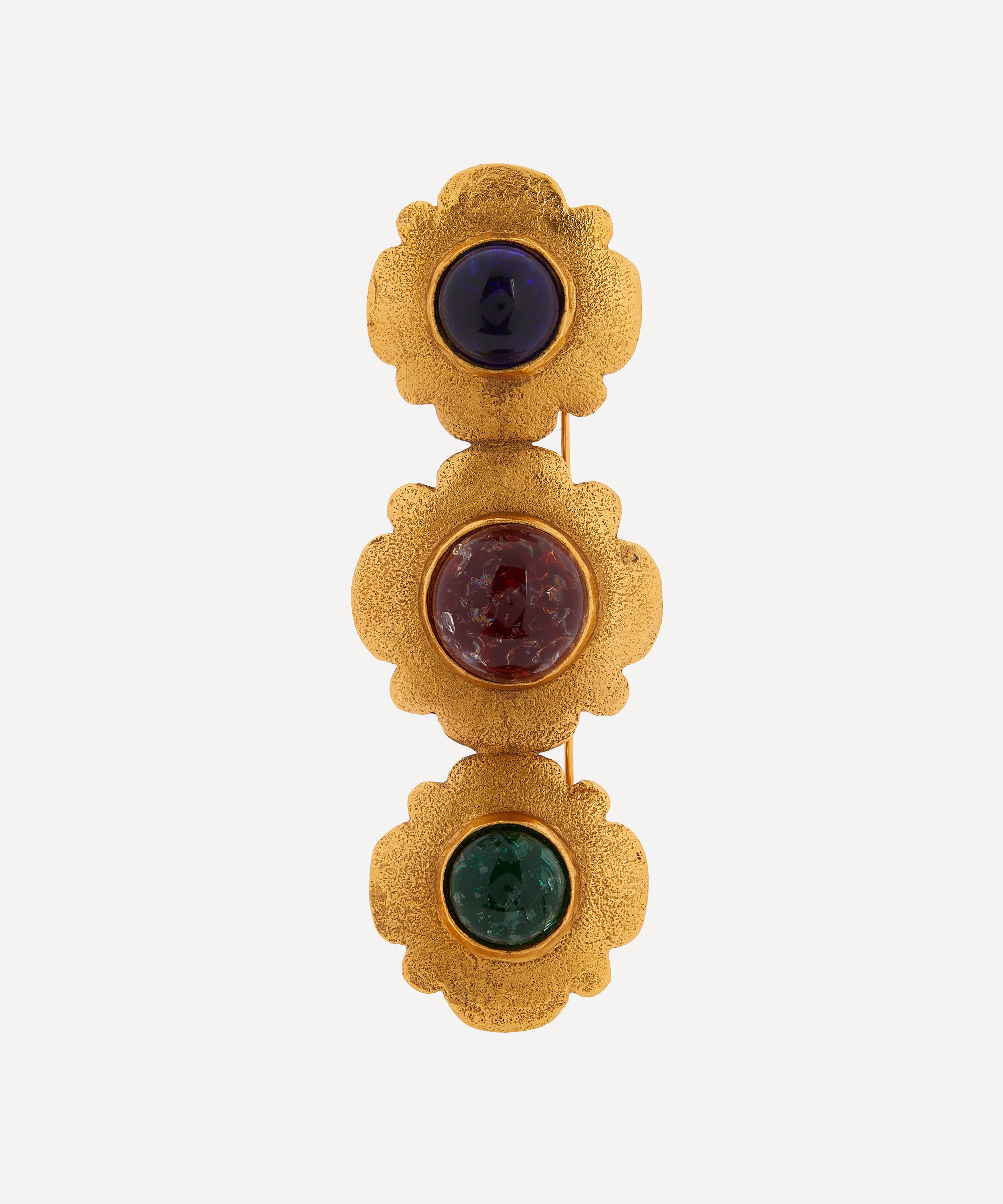 Boasting a true collector’s item, this sought after vintage brooch is a rare piece from Chanel, hand-soured by Dress Box. This costume brooch features a gently hammered gilt with dual-sized stylised camellias – a iconic symbol eponymous of the brand. Further characterised by cabochon-cut faux sapphire, ruby, and opal pistils, surrounded by stencil petals, it’s complete with a self-pin fastening – style it on the lapels of a blazer for a touch of vintage charm.