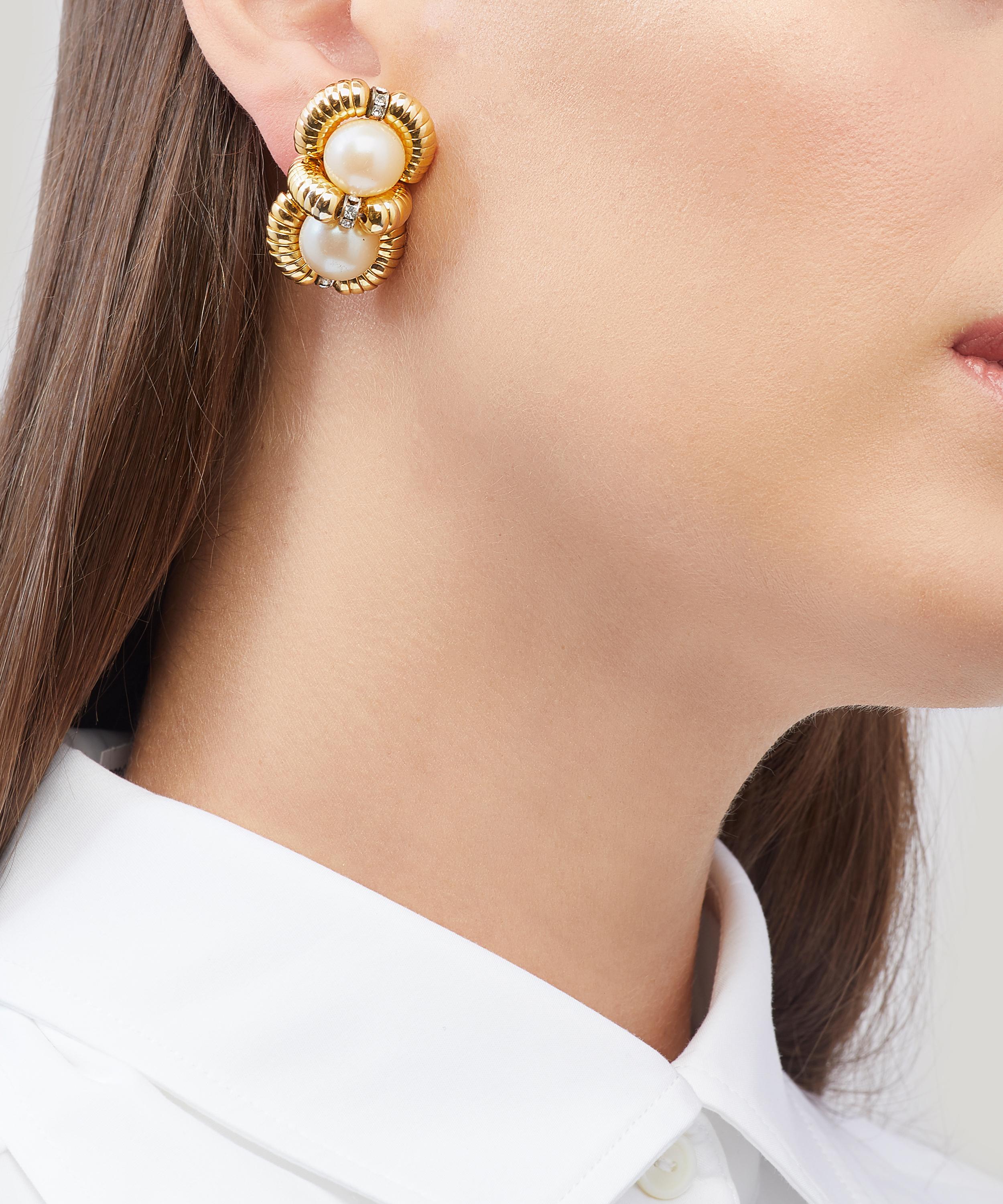 1980s Gilt Faux Pearl and Diamond Clip-On Earrings