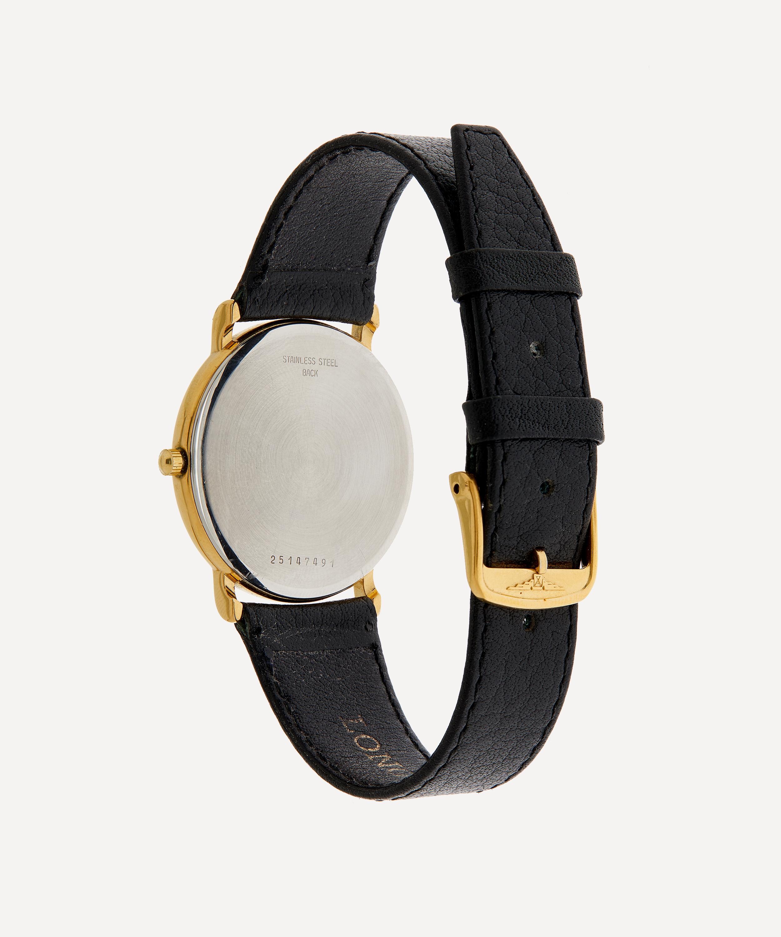 Crafted from gilt metal with a black leather strap, this quartz watch has 5 jewels in its mechanism to reduce friction and wear for longer-lasting quality. Presented in a cushioned circular case, it features a dark oyster-coloured dial with a fine lattice design, black pencil hands and faceted baton hour markers. Complete with the Longines Présence authenticity script, logo and registration number, this highly collectable piece is guaranteed to become a much-admired heirloom that can be passed from generation to generation for many years to come.
