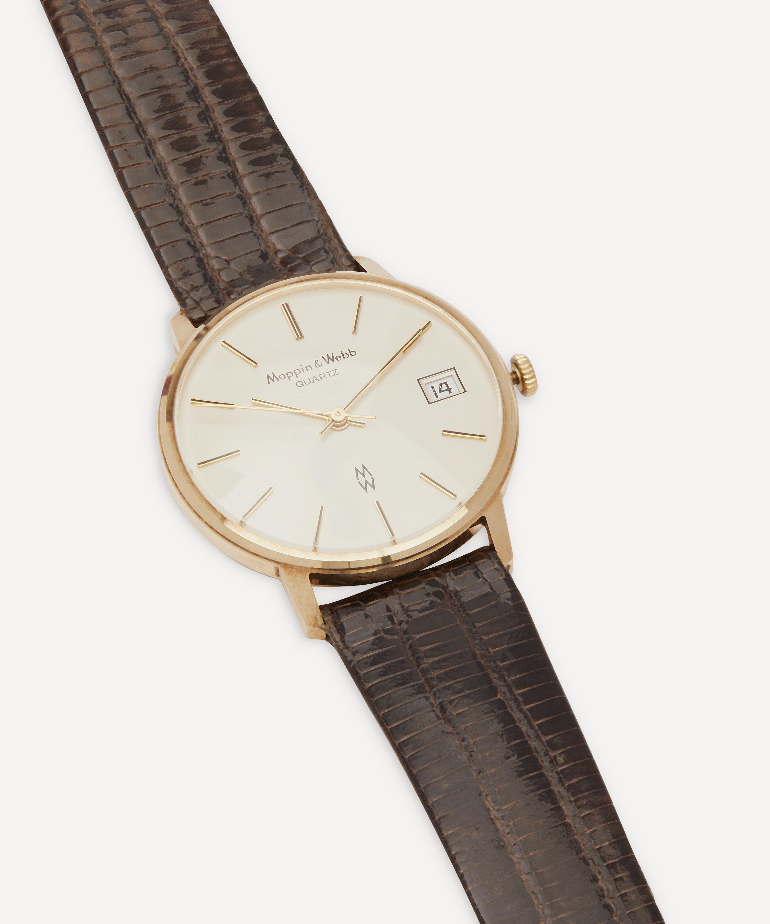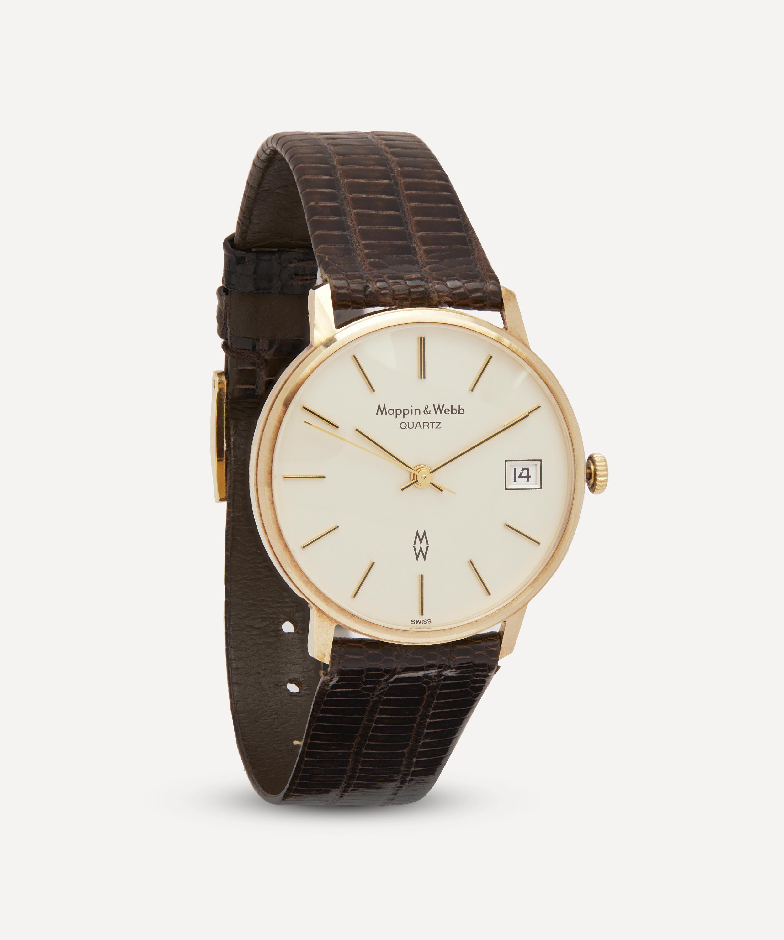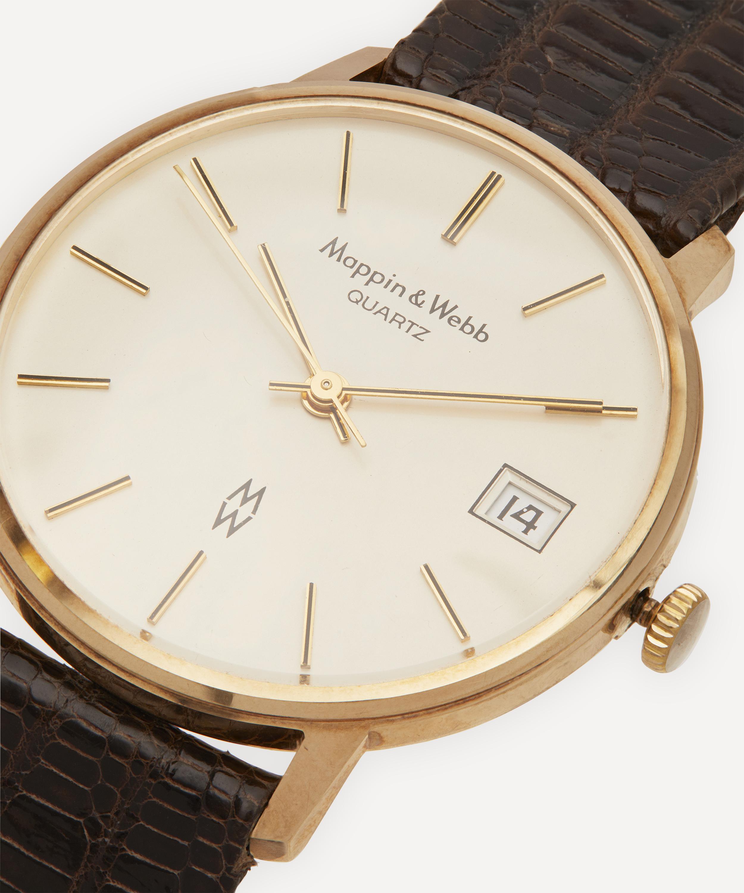 A mid 1980s, 9 carat gold quartz watch from Royal Warrant Holders Mappin & Webb. This rare and collectible piece showcases 7 jewels which reduce friction and wear, lengthening the life of a watch. Featuring an oyster-coloured dial incorporating a date feature at 3 o’clock, with fine gold hands, seconds-hand and batons, it is set in a cushioned circular case with gently convex crystal, grown-on lugs and original gadrooned crown. A Mappin & Webb bistre-brown lizard strap with complementing House buckle and self slide fits smoothly around the wrist. This watch is a quartz, it has been recently serviced and is in good working order. This item carries the Mappin & Webb authenticity script and gold hallmarks, and comes complete with its original blue presentation box and cream outer box. A highly collectible piece, it’ll become a much-admired heirloom to be passed from generation to generation.