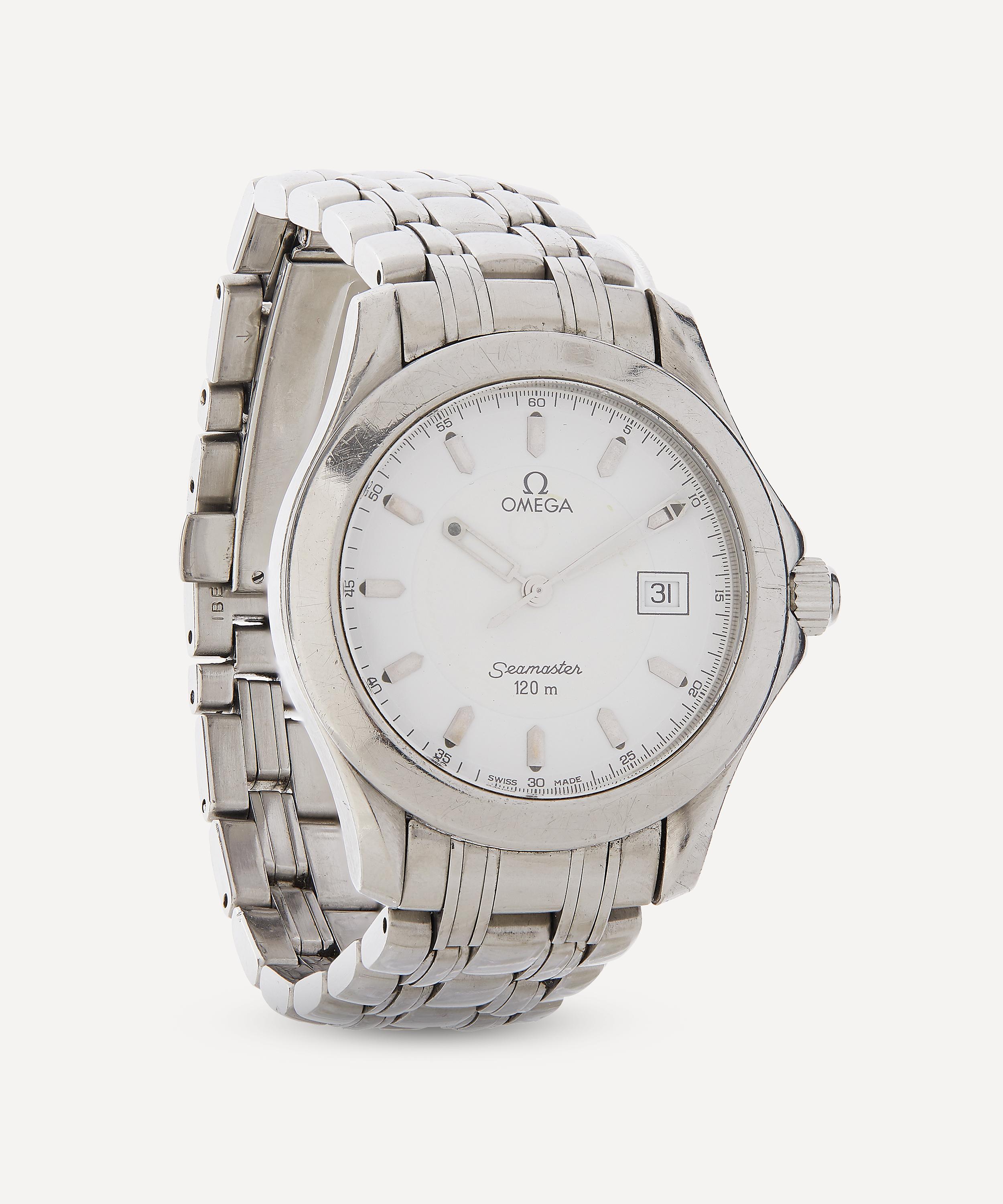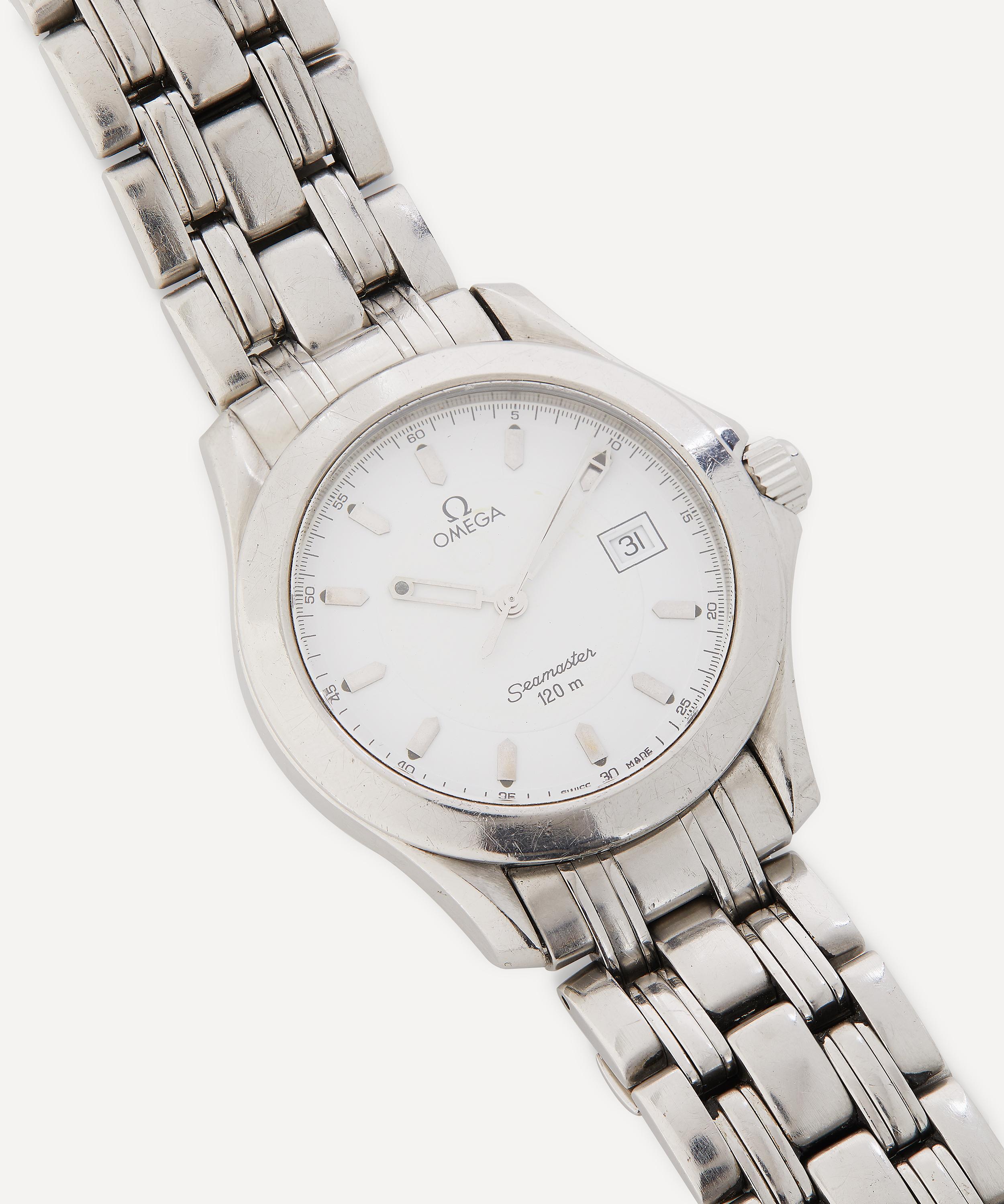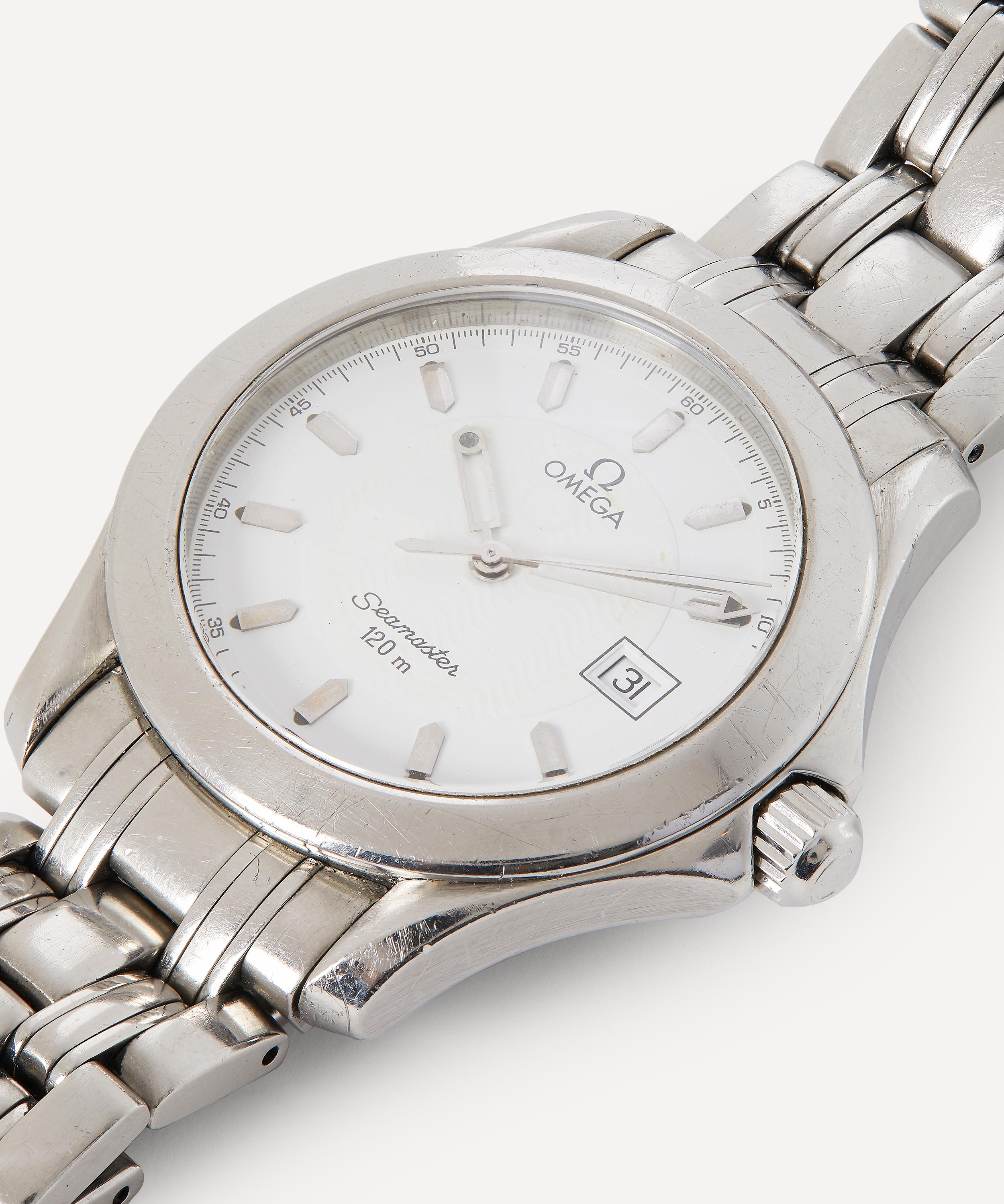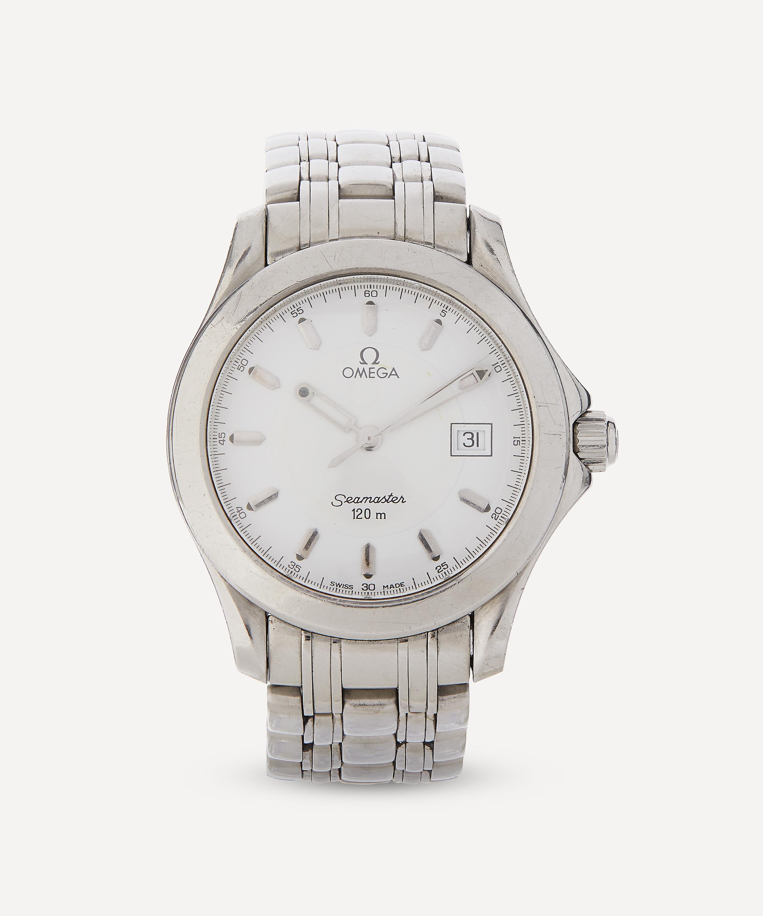 This white metal Omega Seamaster watch from the late 1980s is a highly collectible timepiece hand-sourced by the accessories experts at Designer Vintage.