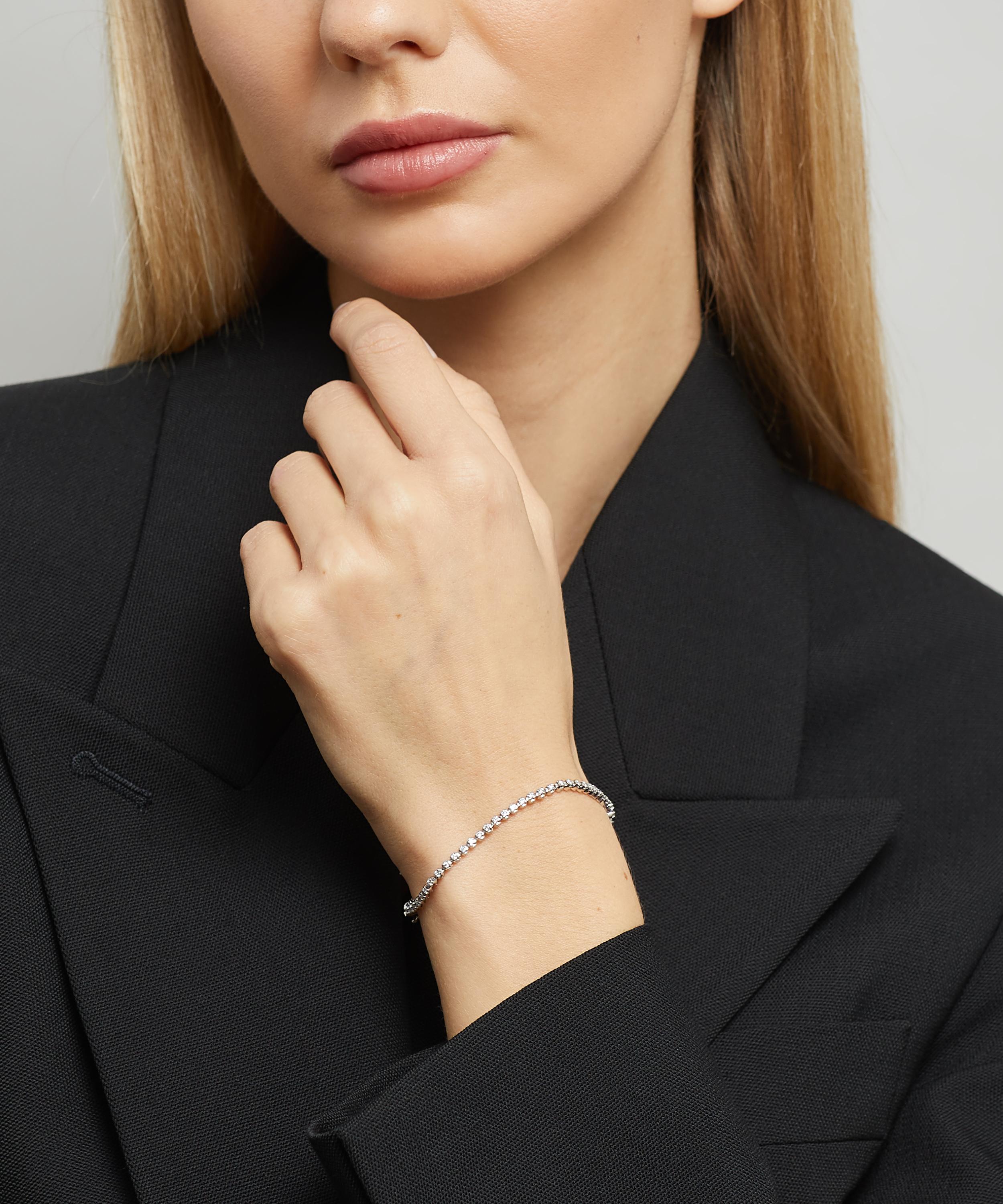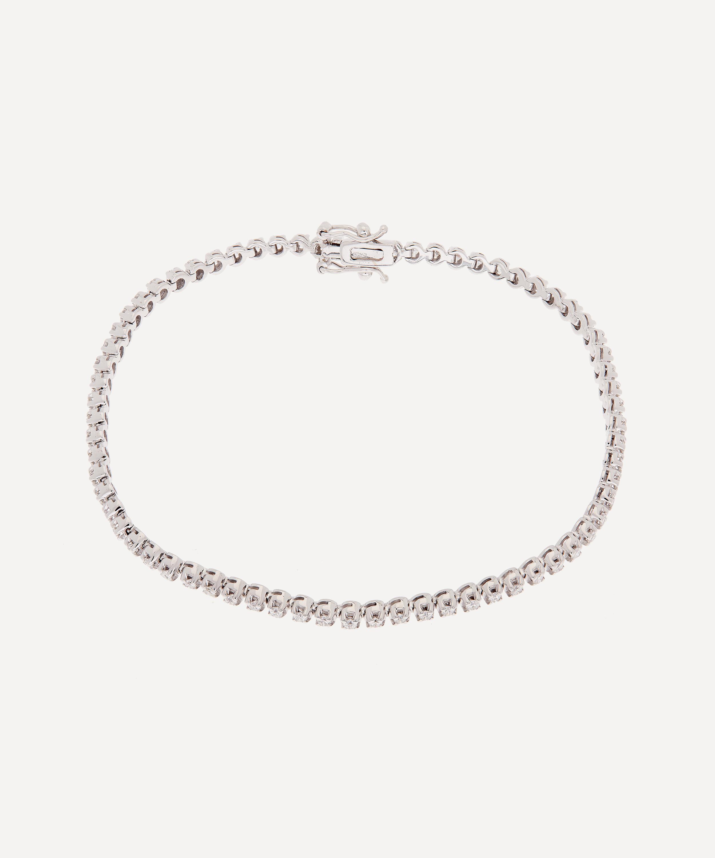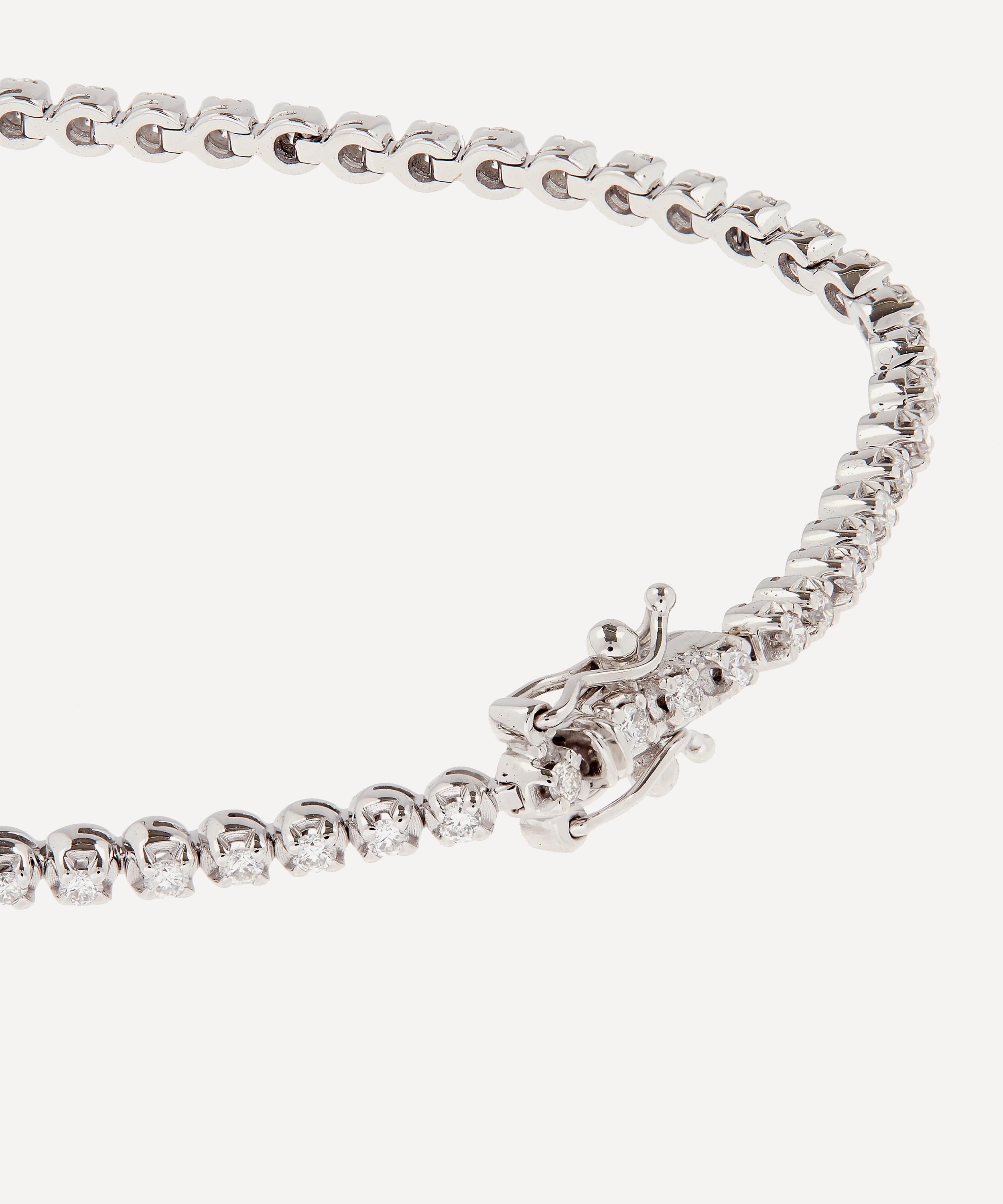 Available in 18 carat gold or white gold, this bracelet is formed of a seamless string of round, brilliant cut white diamonds with a minimum weight of 1 carat - each presented in a miniature claw setting. An elegant example of classic modern jewellery, wear this piece alone to fully showcase the unique design, or incorporate it into a maximalist curation of bejewelled gold bracelets for a custom, contemporary approach.