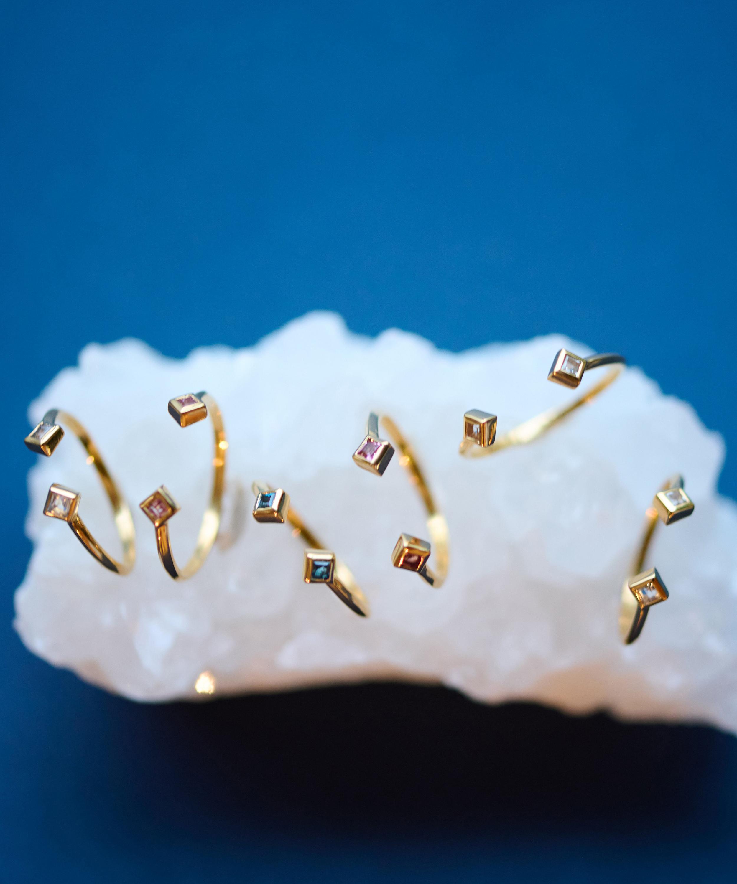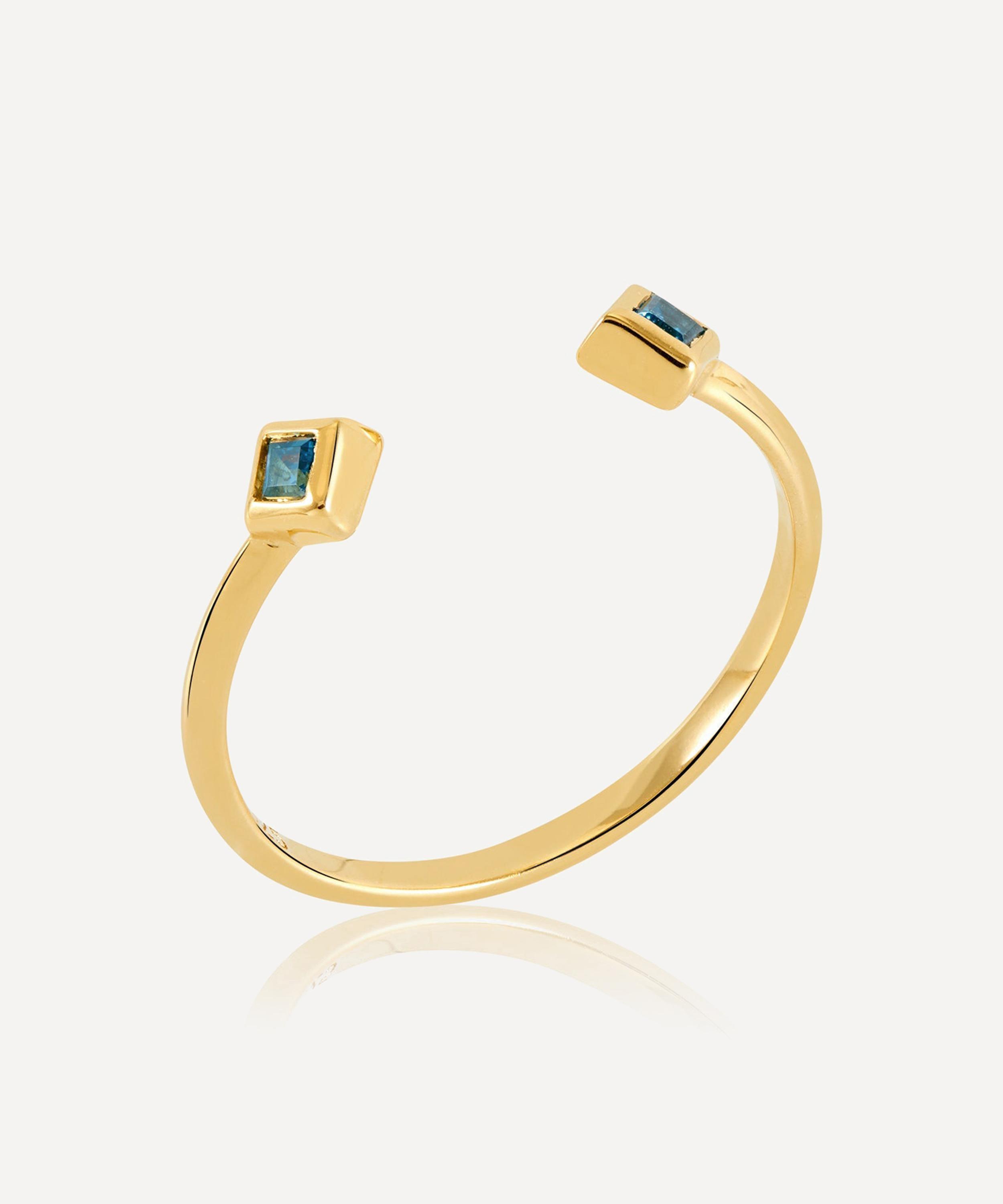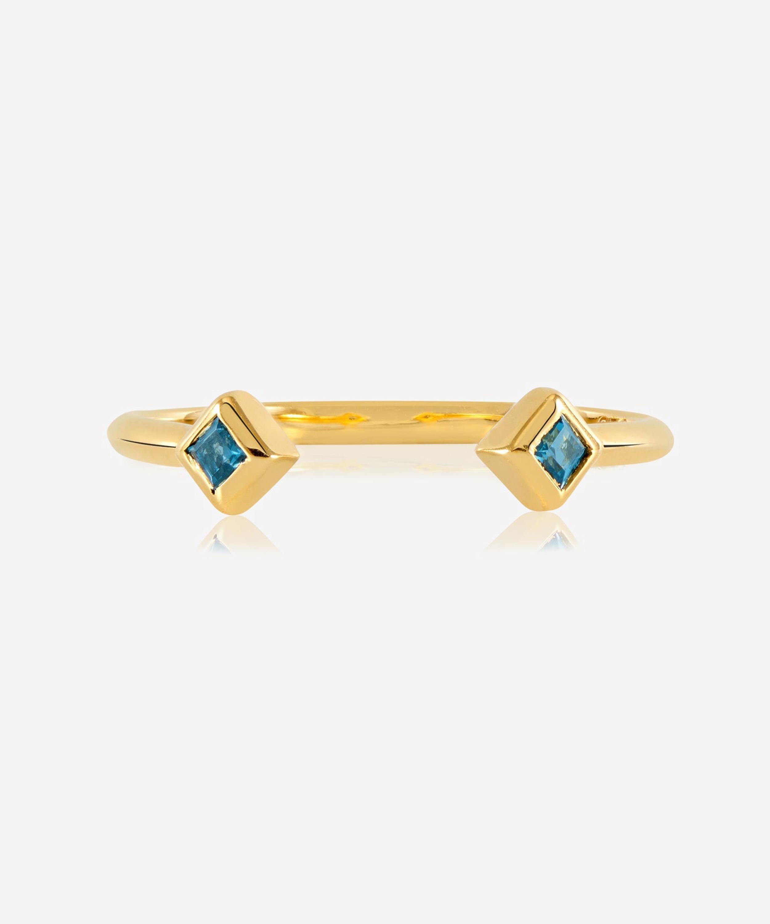 Crafted from 22ct gold-plated silver, it features an Art Deco-style silhouette fashioned into a slim, adjustable band set with a square-cut London blue topaz on either end – a gemstone thought to bring good fortune. Designed as a symbol of guidance, it can be styled solo, stacked with additional rings, or paired with matching styles from the collection for a coordinated look.