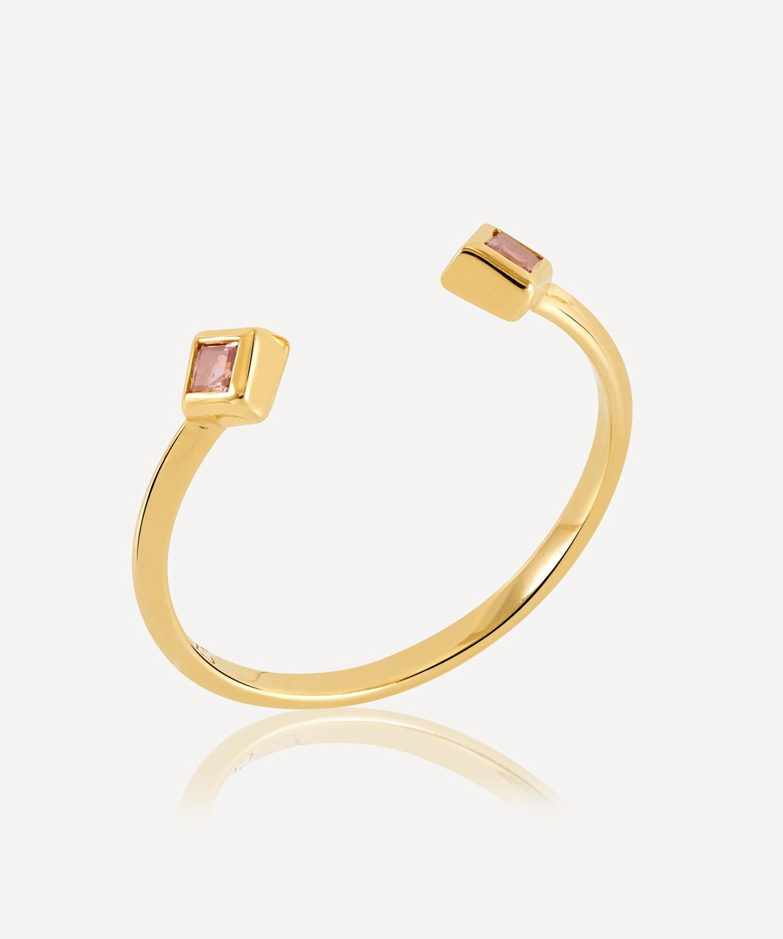 Crafted from 22ct gold-plated silver, it features an Art Deco-style silhouette fashioned into a slim, adjustable band set with a square-cut pink tourmaline on either end – a gemstone thought to bring good fortune. Designed as a symbol of guidance, it can be styled solo, stacked with additional rings, or paired with matching styles from the collection for a coordinated look.