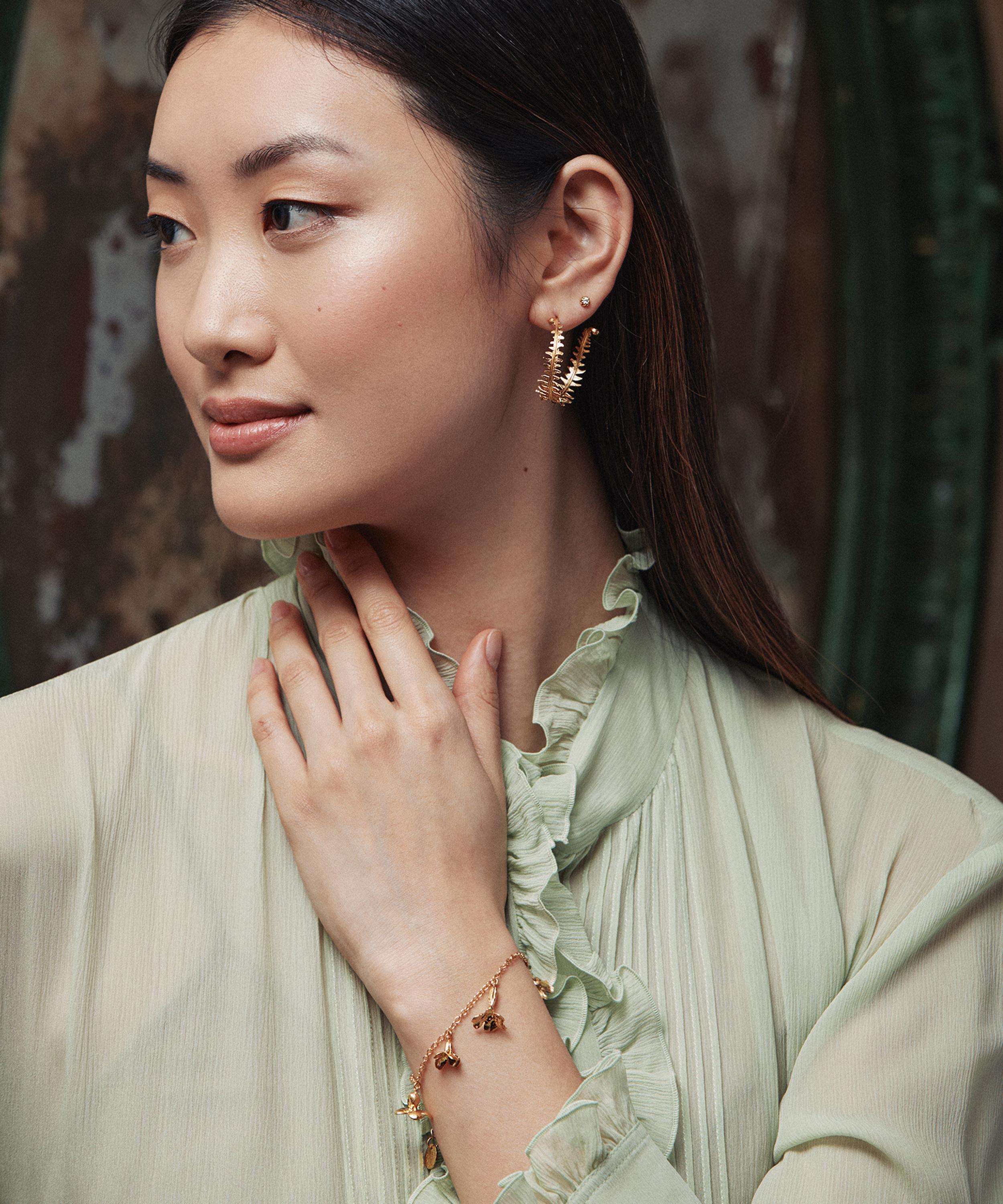 These hoop earrings from Alex Monroe perfectly captures the designer’s unwavering appreciation for natural motifs. Handcrafted from 22ct gold-plated silver in the brand's London studio, each earring takes the shape of a wrapped fern leaf, adorned with textured detailing. Pair them with other accompanying pieces from the brand for a wearable representation of the elegance and delicacy of the natural world.