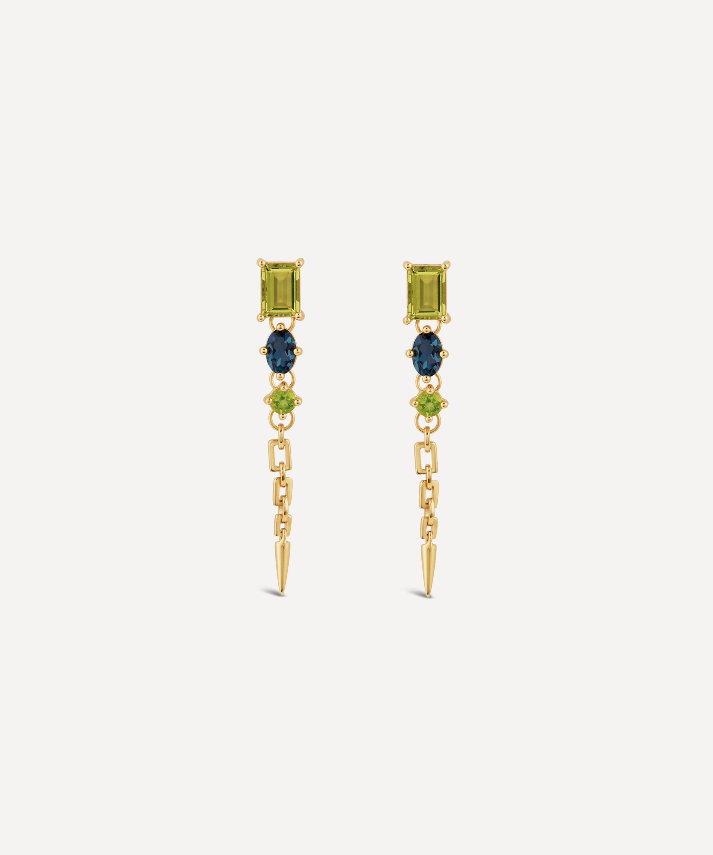 A modern day interpretation of Art Deco Glamour, these drop earrings are part of Dinny Hall’s Get-Set collection – inspired by the rebellious Flapper girls of the 1920s. Crafted from 22ct gold-plated silver, each earring features an elegant triple drop composed of an emerald cut olive green quartz, an oval cut London blue topaz, and a round cut peridot. Complete with a chain detail and classic posts, style them with a matching necklace and bracelet from the collection for a fully coordinated look.