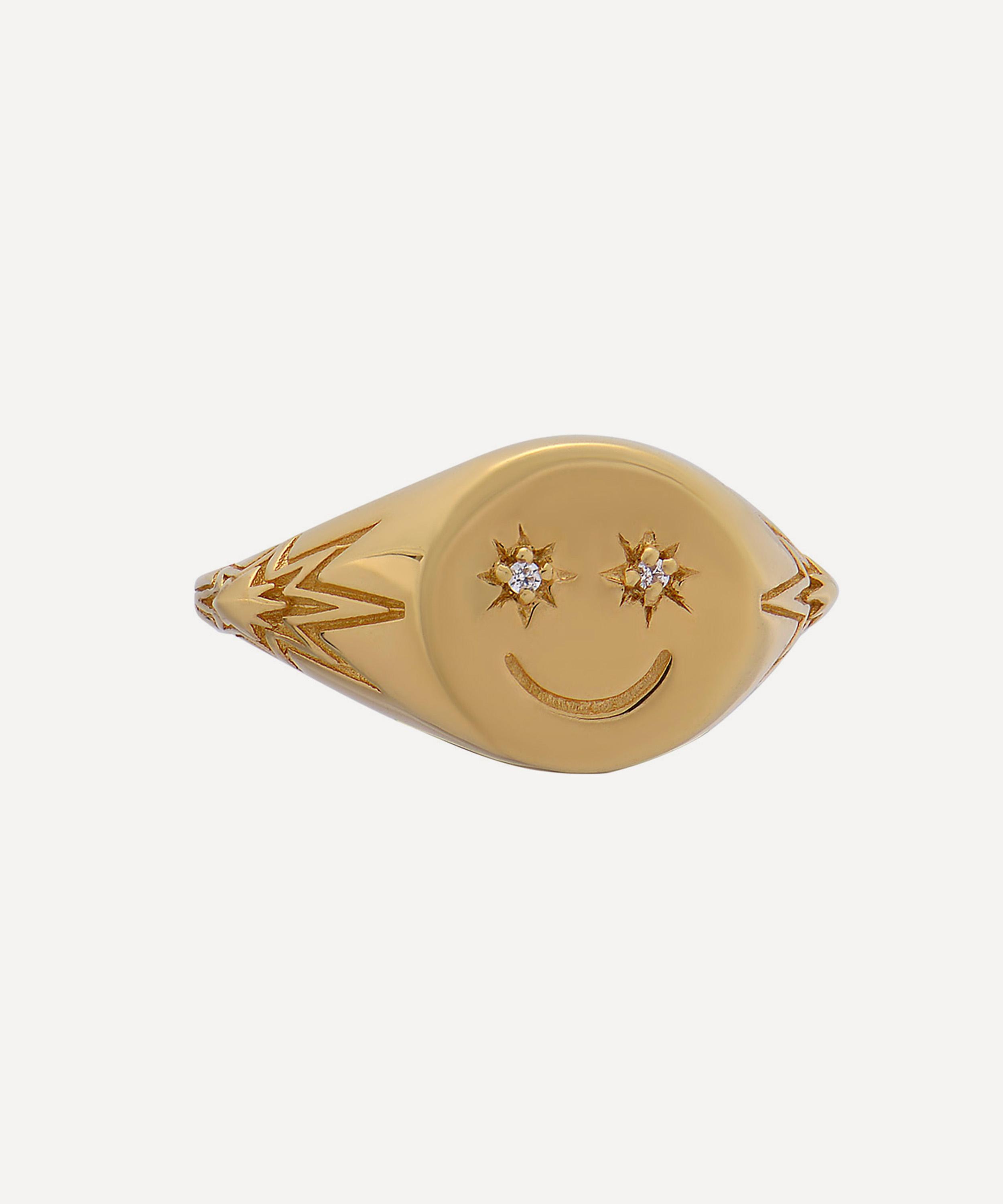 Boasting a light-hearted addition to your collection, the Happy Face pinky signet ring from Rachel Jackson instantly brings an element of fun to your edit. Crafted from 22ct gold-plated silver, this ring features a round happy face head adorned with cubic zirconia-set eyes and engraved detailing on the shoulders. Try teaming yours with other delicately playful pieces for a contemporary approach.