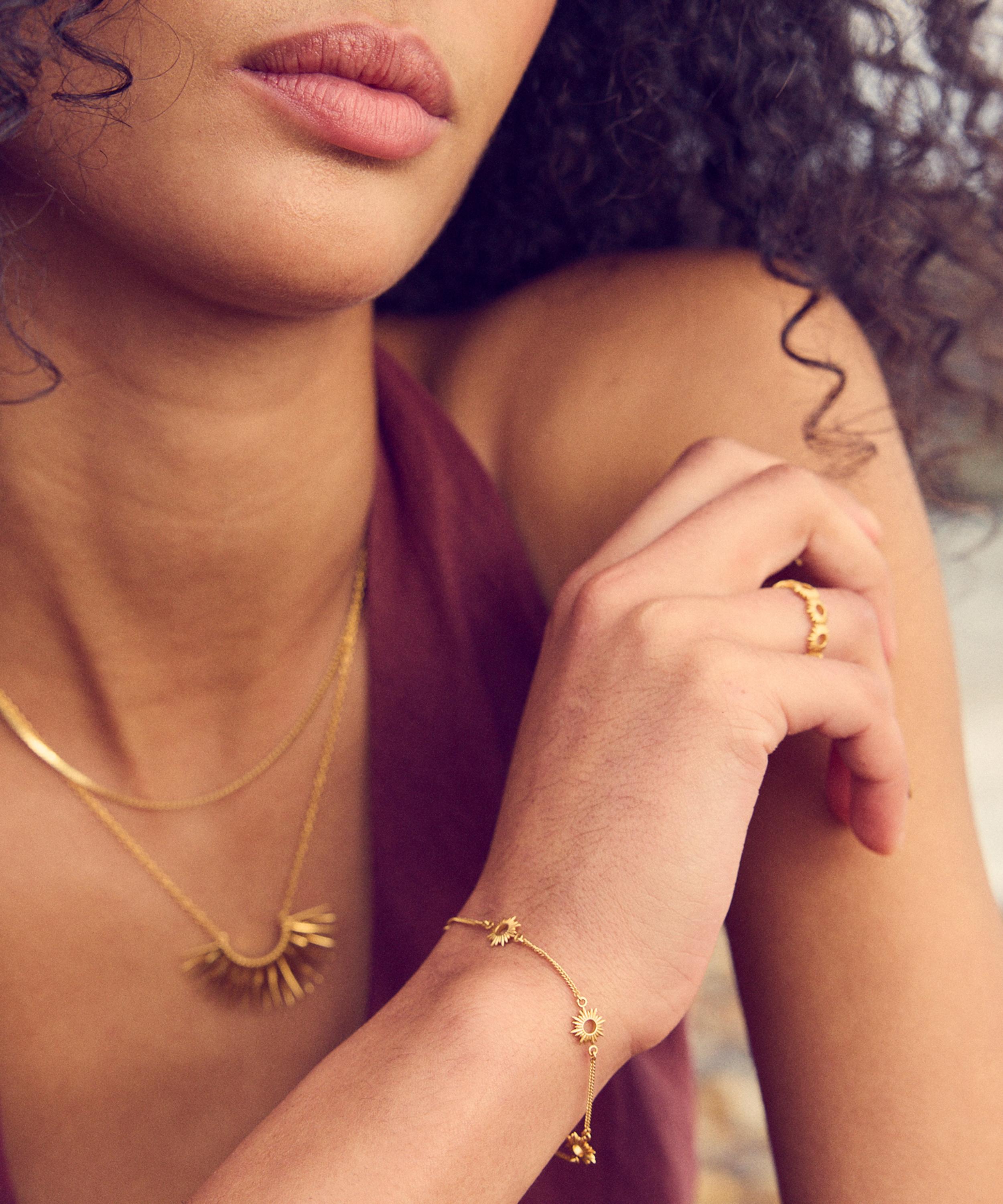 Crafted from 22ct gold-plated sterling silver, it features a classic curb chain adorned with the collection’s signature electric sun ray motifs. Perfect for effortless, day-to-night styling, wear it on its own or stack with other bracelets for a head-turning curation.