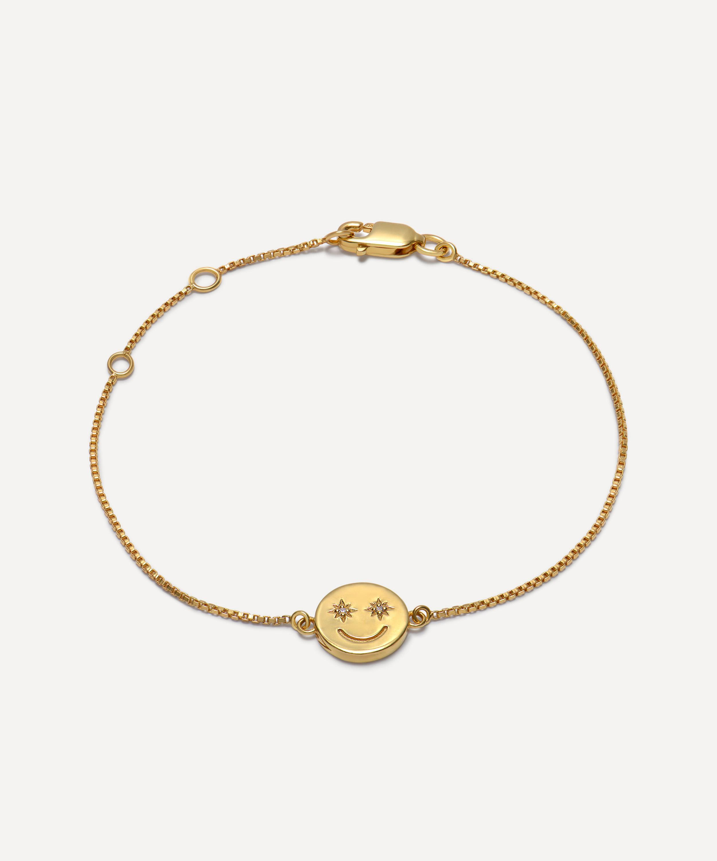 Boasting a light-hearted addition to your collection, the Mini Happy Face charm bracelet from Rachel Jackson instantly brings an element of fun to your edit. Crafted from 22ct gold-plated silver, this bracelet features a fine chain and a happy face charm adorned with two cubic zirconia-set eyes. Try layering yours with other delicately playful pieces for a contemporary approach.