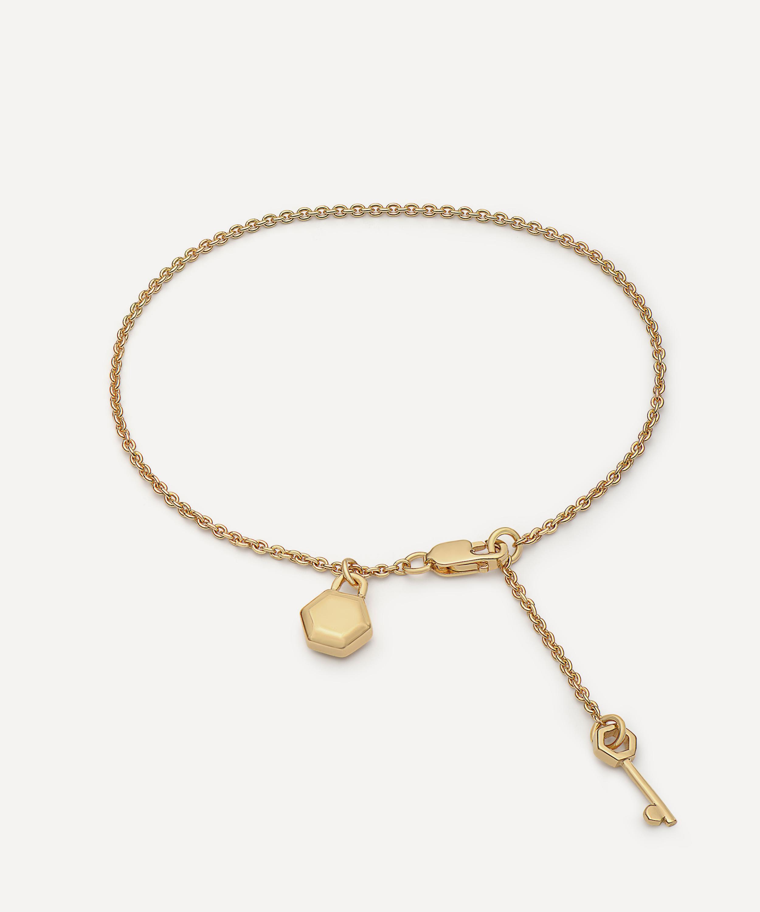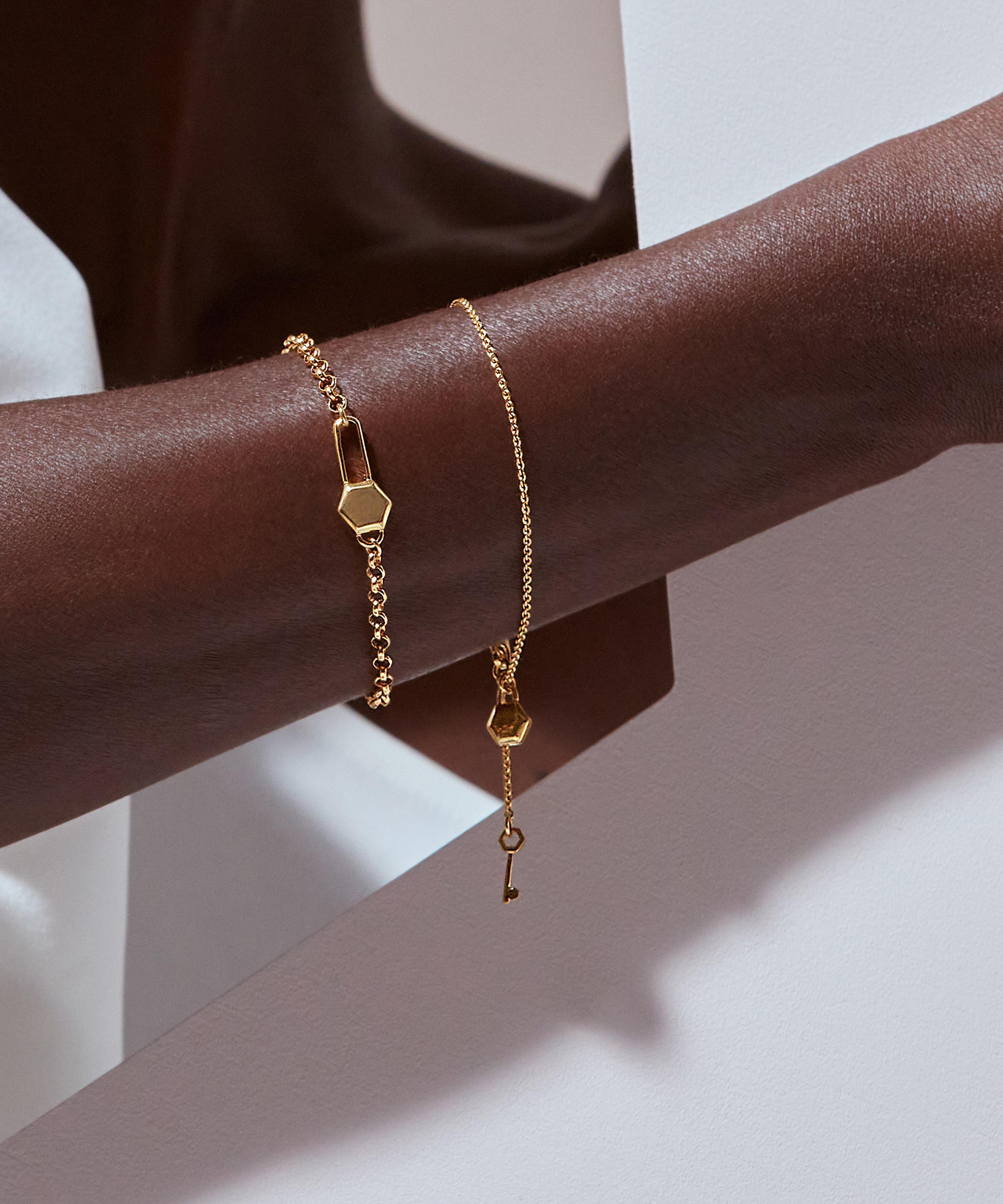 The Mini Lock and Key bracelet is part of Rachel Jackson’s Unlocked collection, featuring the duality of padlocks and keys to evoke inner potential and strength. Crafted from 22ct gold-plated silver, this bracelet features an adjustable rolo chain, adorned with a sculpted key charm and hexagon-shaped padlock charm.