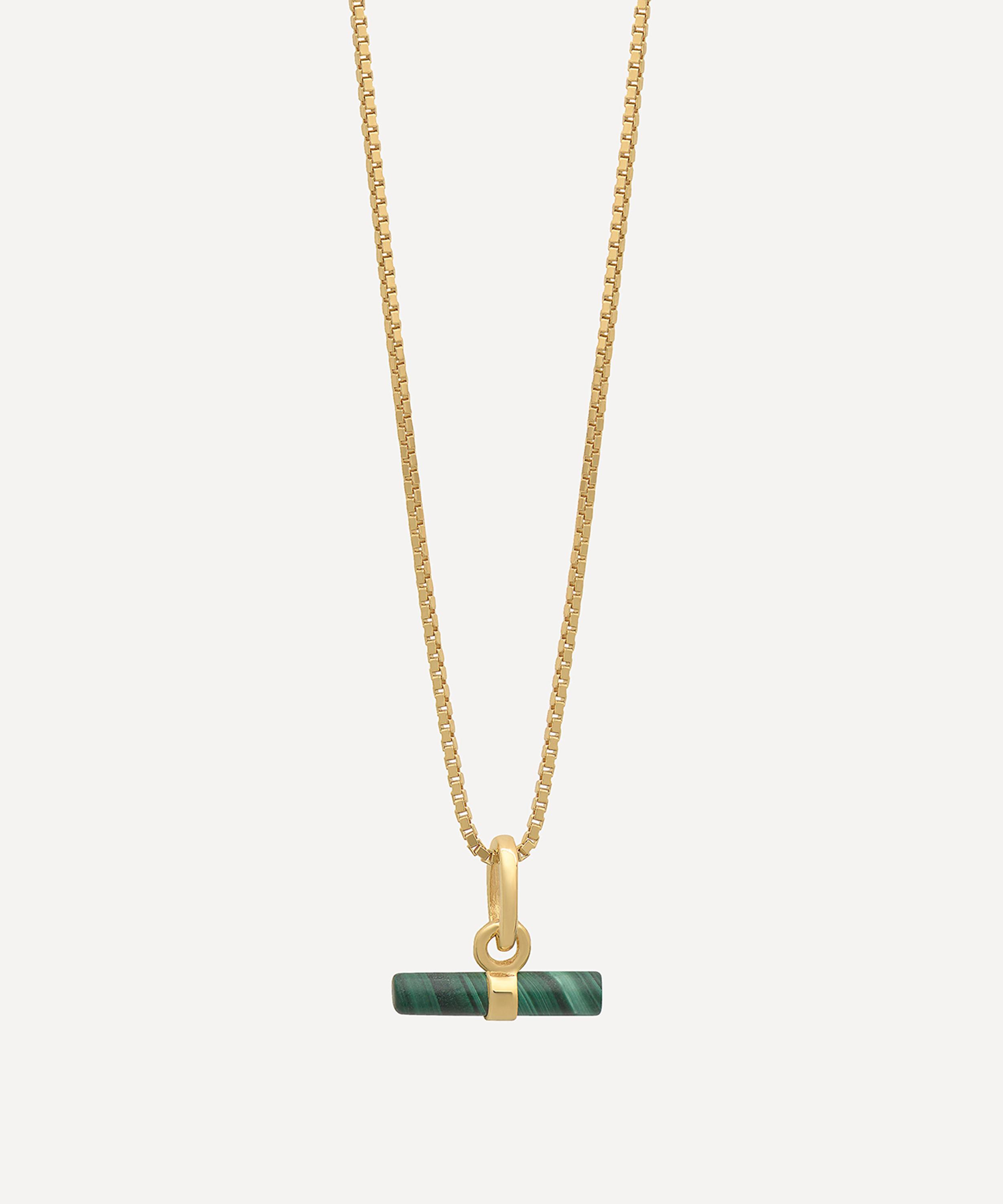 Influenced by times gone by, this necklace is crafted from 22ct gold-plated sterling silver, featuring a hand craved malachite T-bar pendant suspended from a diamond-cut box chain. Finding beauty in simplicity, the design represents balance and perspective – style this Art Deco-inspired piece with other necklaces from the collection for a layered effect.