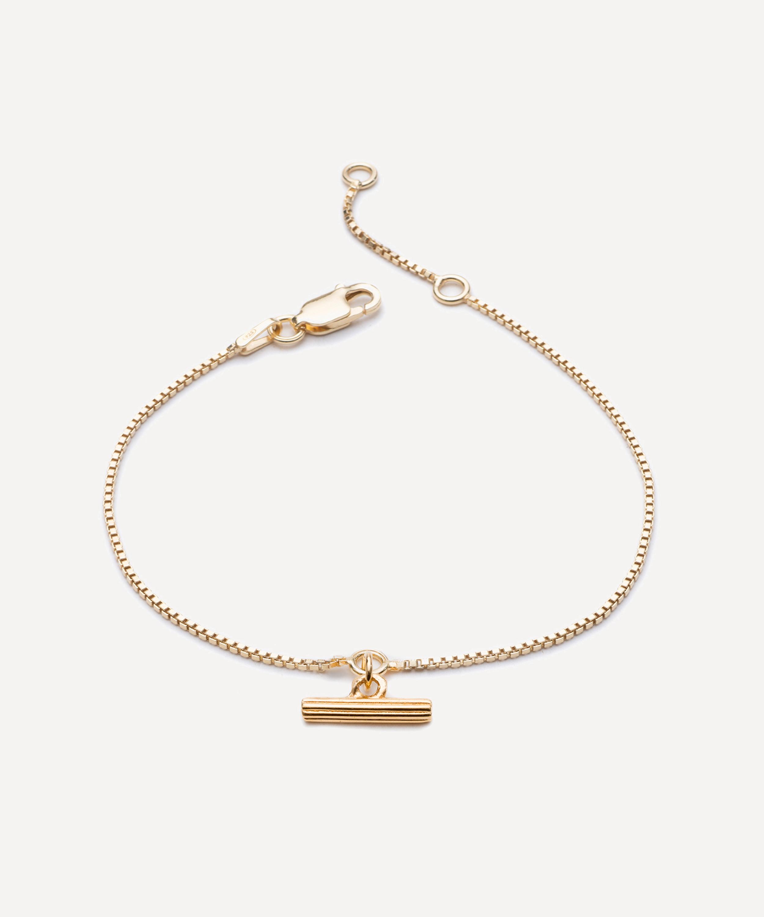 Take your outfit to the next level with this bracelet from Rachel Jackson’s Momento collection. Crafted from 22ct gold-plated silver, it features a luxe box chain with an Art Deco inspired ridged T-bar charm – style it solo, stack it with other bracelets or try pairing it with the matching Mini T-Bar Necklace.