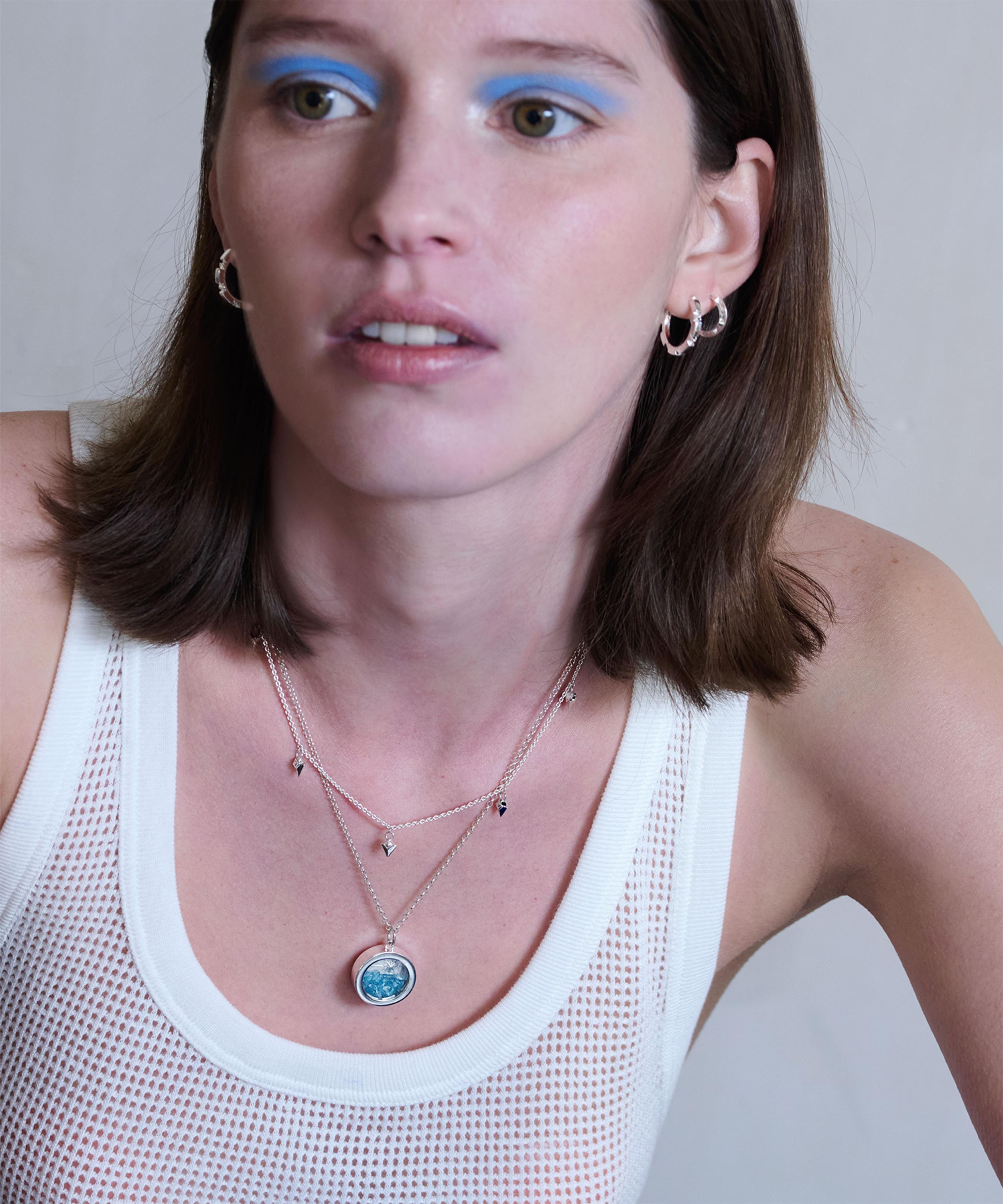Crafted from 22ct gold-plated silver, it features a polished rolo chain and a round, see-through amulet adorned with loose London blue topaz stones – a gemstone thought to enhance the clarity of the mind. Style it solo, stack it with additional necklace, or pair with matching pieces from the collection for a coordinated look.