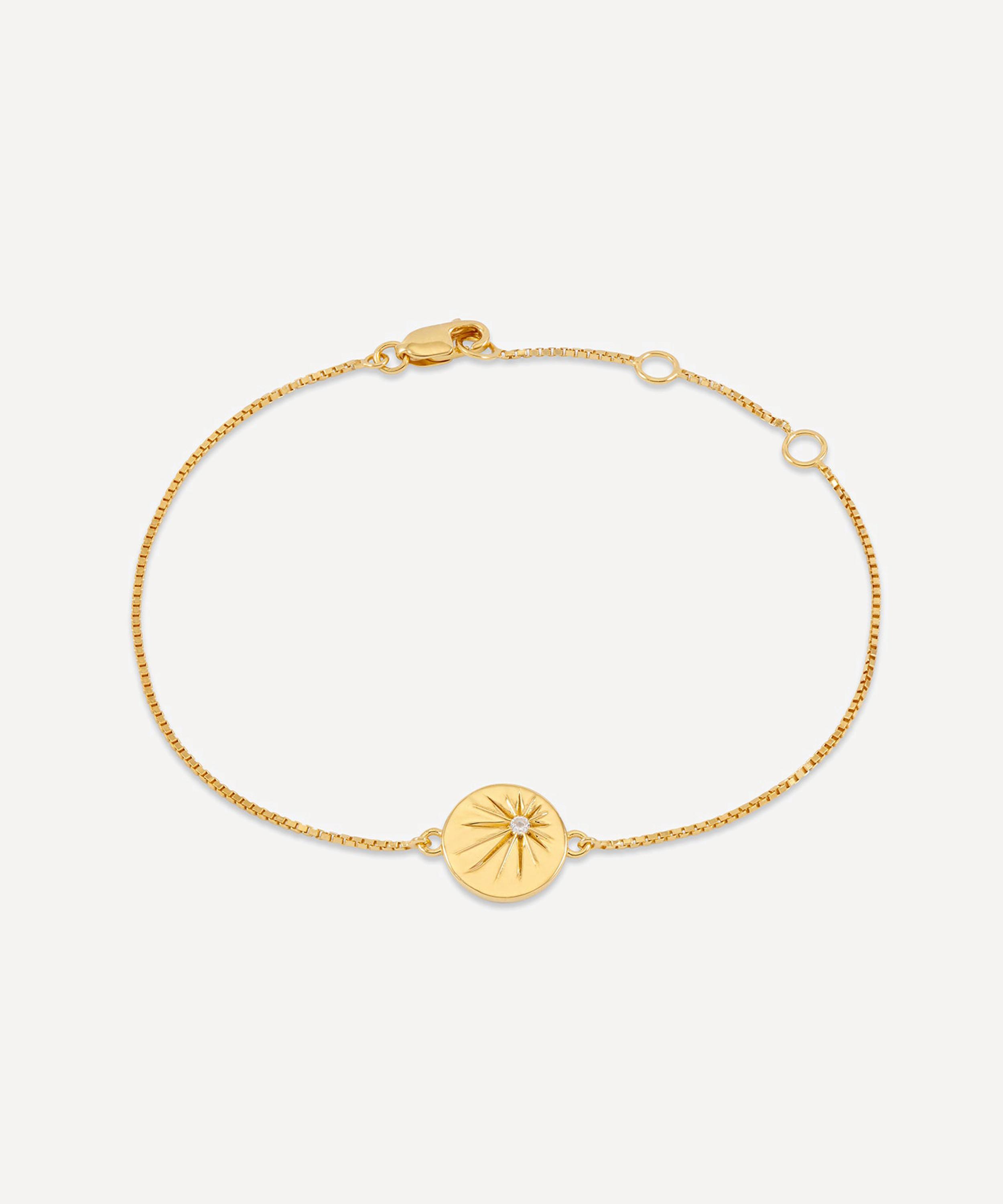 Crafted from 22ct gold-plated silver, it features a fine box chain and disc pendant, embellished with a glistening white topaz set starburst motif and Art Deco spikes detailing, representing the arrows of a compass - a reminder to tune in to our intuition and remember what really matters. Designed as a symbol of guidance, style it solo, stack it with additional bracelets, or team with matching piece from the collection for a coordinated look.