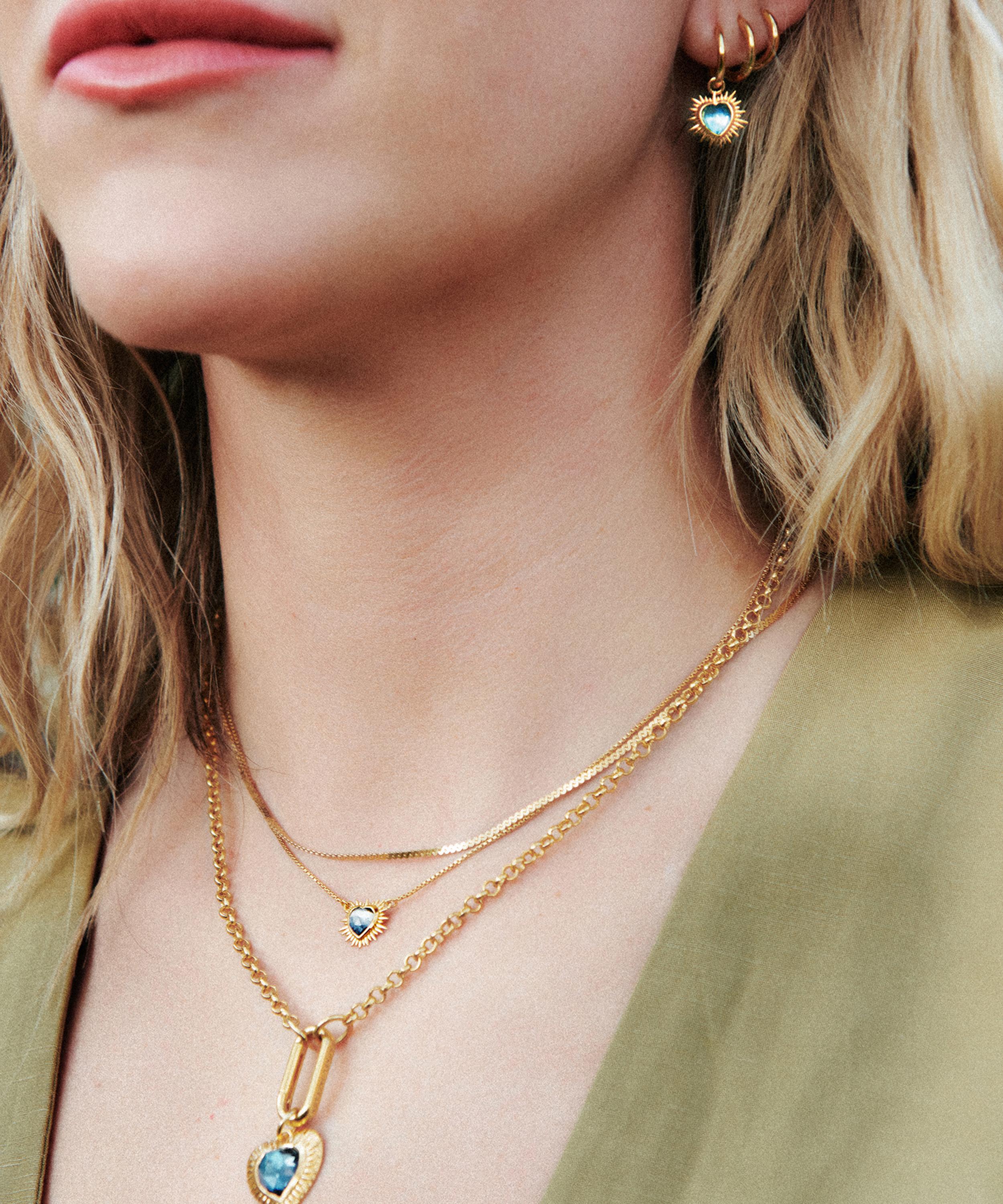 Add a bold edge to your look and exude an empowering aura with this personalised pendant necklace from Rachel Jackson. Crafted from 22ct gold-plated silver, it features a classic belcher chain and a heart-shaped pendant adorned with the collection’s signature electric rays, and a London blue topaz at the centre. Complete with a carabiner clasp, the pendant is fully removable, offering a variety of styling options. Try teaming it with other pendants, or engrave yours to express something secretly special such as personal initials or those of loved ones.