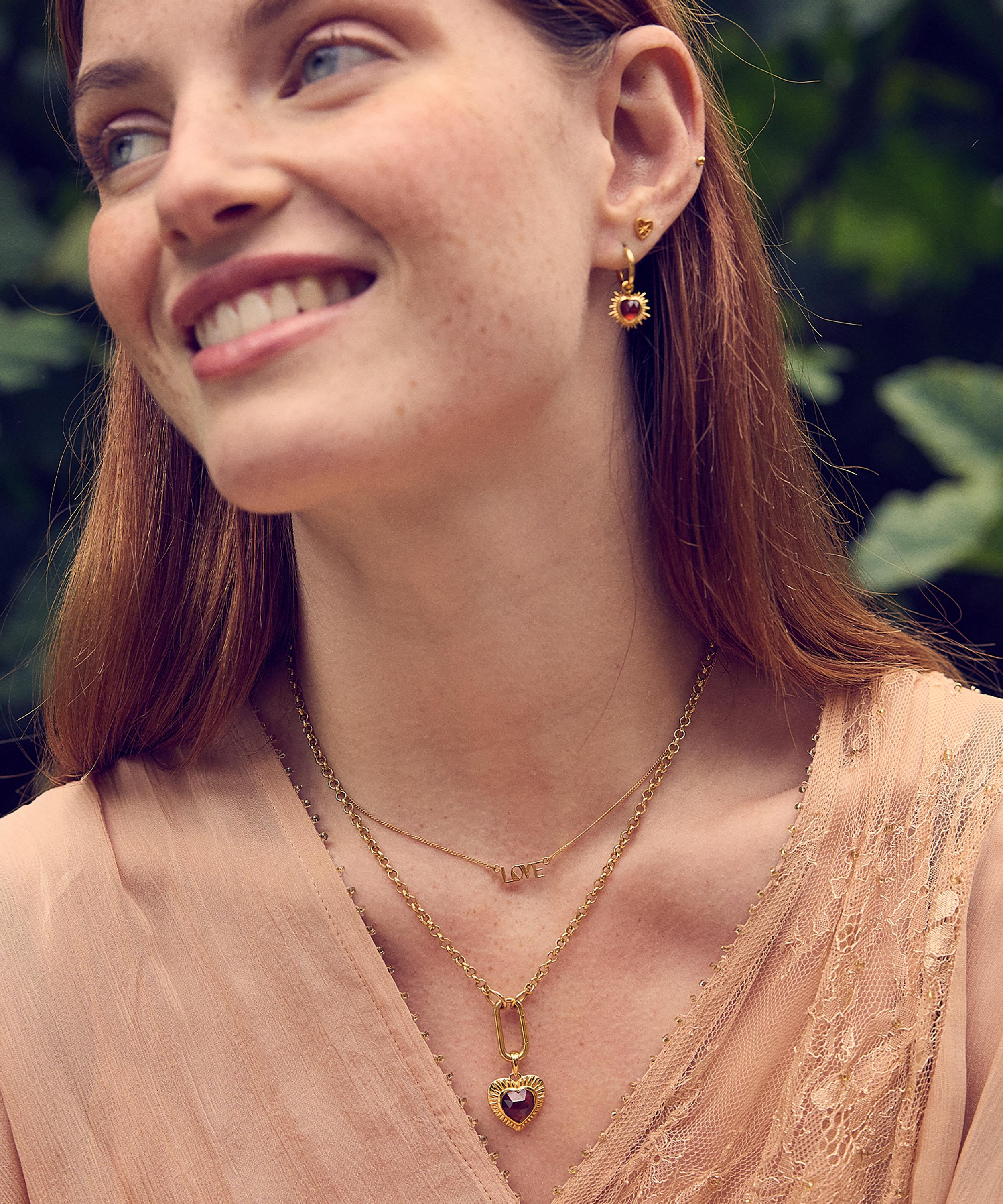 Add a bold edge to your look and exude an empowering aura with this pendant necklace from Rachel Jackson’s Electric Love collection. Crafted from 22ct gold-plated silver, it features a classic rolo chain and an Art Deco-inspired garnet heart pendant adorned with sun burst detailing. Complete with a carabiner clasp, try teaming it with other necklace or style it on its own.