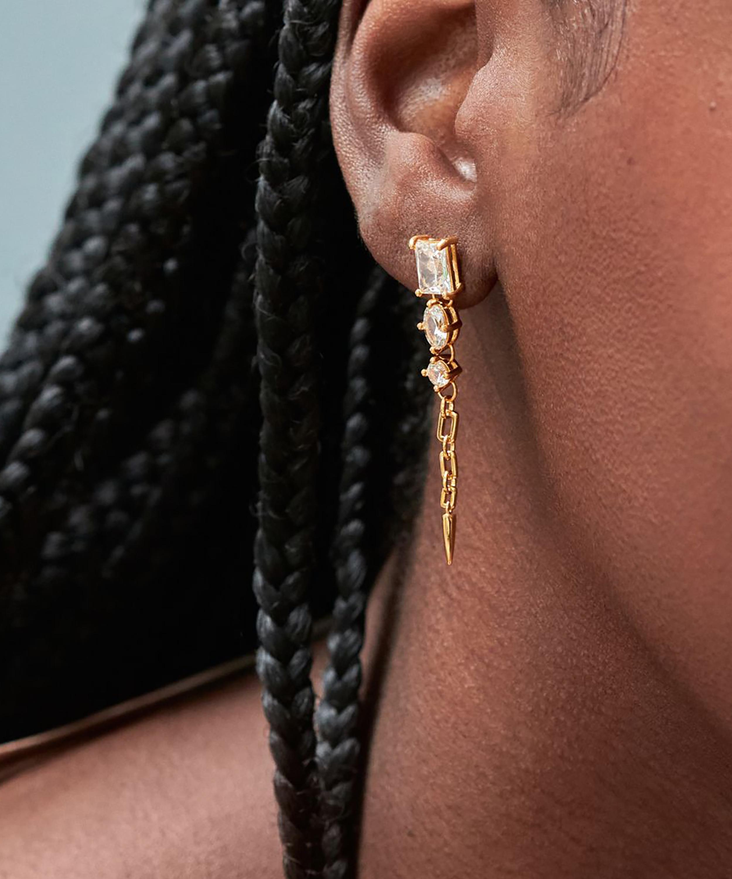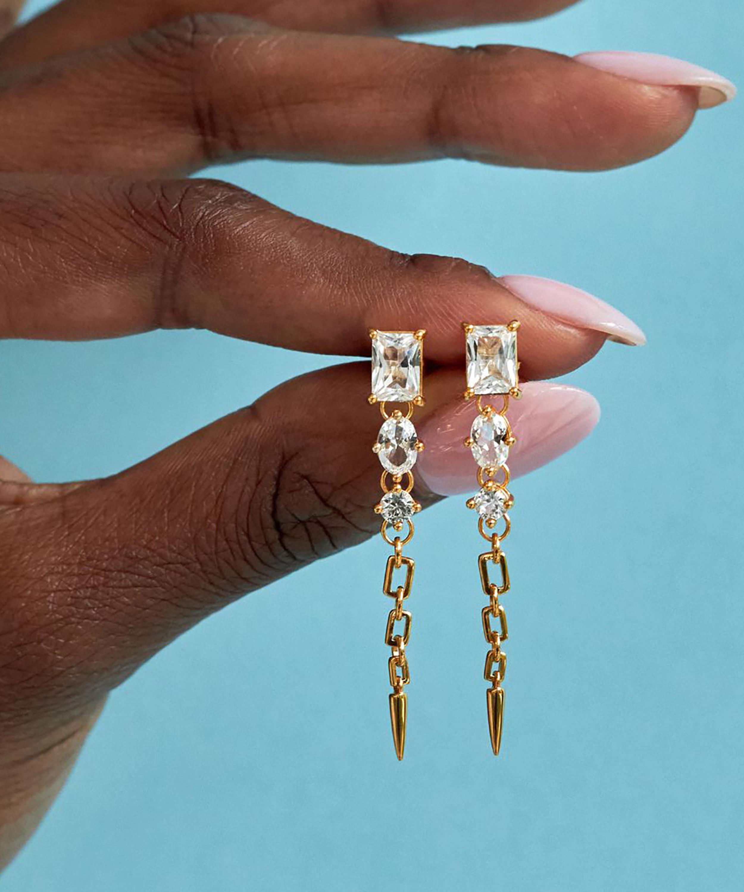 Infuse your look with the colourful decadence of the Column drop earrings from Dinny Hall’s Gem-Set collection – a modern approach to Art Deco glamour. Crafted from sterling silver plated in 22ct gold vermeil, each earring features a contrasting trio of mixed-cut white sapphires, juxtaposed by a flexible handmade chain drop. Style solo, or layer with other earrings to create a unique stack.