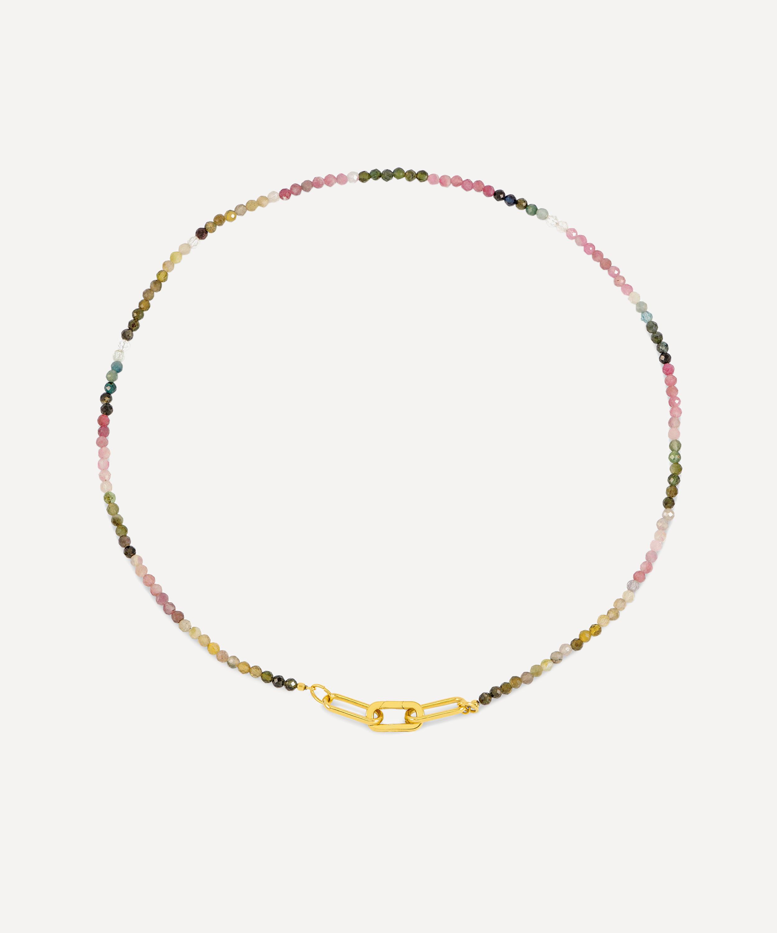 Take your outfit to the next level with the Watermelon Gemstone necklace from Rachel Jackson. Crafted from 22ct gold-plated silver, it features a half and half design composed of a classic rolo chain, and stylish watermelon tourmaline beads. Complete with a polished carabiner clasp, it can be styled solo or layered.