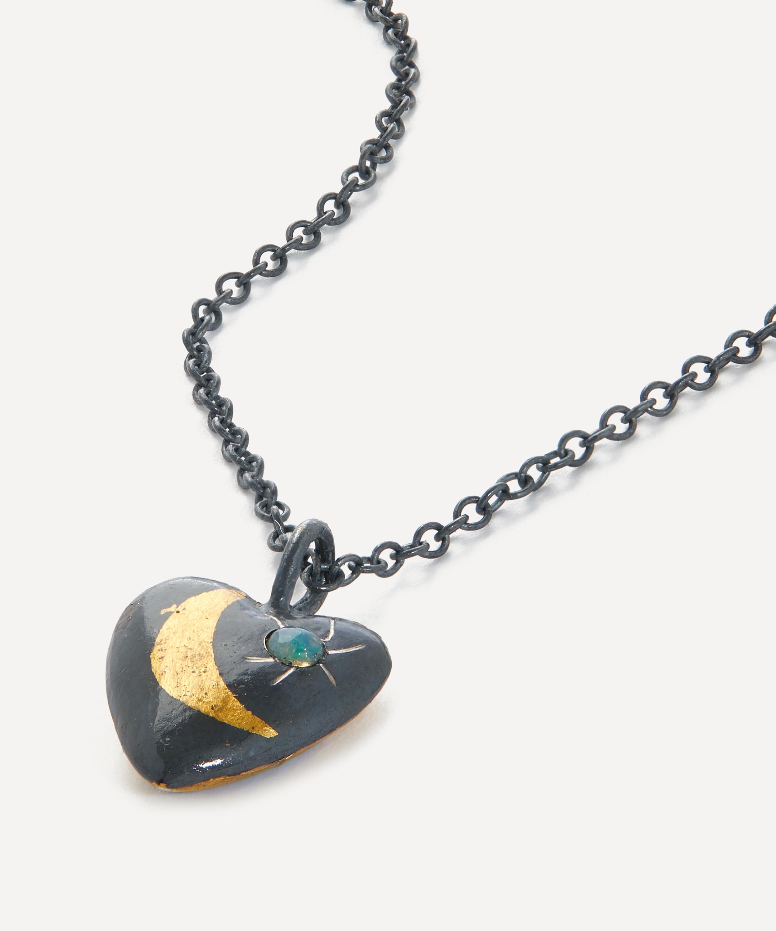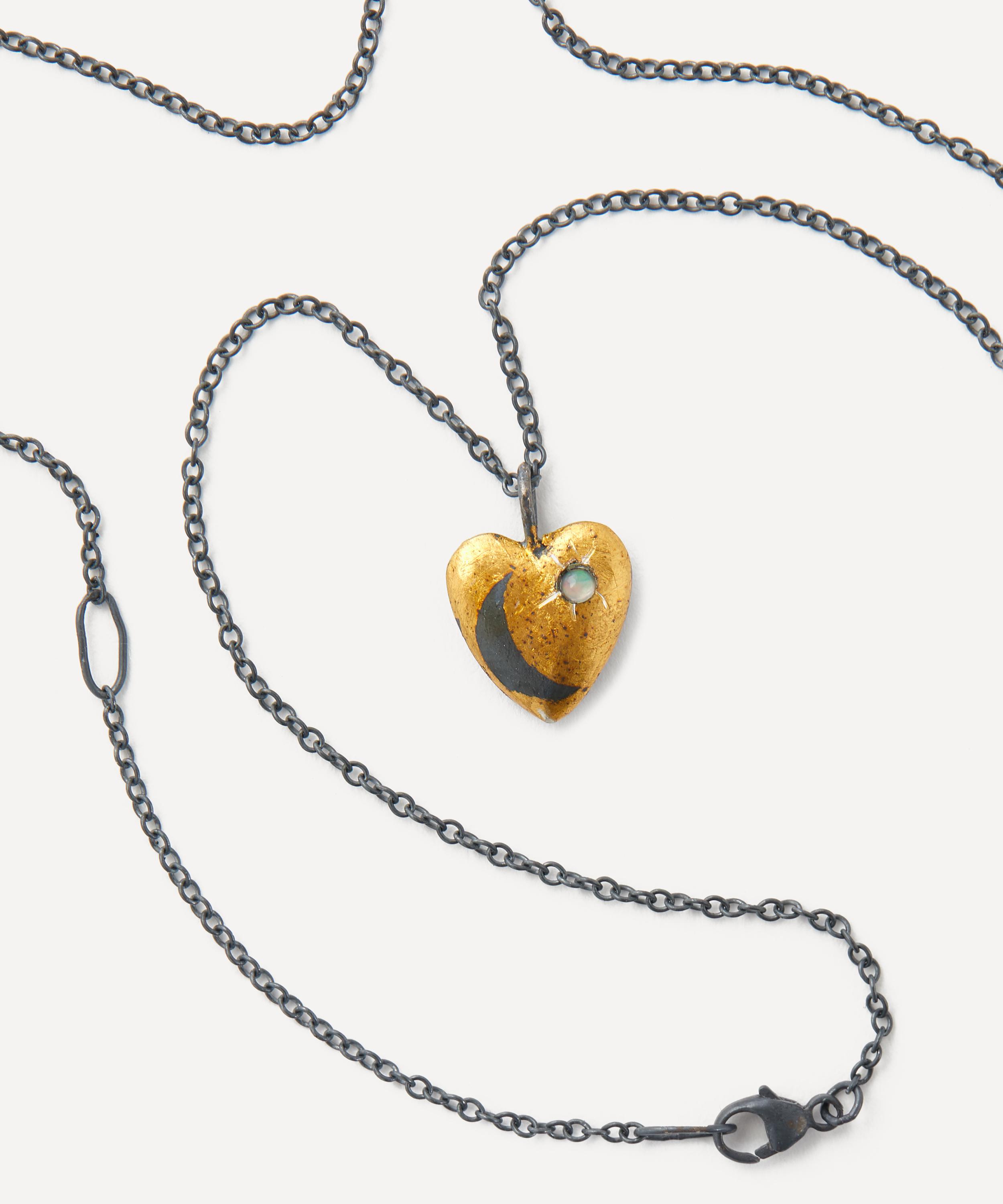 24ct Gold and Oxidised Silver Heart Opal Crescent Pendant Necklace