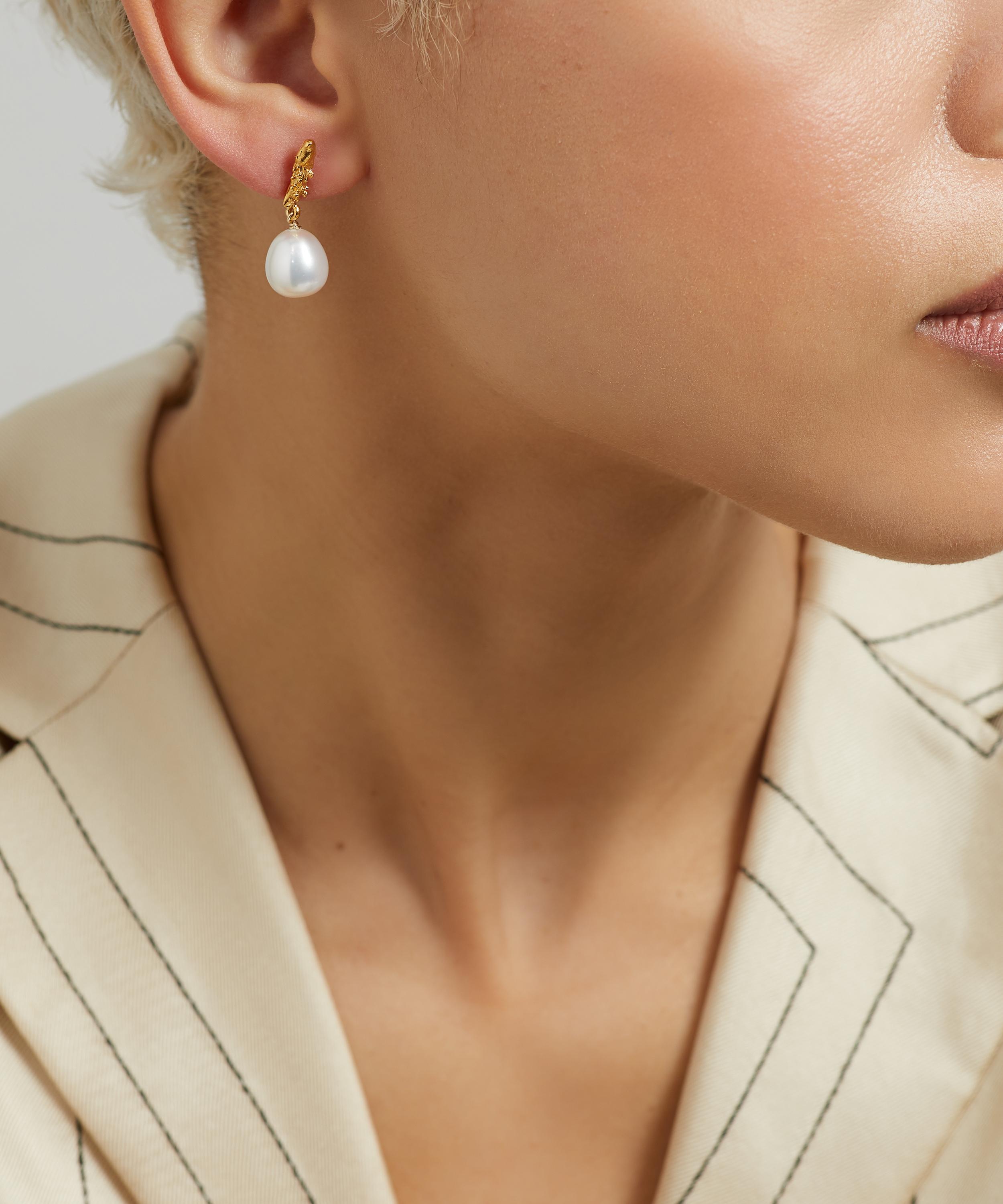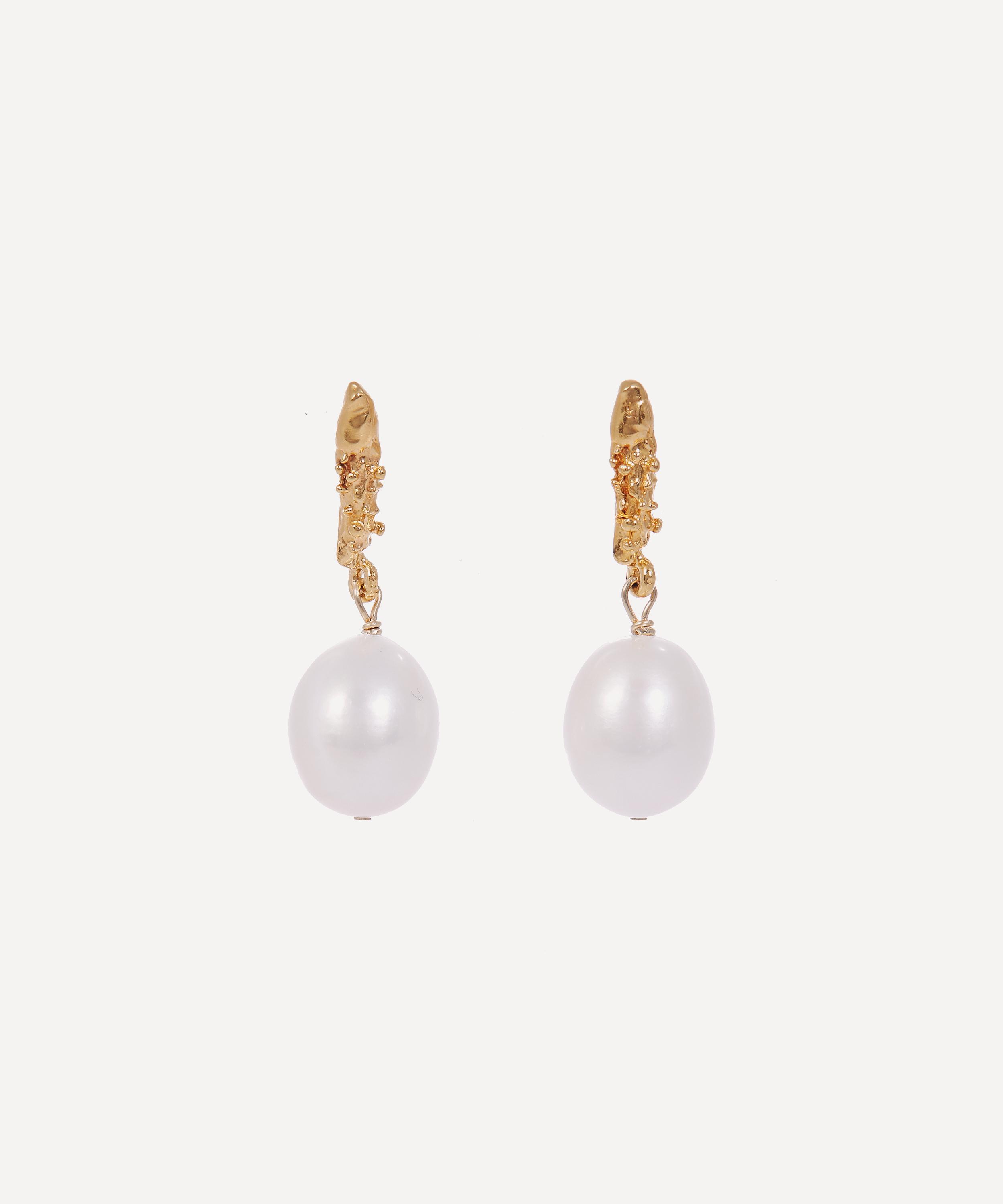 Drawing inspiration from love stories in which unfold and change over time, this collection showcases a handful of spiritual designs that celebrate the beauty of human imperfection. Featuring the brands signature 24 carat gold-plating, each earring is composed of a textured stud and a unique freshwater pearl drop. Stack them with the brand`s gold hoops or wear them on their own for an elegant approach.