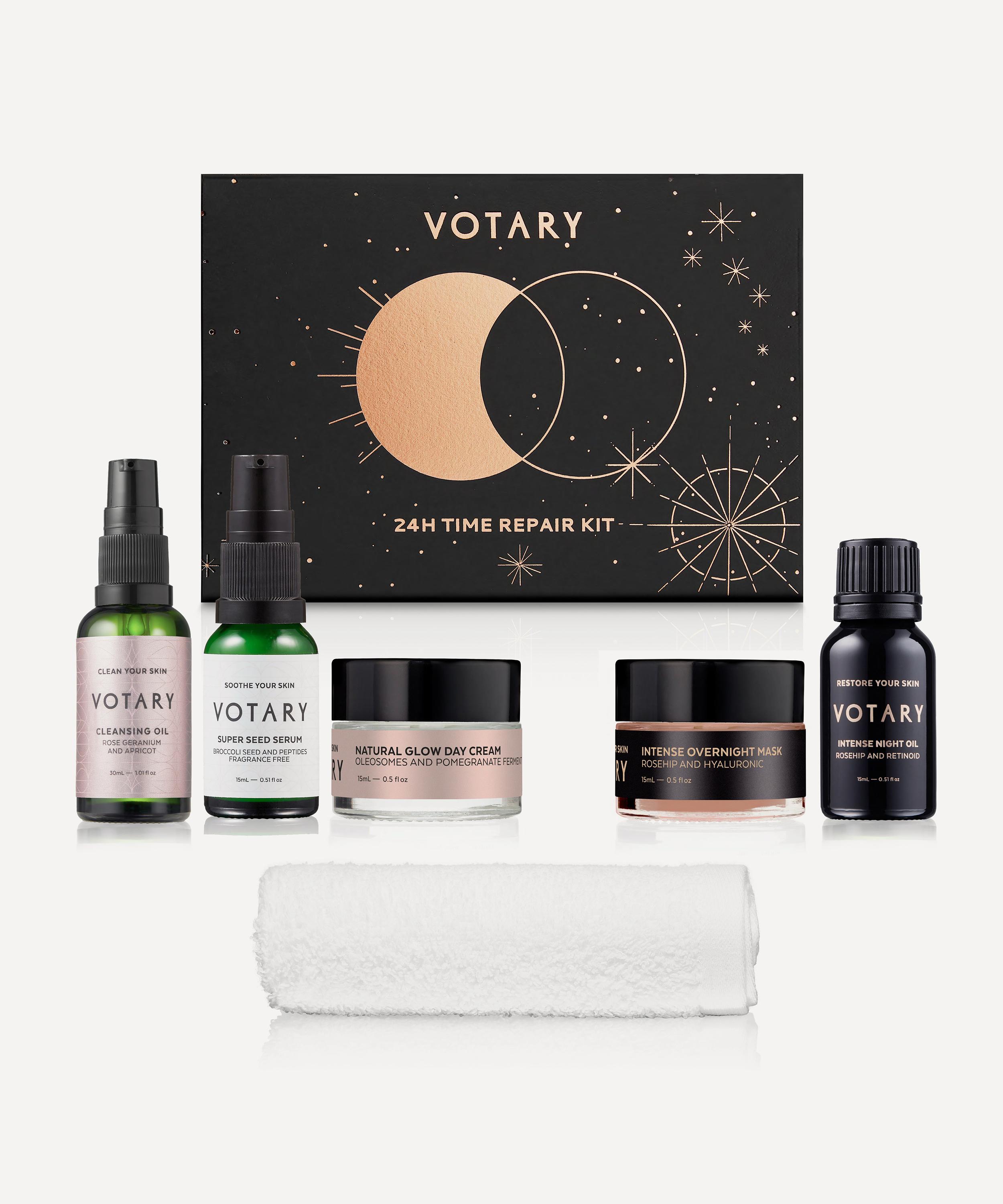 Combat signs of ageing with Votary’s 24hr Time Repair Kit, showcasing five rejuvenating skin care heroes – an elegant, transformative update on your daily regime.