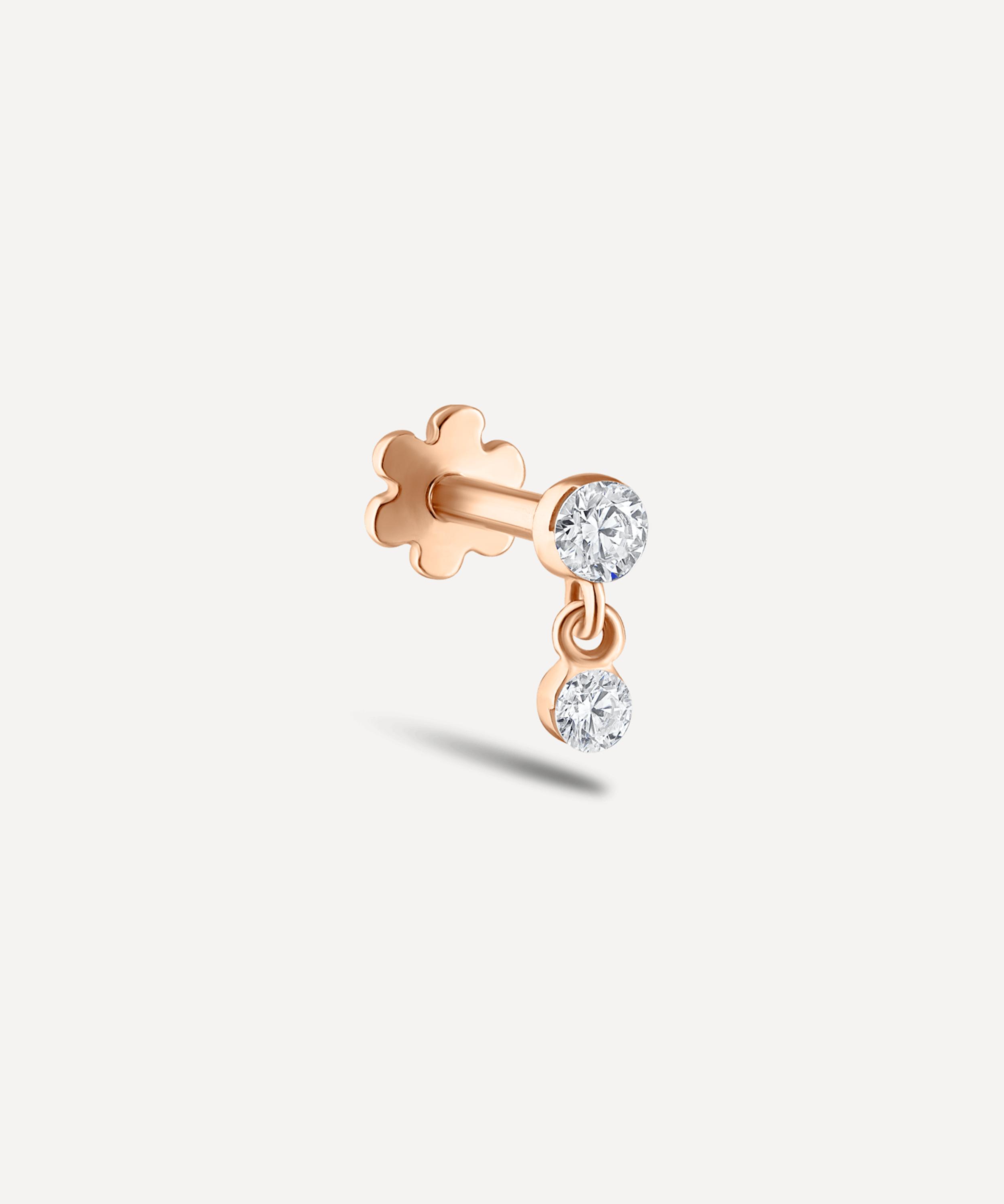 Crafted from high-polished 18 carat rose gold, this single stud earring features a round Hearts and Arrows white diamond with an additional smaller diamond dangling from the base. Both are presented in unique invisible settings that sit flush against the skin, placing sole focus on the light-catching facets of the stones. Complete with the brand's signature flower threaded backing, it styles beautifully in a range of lobe and cartilage piercings - team it with several single diamond studs for a dazzling dewdrop effect.