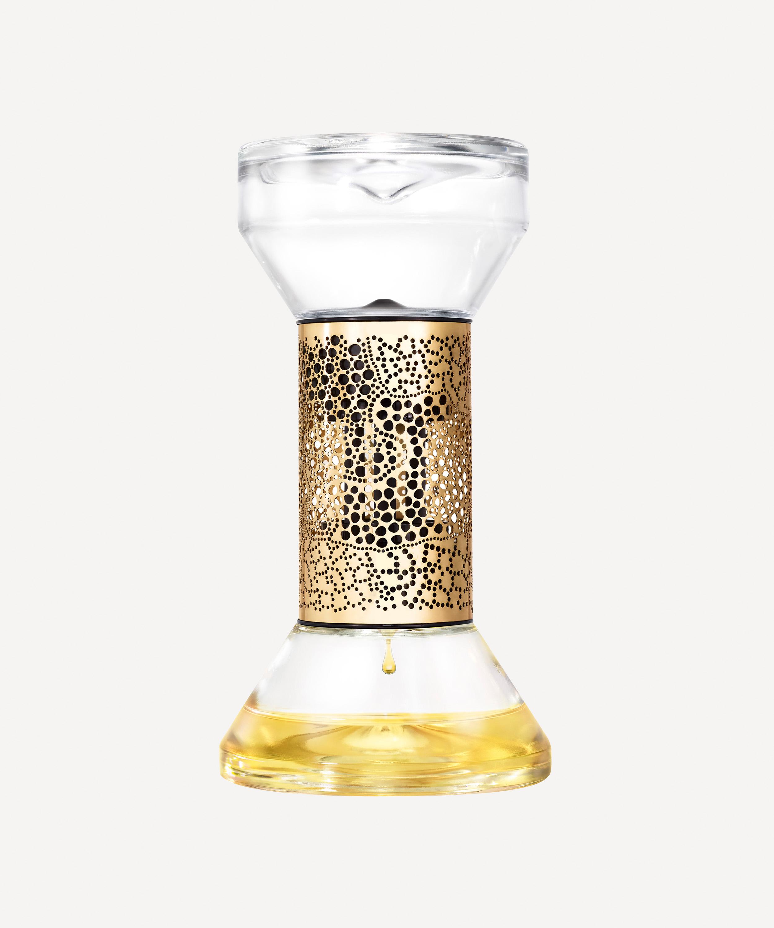 The Diptyque Hourglass Diffuser takes on a beautiful new form, offering not only the same delightful 34 Boulevard Saint Germain aroma but a charming, sculptural design detailed with a polished metal cutwork duct.