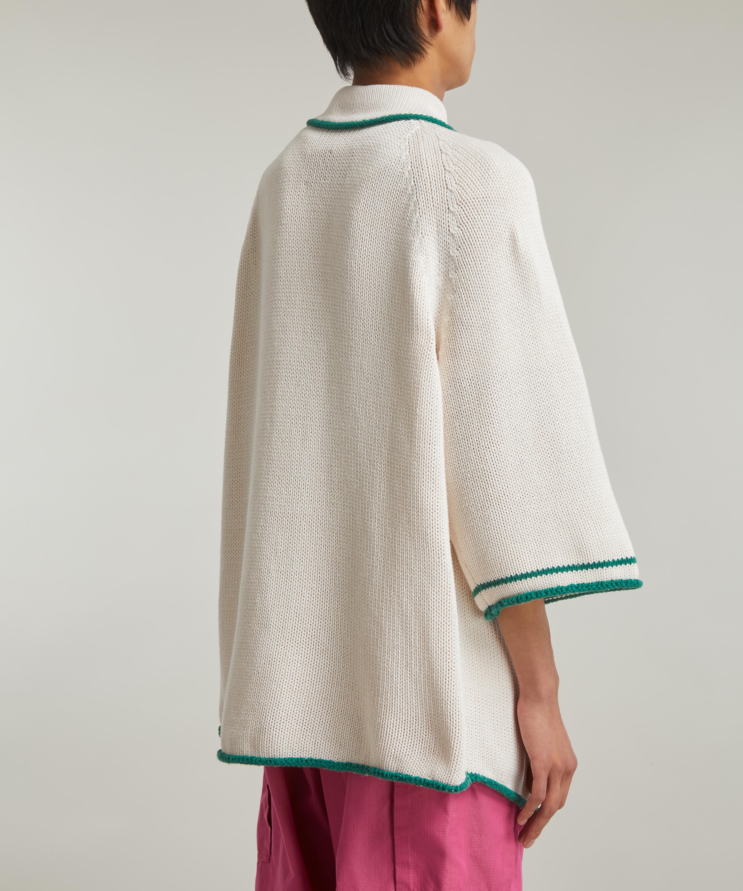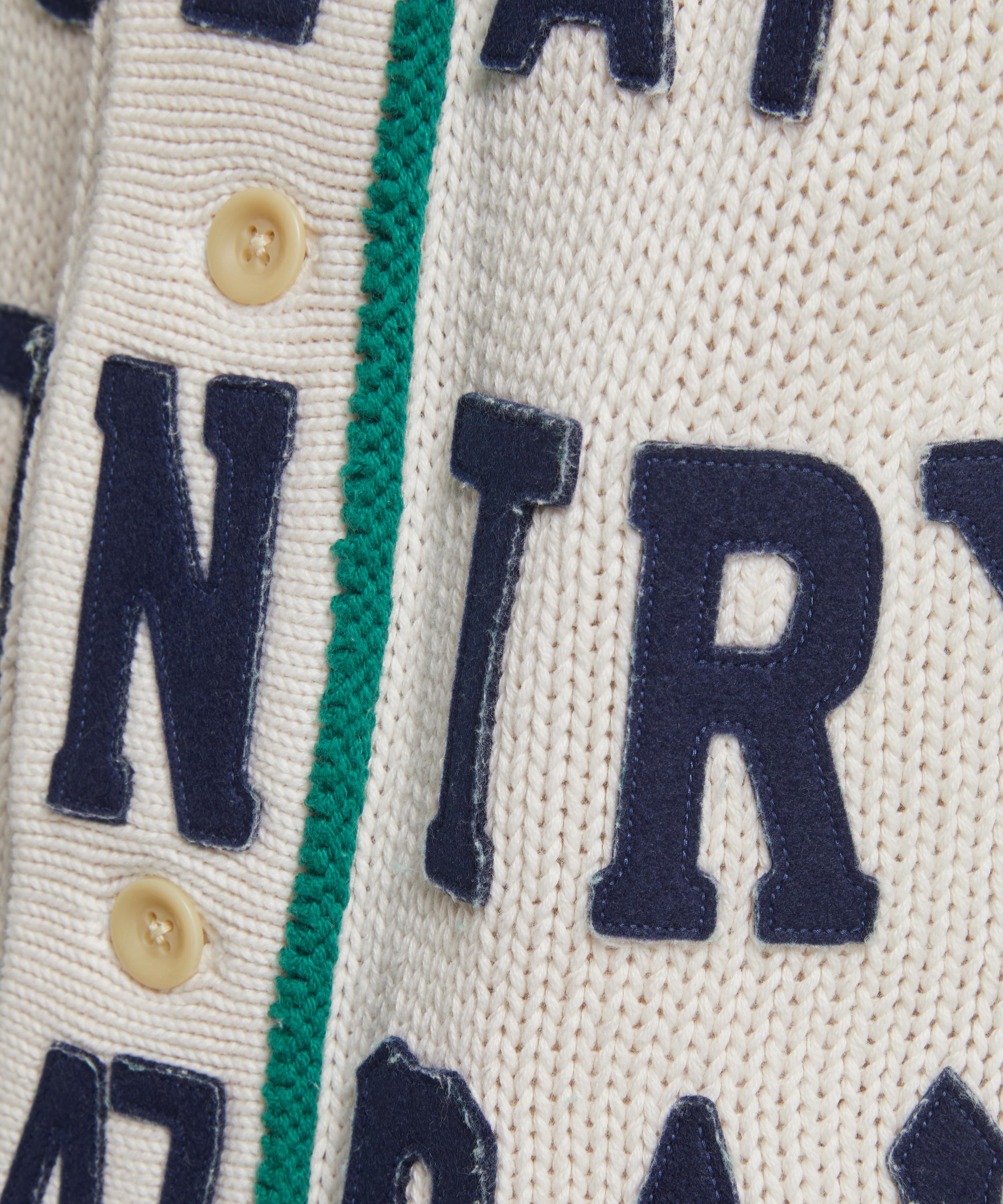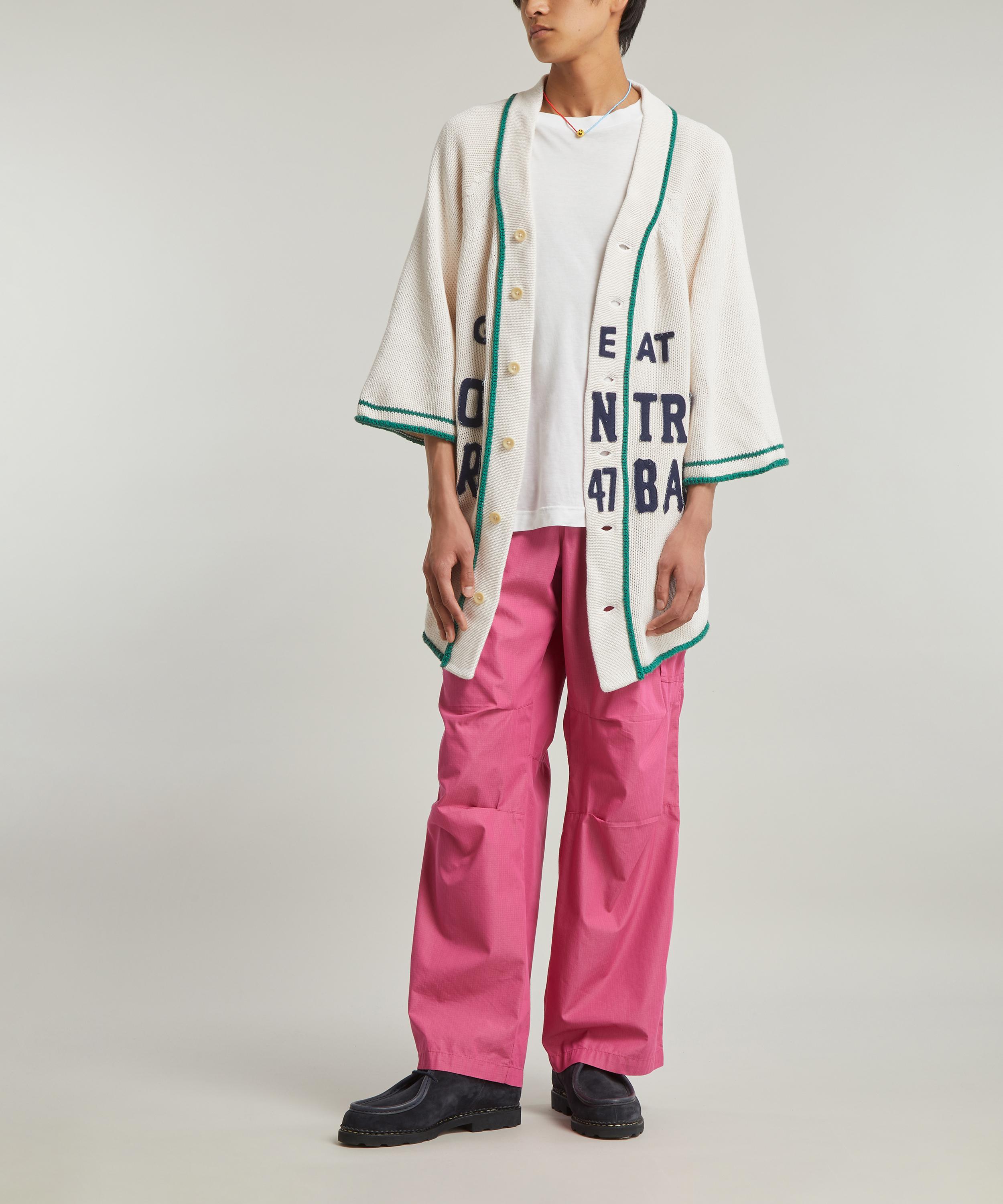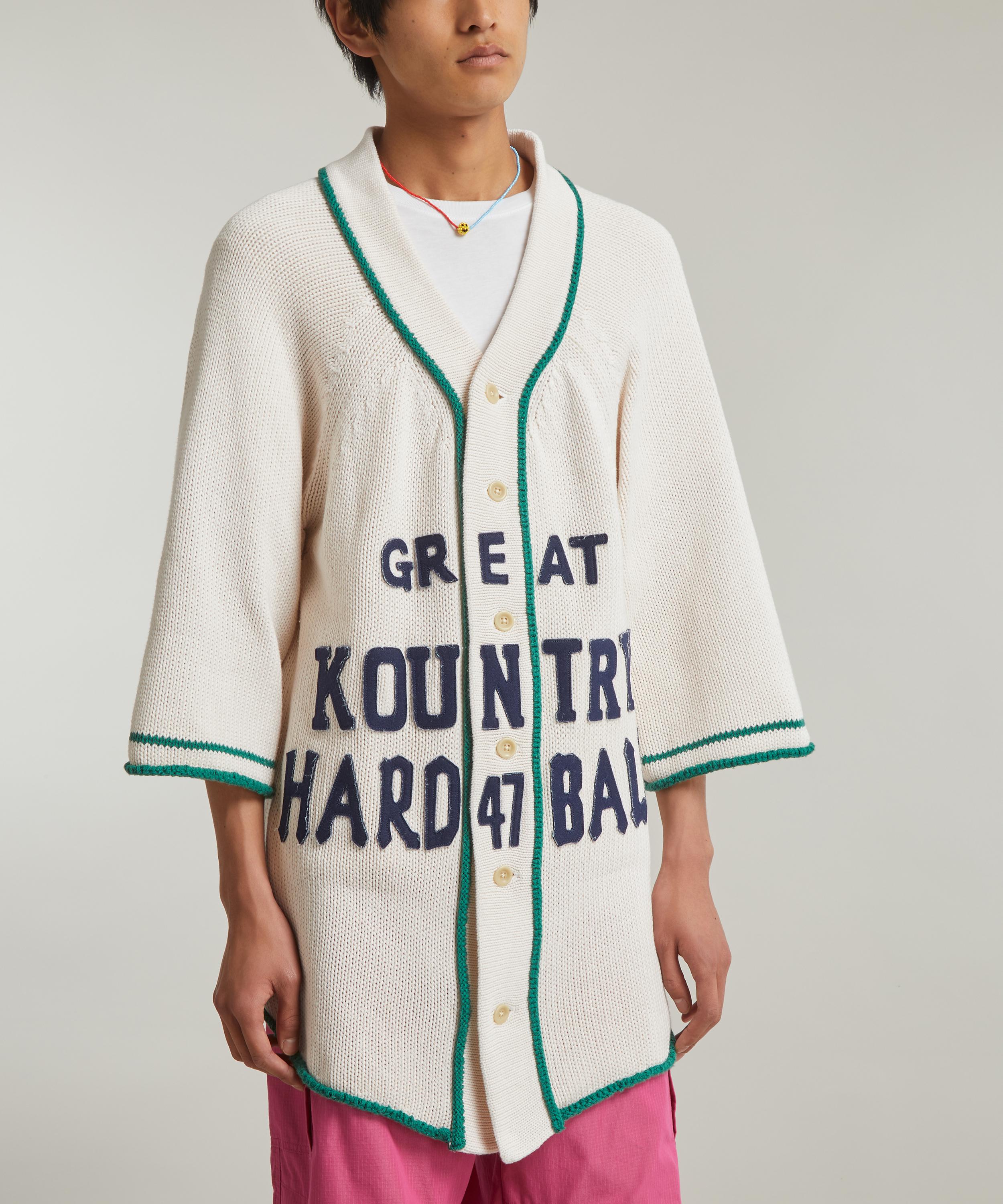 Designed with a modern, streetwear aesthetic, the 3g Cotton Knit Baseball cardigan from cult Japanese label KAPITAL is a is a contemporary take on the classic baseball shirt. Knitted from cotton for an oversized fit with rounded shoulders and mid-length sleeves, this button-up features a baseball collar, green piped trims and applique ‘Great Kountry Hard Ball’ lettering across its front.