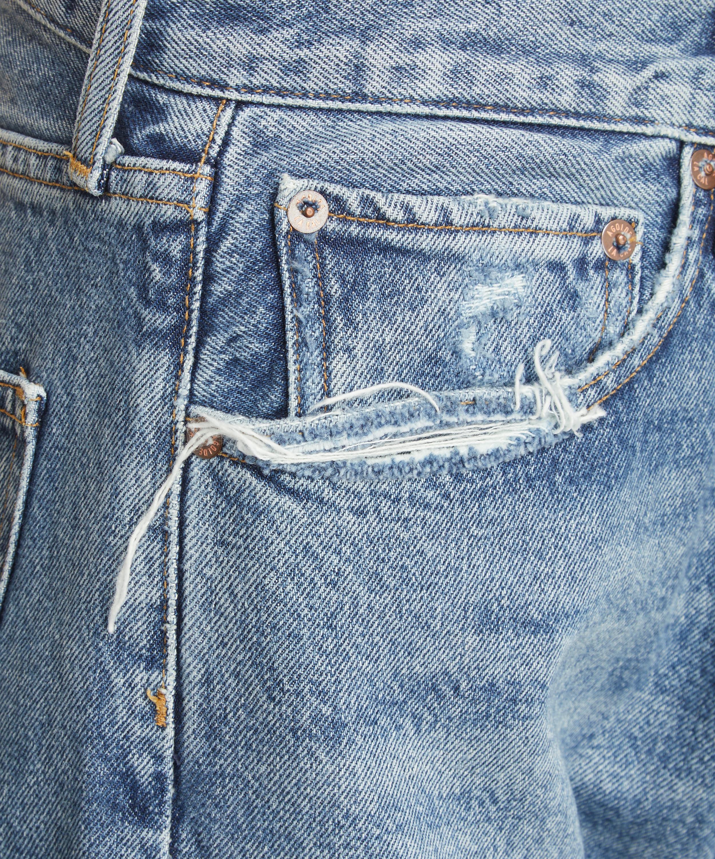 Fusing a flattering high-rise waist with an easy-going, straight leg, these faded blue jeans are cut from rigid cotton in a medium vintage wash complete with distressed hems and whiskering detail for a lived-in look.