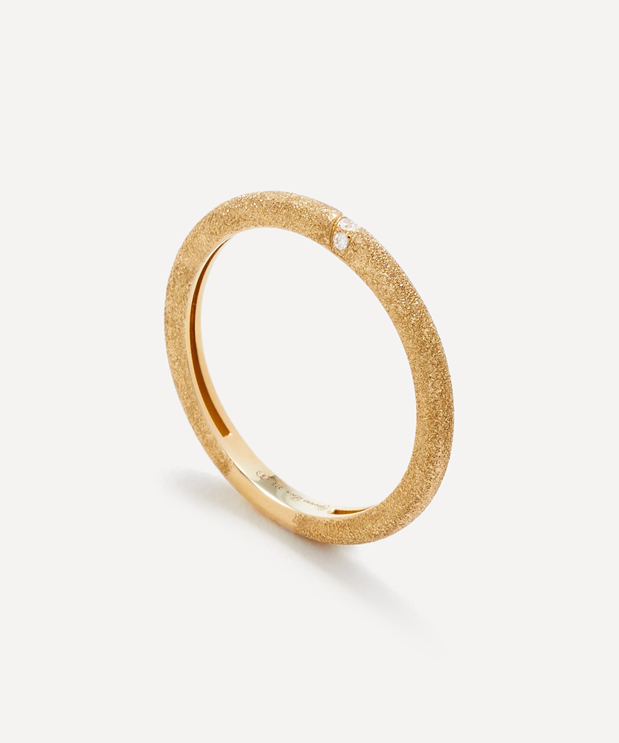 Delve into a world of vintage classics and tie your whole look together with this stacking ring from Yvonne Léon. Crafted from 9ct gold, the designer beautifully unites vintage charm with a modern reinvention in this piece – featuring a textured band embellished with three, tiny diamonds at the centre. Style solo for subtle, minimal elegance, or incorporate it into a ring stack for a more contemporary look.