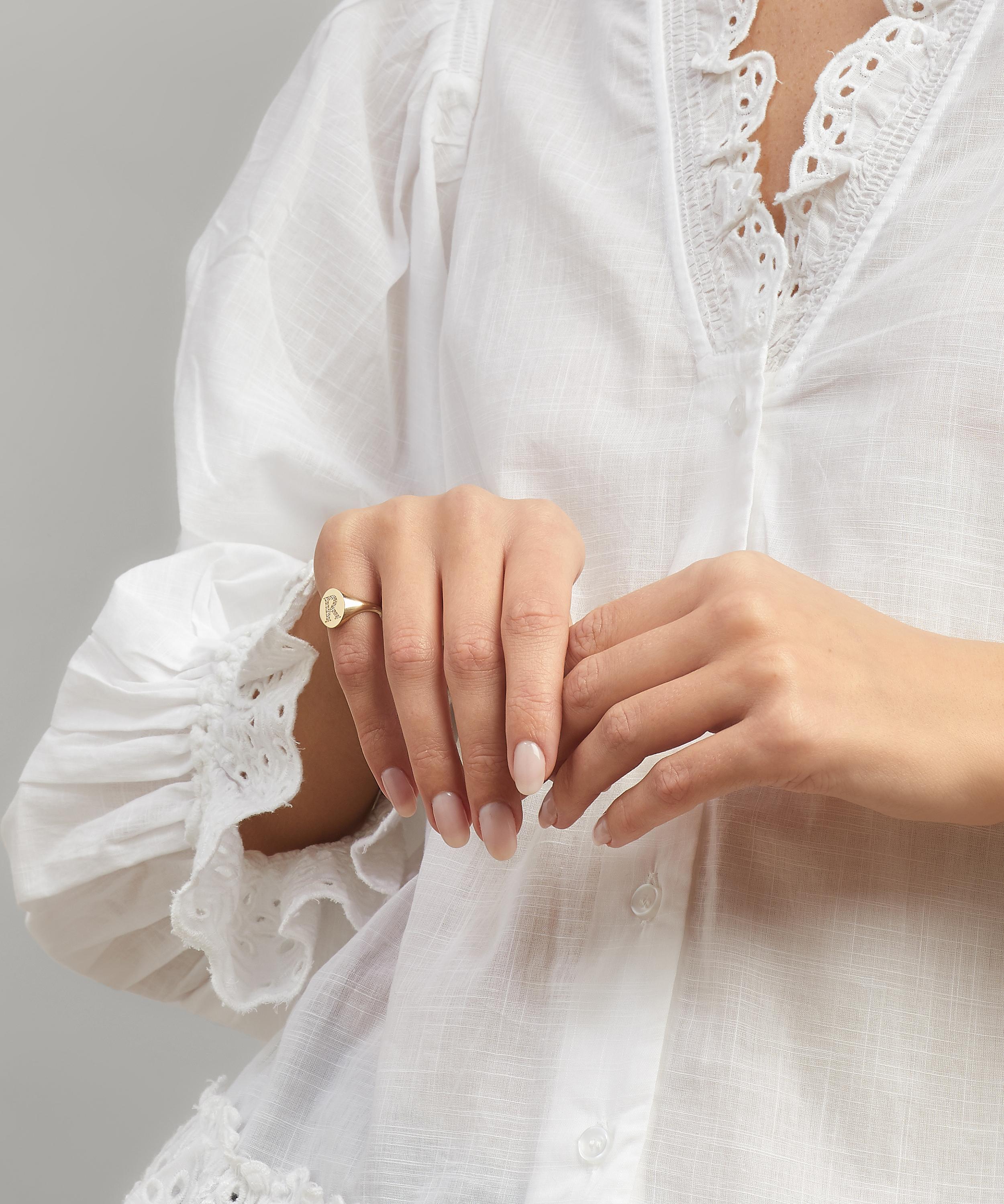 The Liberty signet ring is hand crafted in Italy from 9 carat gold and set with lab-grown diamonds – inspired by our heritage, with a glittering nod to vintage jewellery forms.