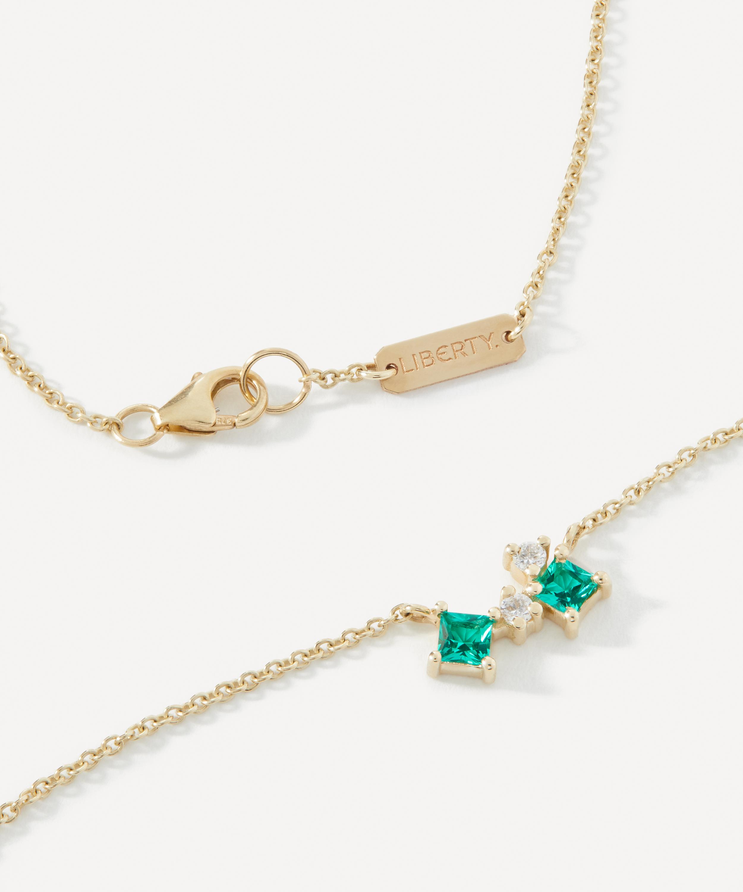 Handmade in Italy from solid 9ct gold, it beautifully unites elegant, classic jewellery aesthetics with a contemporary twist, featuring a fine trace chain adorned with mixed-cut composition of diamonds and emeralds. Perfect for both special occasions and daily elegance, it can be styled as a solo piece, worn as part of a stack, or paired with the Dafne Diamond and Emerald Ring.
