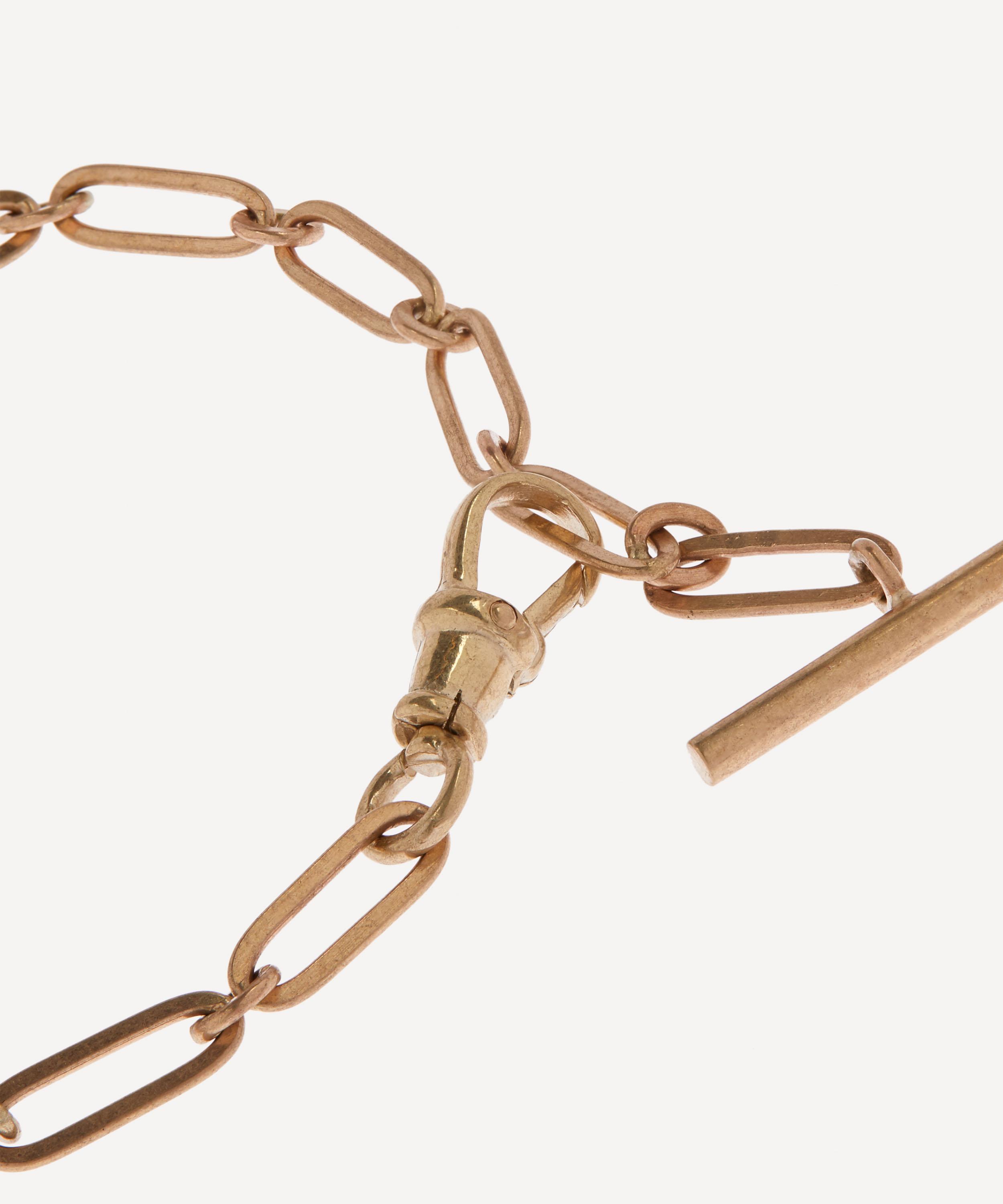 Crafted from solid 9 carat gold, this bracelet is characterised by a round and rectangular link chain with a carabiner clip fastening and a classic T-bar toggle charm hanging from the end. Complete with an adjustable length for finding the perfect fit, the minimal design is perfect for wearing alone, layering with others or adding a charm of your choice for a look that's tailored to your own personal style.