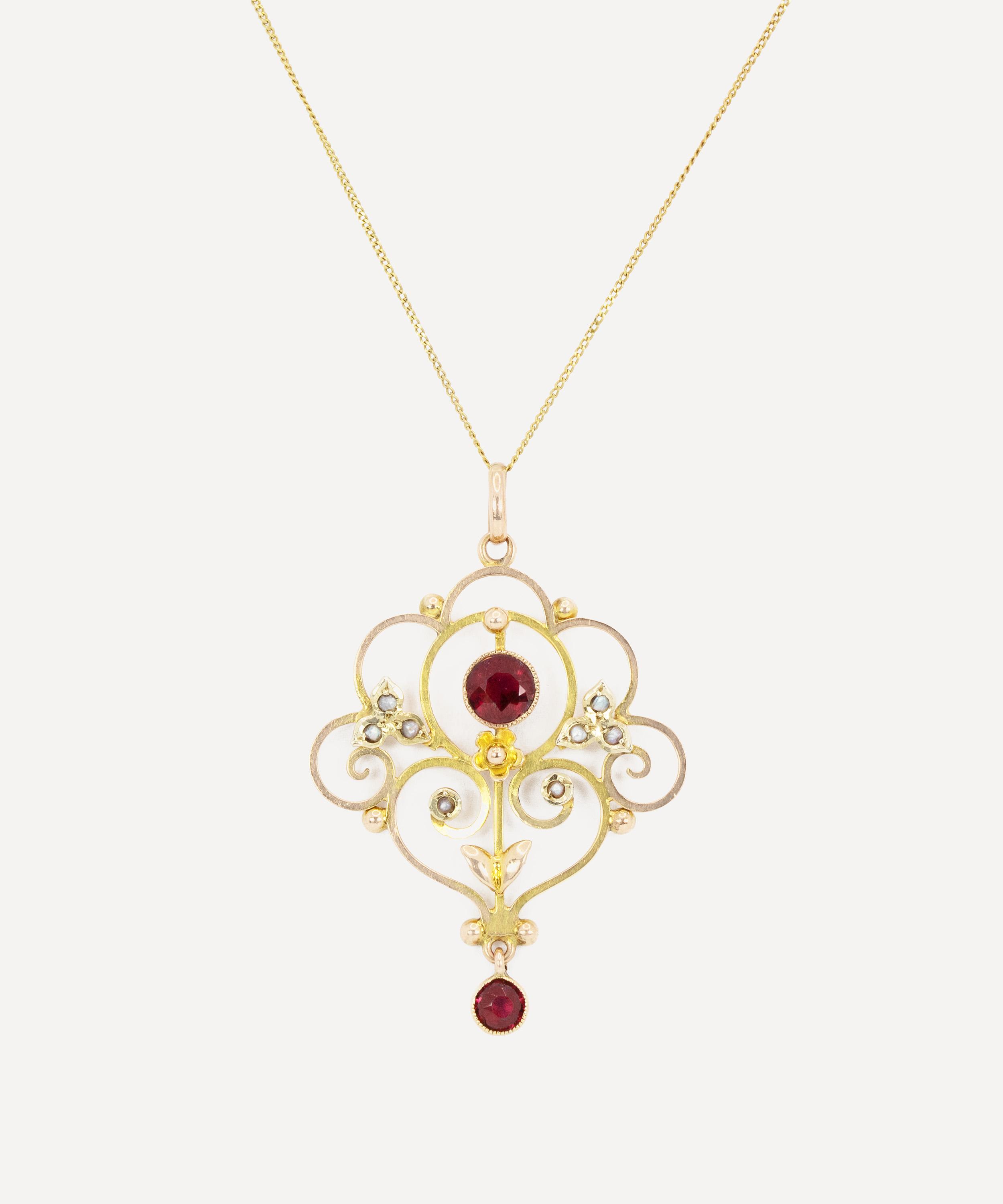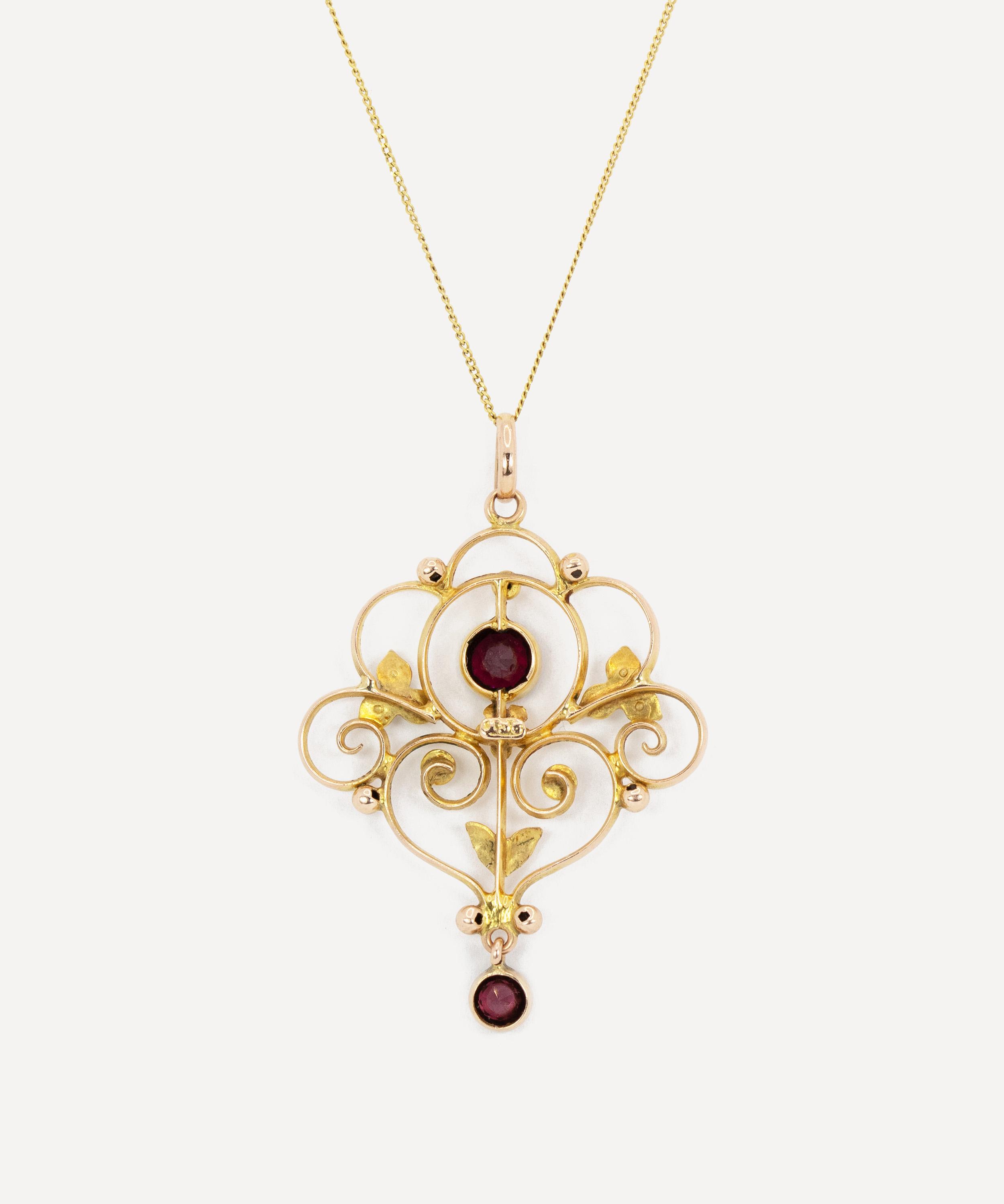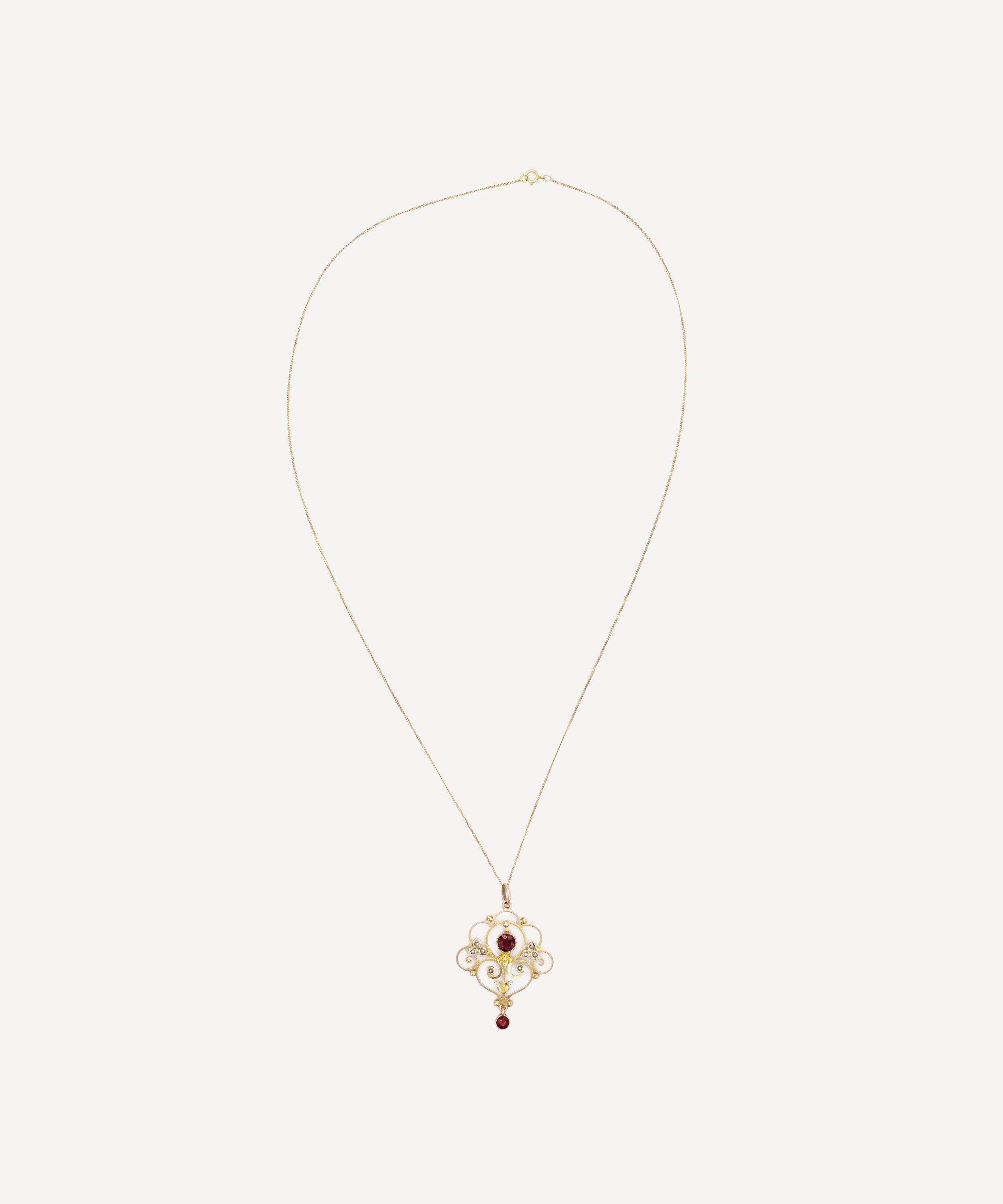 Exuding a light and ethereal feel, this antique pendant necklace from Kojis boasts a perfect example of Edwardian jewellery. Crafted from 9ct gold, it features delicate open metalwork in a foliate design – eponymous of the era. The pendant is decorated with multiple round seed pearls and a central round cut garnet stone, bezel set with milgraine detailing. An additional round garnet hangs like a drop below the pendant. The necklace is finished with an articulated bail and modern figaro chain.