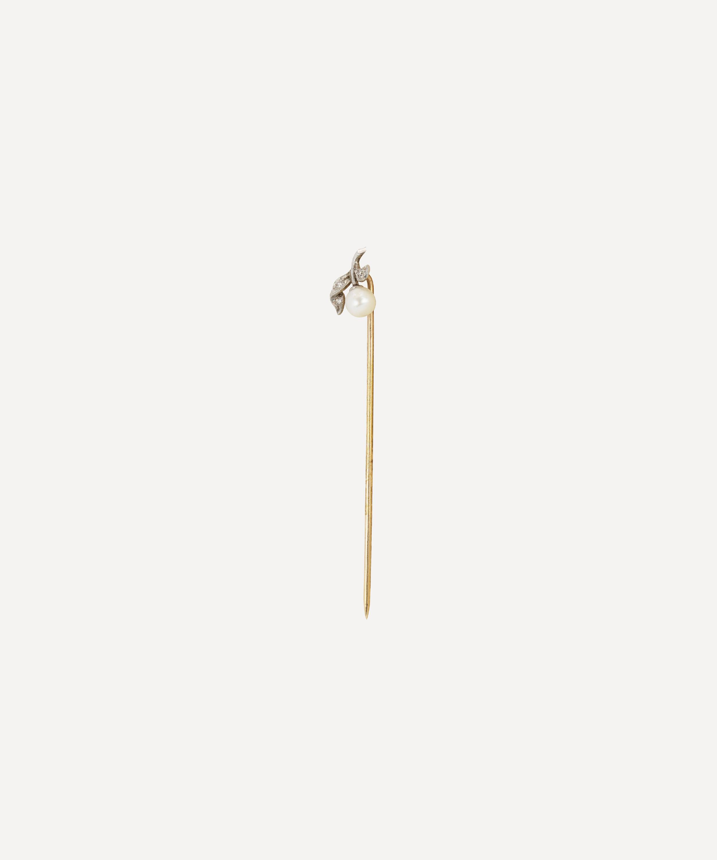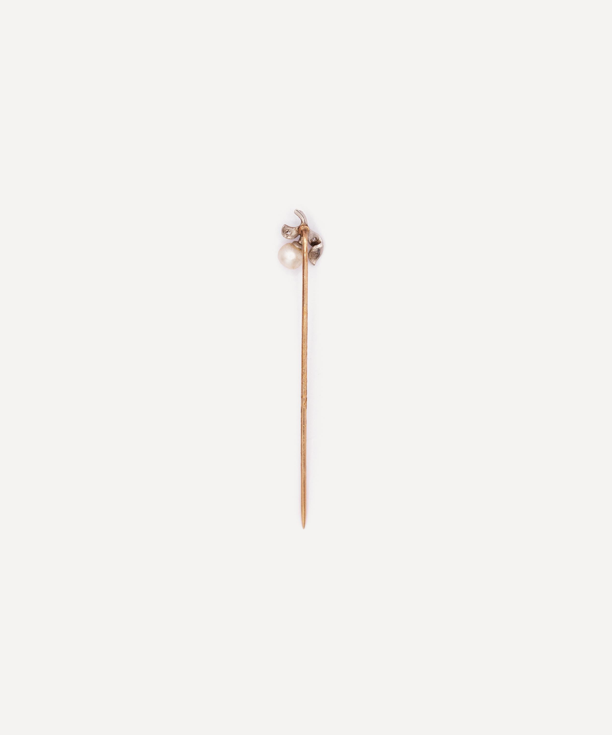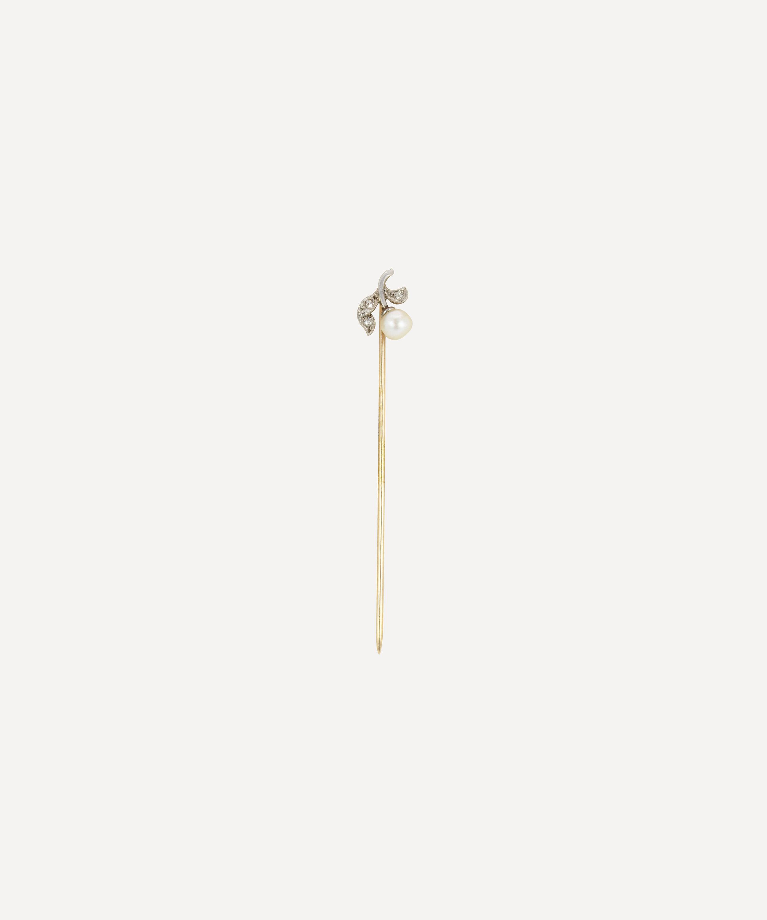 This stick pin from Kojis is a beautiful and unique piece dating back to the Edwardian era. Crafted from 9ct gold, its simple design stands out with a white pearl berry, with a platinum stalk and two leaves, each adorned with three old cut diamonds. Attach it to the lapels of your favourite blazer for a maximalist take on traditional formalwear.