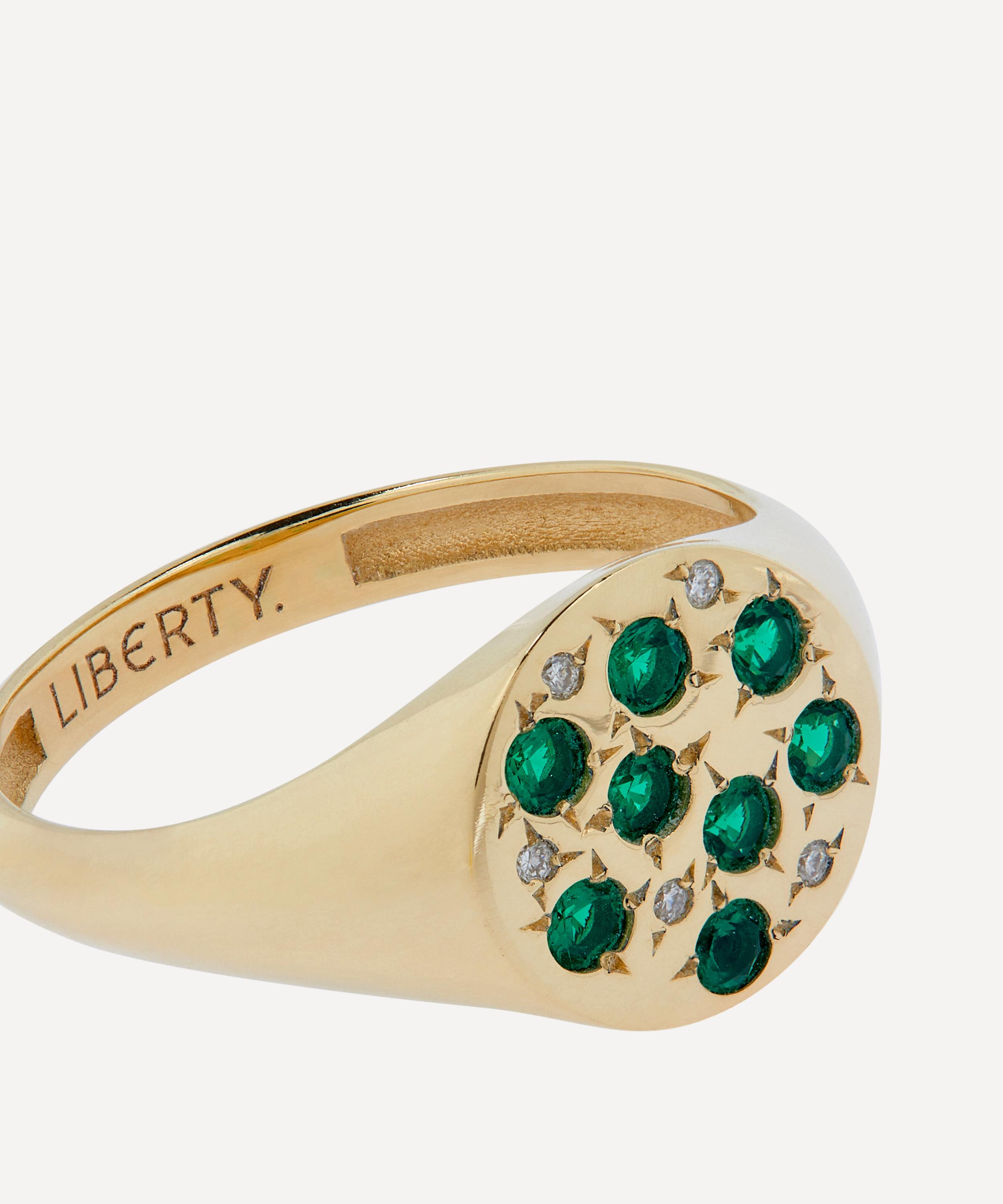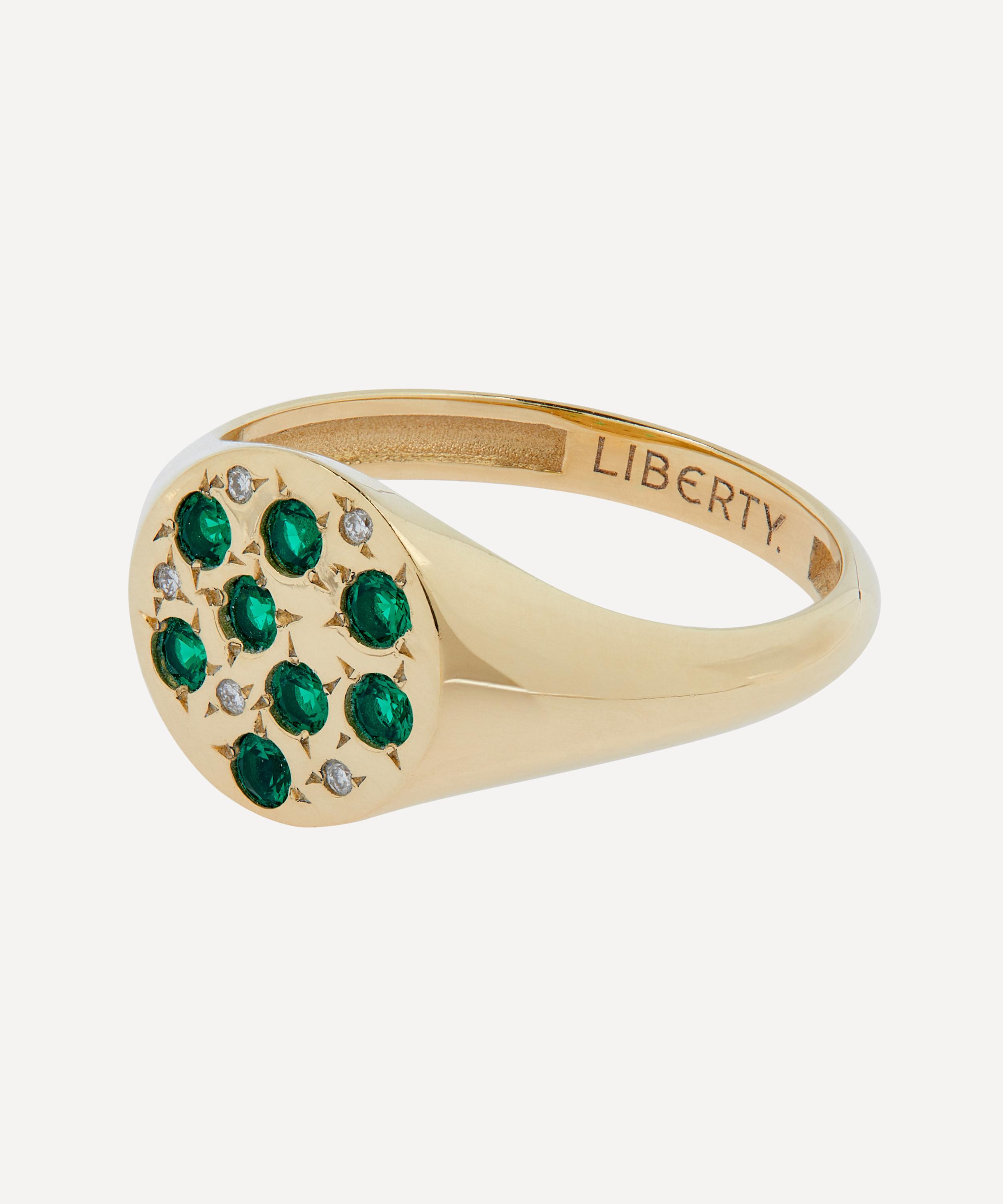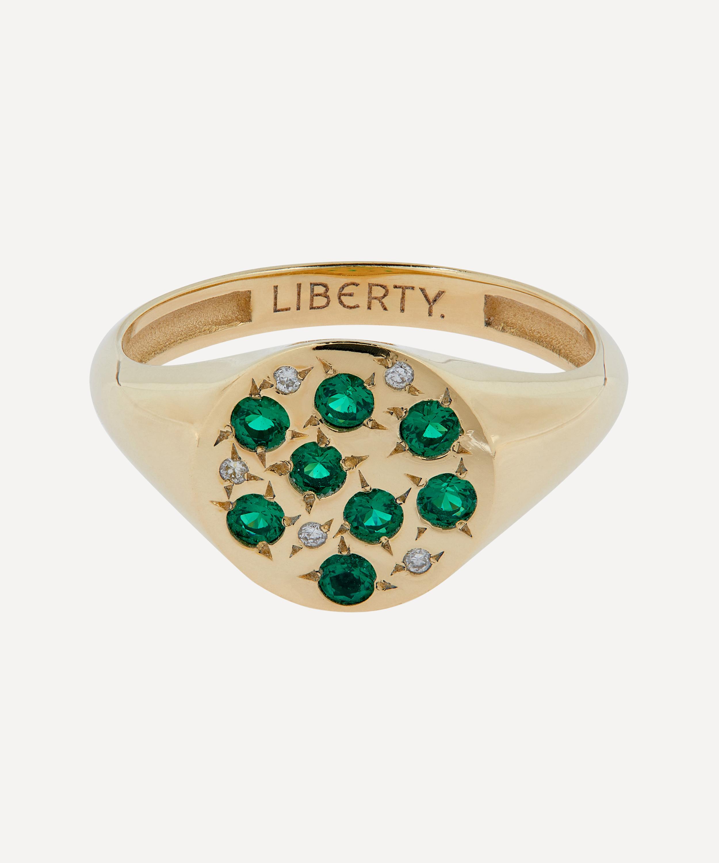 A modern heirloom that pays tribute to Liberty’s collector spirit, this statement Equinox signet ring is complete with lab-grown tsavorite stones.