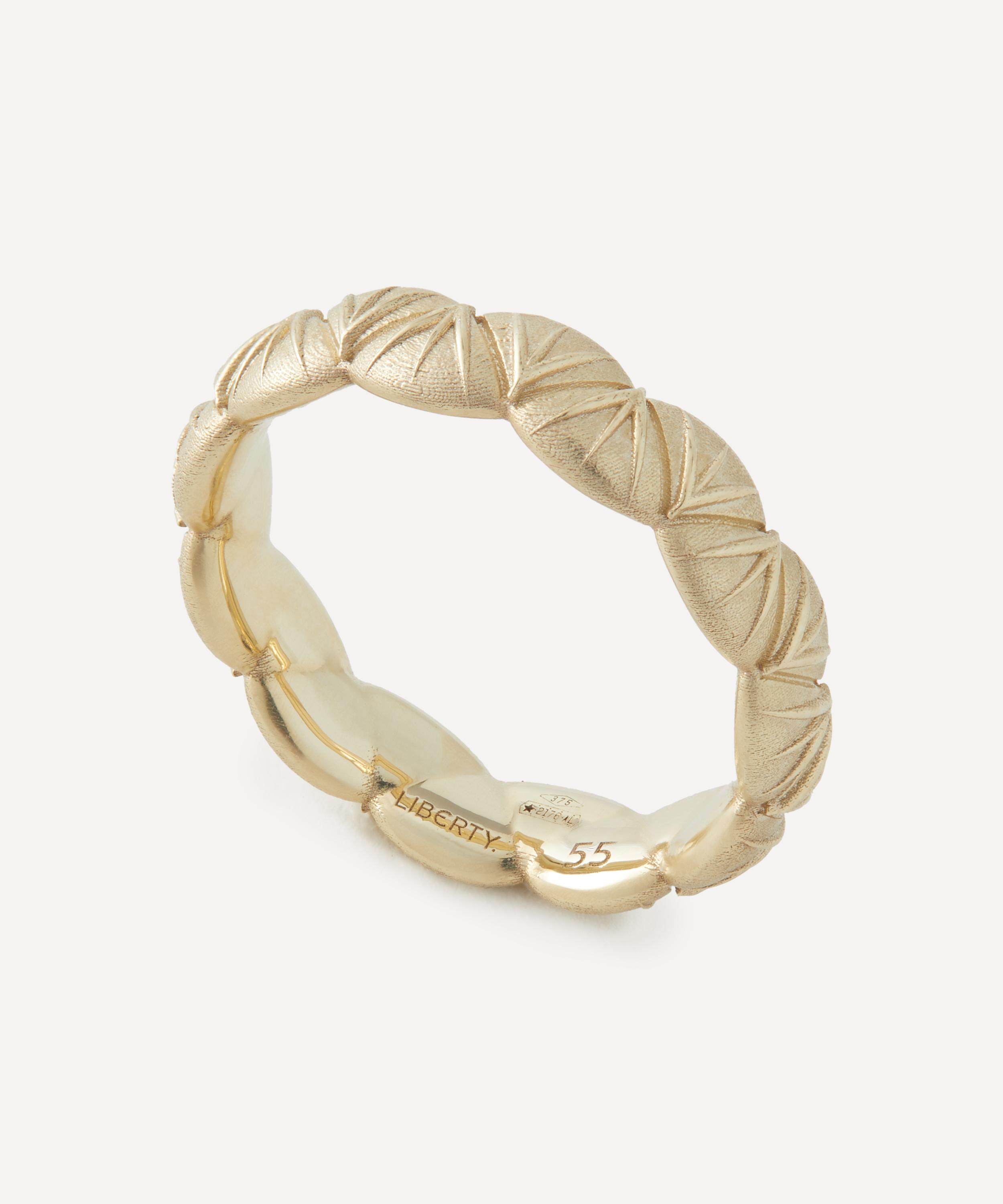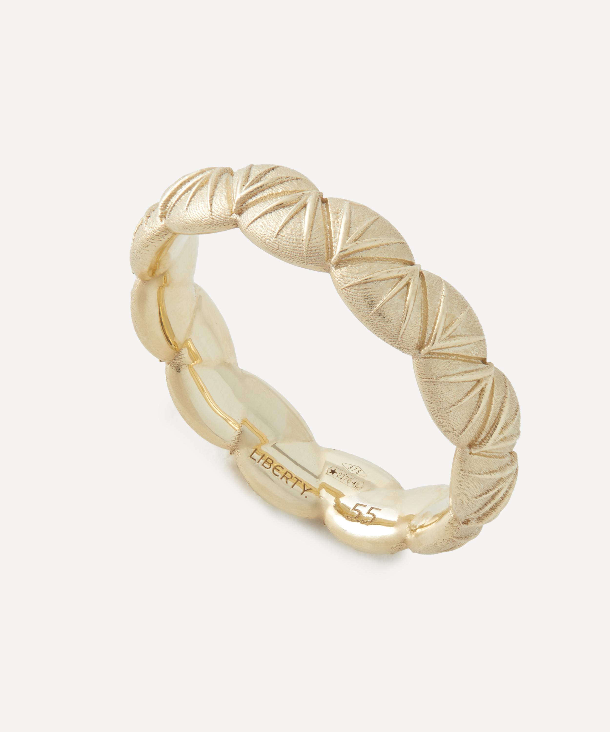 Crafted from 9ct gold, it’s meticulously fashioned to emulate our Fanfare print – a sophisticated geometric pattern featuring a scalloped arrangement of Asian-style fan motifs. Boasting an elegant modern heirloom that pays tribute to Liberty’s collector spirit, style it solo, mix and match with other rings from your own collection, or try stacking it with the 9ct white gold version for an eye-catching, two-tone look.
