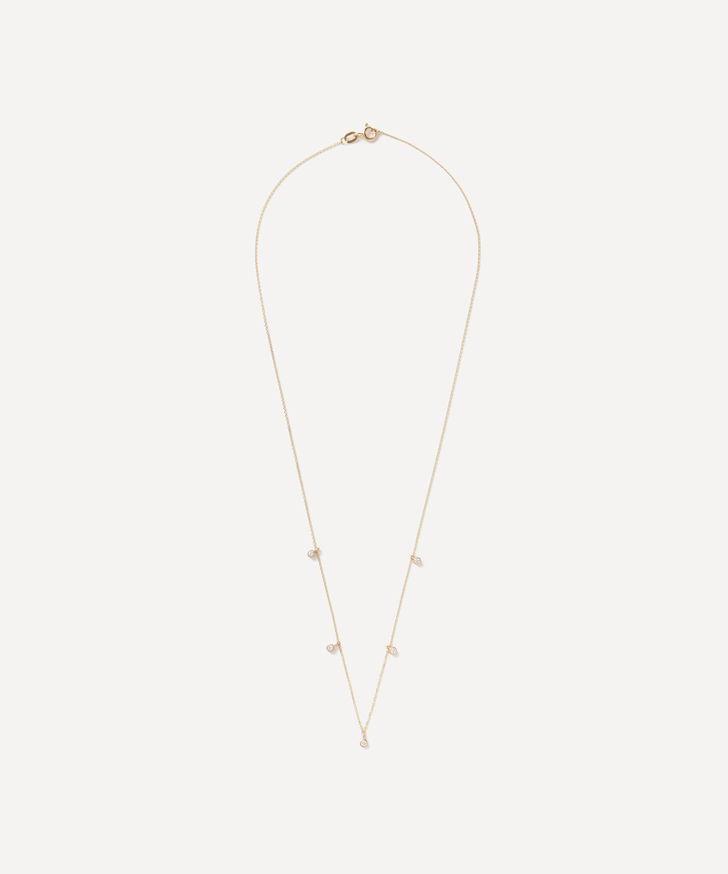 Elevate everyday looks with this sparkling station necklace from AURUM + GREY. Crafted from 9ct gold, it’s characterised by a fine trace chain adorned with five bezel set diamonds – perfect for layering, pair it with additional chains, or wear it on its own for a minimalistic approach.
